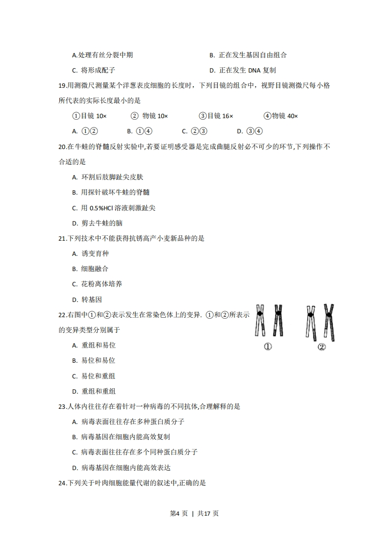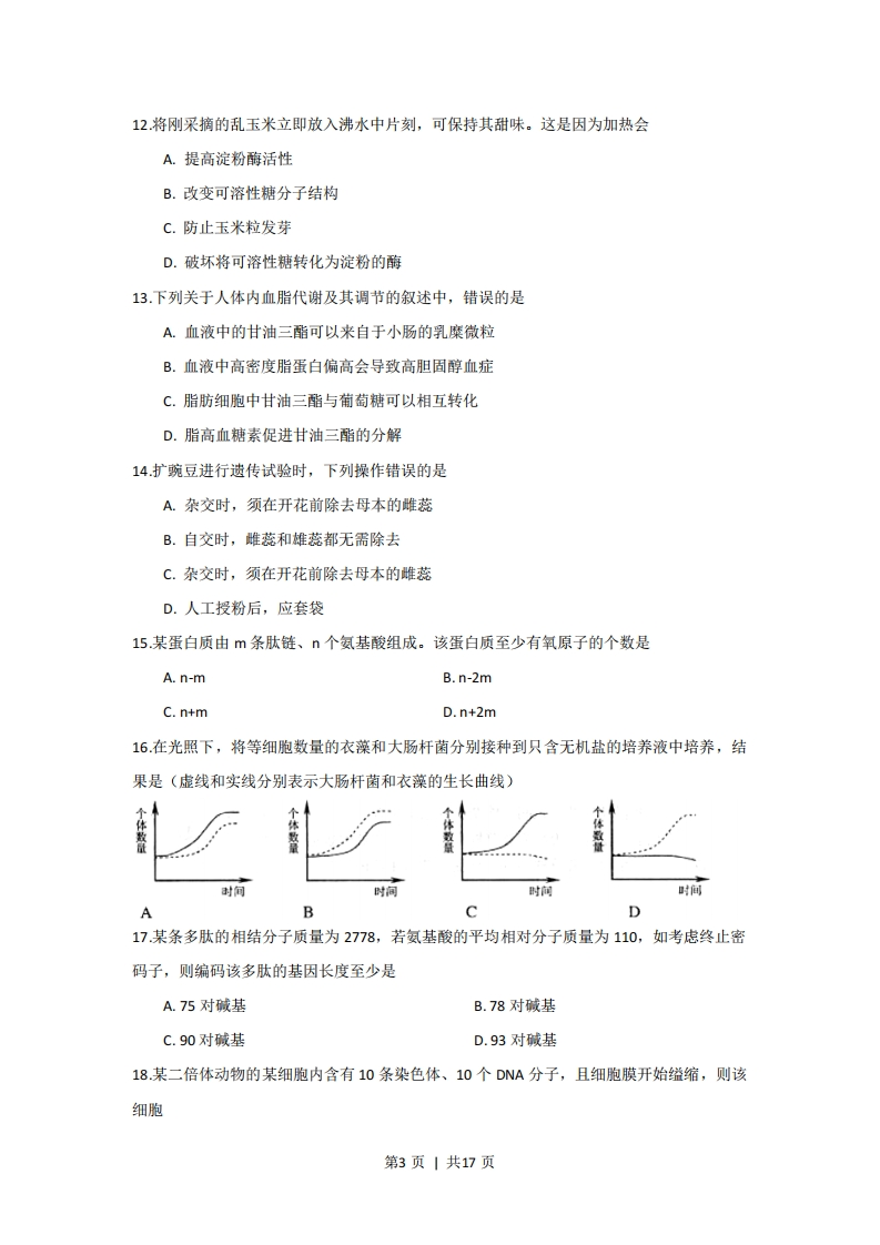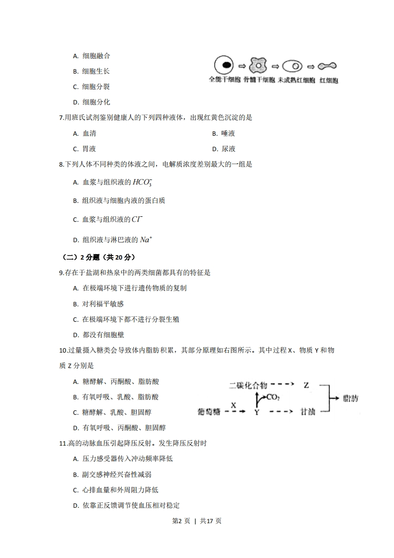 2009年全国普通高等学校招生统一考试上海生物试卷考生注意:1.满分150分。考试时间为120分钟。2.答第1卷前,考生务必在答题卡上用钢笔或圆珠笔清楚切写姓名、准考证号、校验码,并用铅笔正确涂写准考证号和校验码。3.第〡卷由机器阅卷,答案必须全部涂写在答题纷上。考生应将代表正确答案的小方格用铅笔涂黑。注意试题题号和答题纸编号一一对应,不能错位。答题需要更改时,必须将原选项用橡皮擦去,在新选择。答案不能写在试卷上,写在试卷上一律不给分。第I卷(共60分)一、单选题(共60分。每小题只有一个正确选项)(1)1分题(共8题)1.下列有机化合物中,只含有C、H、O三种元素的是A.氨基酸B.核苷酸C.脱氧核糖D.磷脂2.下列疾病中,由病毒引起的是A.白化病B.炭疽病C.结核病D.狂犬病3.新物种形成的标志是A.具有新的生理功能B.出现新的形态结构C.出现地理隔离D.形成生殖隔离4.基因型为AaBBccDD的二倍体生物,可产生不同基因型的配子种类数是A.2B.4C.8D.165.下列关于真核细胞结构和功能叙述中,错误的是A.抑制线粒体的功能会影响主动运输B.核糖体由RNA和蛋白质构成C.有分泌功能的细胞才有高尔基体D.溶酶体可消化细胞器碎片6.右图所示的细胞类型转换过程为第1页|共17页A.细胞融合B.细胞生长(月-闷⊙∞全能干细胞丹髓干细胞未成熟红细胞红馏胞C.细胞分裂D.细胞分化7.用班氏试剂鉴别健康人的下列四种液体,出现红黄色沉淀的是A.血清B.唾液C.胃液D.尿液8.下列人体不同种类的体液之间,电解质浓度差别最大的一组是A.血浆与组织液的HCOB.组织液与细胞内液的蛋白质C.血浆与组织液的C”D.组织液与淋巴液的Na(二)2分题(共20分)9.存在于盐湖和热泉中的两类细菌都具有的特征是A.在极端环境下进行遗传物质的复制B.对利福平敏感C.在极端环境下都不进行分裂生殖D.都没有细胞壁10过量摄入糖类会导致体内脂肪积累,其部分原理如右图所示。其中过程X、物质Y和物质Z分别是A.糖酵解、丙酮酸、脂肪酸二碳化合物一一一》B.有氧呼吸、乳酸、脂肪酸C0:胎物C.糖酵解、乳酸、胆固醇D.有氧呼吸、丙酮酸、胆固醇11.高的动脉血压引起降压反射。发生降压反射时A.压力感受器传入冲动频率降低B.副交感神经兴奋性减弱C.心排血量和外周阻力降低D.依靠正反馈调节使血压相对稳定第2页|共17页12将刚采摘的乱玉米立即放入沸水中片刻,可保持其甜味。这是因为加热会A.提高淀粉酶活性B.改变可溶性糖分子结构C.防止玉米粒发芽D.破坏将可溶性糖转化为淀粉的酶13.下列关于人体内血脂代谢及其调节的叙述中,错误的是A.血液中的甘油三酯可以来自于小肠的乳糜微粒B.血液中高密度脂蛋白偏高会导致高胆固醇血症C.脂肪细胞中甘油三酯与葡萄糖可以相互转化D.脂高血糖素促进甘油三酯的分解14.扩豌豆进行遗传试验时,下列操作错误的是A.杂交时,须在开花前除去母本的雌蕊B.自交时,雌蕊和雄蕊都无需除去C.杂交时,须在开花前除去母本的雌蕊D.人工授粉后,应套袋15.某蛋白质由m条肽链、n个氨基酸组成。该蛋白质至少有氧原子的个数是A.n-mB.n-2mC.n+mD.n+2m16.在光照下,将等细胞数量的衣藻和大肠杆菌分别接种到只含无机盐的培养液中培养,结果是(虚线和实线分别表示大肠杆菌和衣藻的生长曲线)个个数量封时间时间时间BCD17.某条多肽的相结分子质量为2778,若氨基酸的平均相对分子质量为110,如考虑终止密码子,则编码该多肽的基因长度至少是A.75对碱基B.78对碱基C.90对碱基D.93对碱基18.某二倍体动物的某细胞内含有10条染色体、10个DNA分子,且细胞膜开始缢缩,则该细胞第3页|共17页