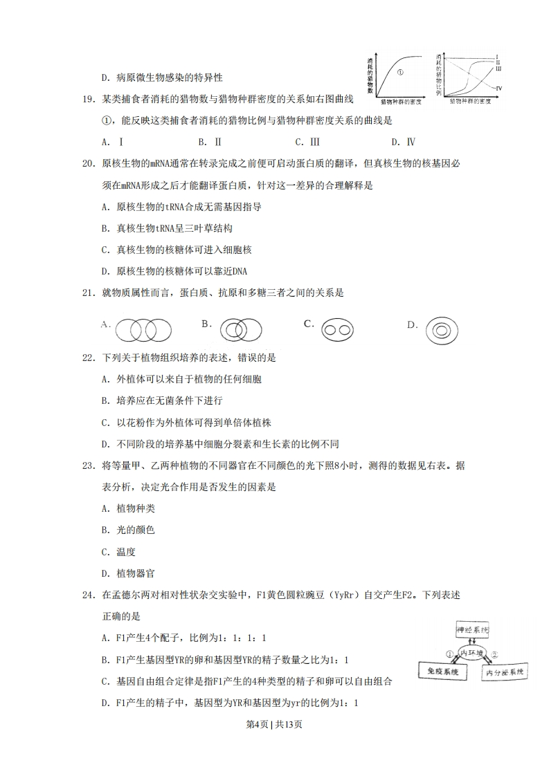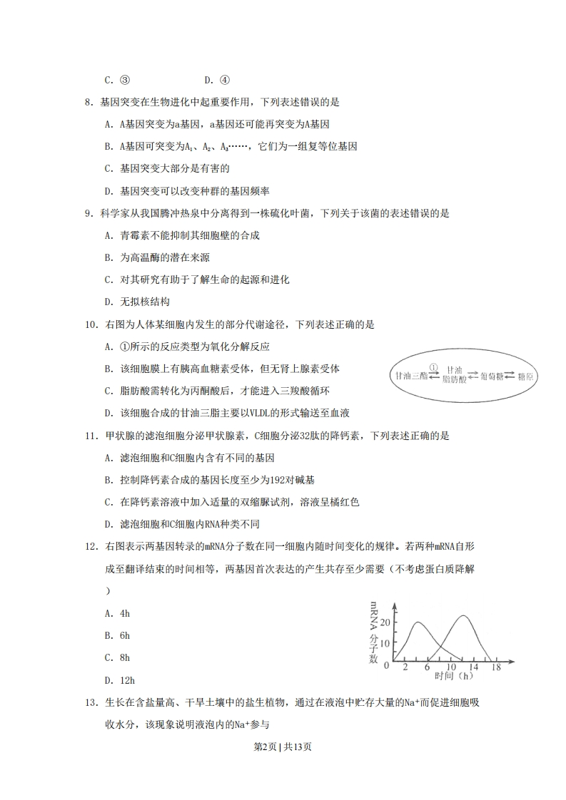 2011年全国普通高等学校招生统一考试上海生物试卷考生注意:1.满分150分。考试时间为120分钟。2.答第1卷前,考生务必在答题卡上用钢笔或圆珠笔清楚切写姓名、准考证号、校验码,并用铅笔正确涂写准考证号和校验码。3.第1卷由机器阅卷,答案必须全部涂写在答题纷上。考生应将代表正确答案的小方格用铅笔涂黑。注意试题题号和答题纸编号一一对应,不能错位。答题需要更改时,必须将原选项用橡皮擦去,在新选择。答案不能写在试卷上,写在试卷上一律不给分。一、单选题(共60分,每小题只有一个正确选项)(一)1分题(共6题)1.下列藻类中属于原核生物的是A.伞藻B.衣藻C.硅藻D.颤藻2.在蝌蚪发育成蛙的过程中,对尾部消失起主要作用的细胞器是A.溶酶体B.中心体C.线粒体D.高尔基体3.有些人乘车时会感到眩晕和恶心。人耳中与此现象相关的身体平衡感受器是A.耳蜗B.前庭器C.鼓膜D.听小骨4.下列细胞中,其呼吸过程会产生乙醇的是A.缺氧条件下的马铃薯块茎细胞B.剧烈运动时的人骨骼肌细胞C.酸奶生产中的乳酸菌D.受涝的植物根细胞5.登革热是由蚊虫叮咬传播的微生物传染病,该病的传播途径属于A.接触传播B.空气传播C.病媒传播D.媒介物传播6.人免疫系统中大量合成并分泌抗体的细胞是A.巨噬细胞B.T淋巴细胞C.致敏T细胞D.浆细胞(二)2分题(共21题)7.右图①一④表示麻醉剂阻断神经冲动传导的可能位置。如果病人有感觉,但手不能动,那么阻断的位置是A.①B.②(1传入神学d第1页1共13页传出神经C.③D.④8.基因突变在生物进化中起重要作用,下列表述错误的是A.A基因突变为a基因,a基因还可能再突变为A基因B.A基因可突变为A、A2、A…,它们为一组复等位基因C.基因突变大部分是有害的D.基因突变可以改变种群的基因频率9.科学家从我国腾冲热泉中分离得到一株硫化叶菌,下列关于该菌的表述错误的是A.青霉素不能抑制其细胞壁的合成B.为高温酶的潜在来源C.对其研究有助于了解生命的起源和进化D.无拟核结构10.右图为人体某细胞内发生的部分代谢途径,下列表述正确的是A.①所示的反应类型为氧化分解反应B.该细胞膜上有胰高血糖素受体,但无肾上腺素受体什油三我是流之秘己秘C.脂肪酸需转化为丙酮酸后,才能进入三羧酸循环D.该细胞合成的甘油三脂主要以VLDL的形式输送至血液11.甲状腺的滤泡细胞分泌甲状腺素,C细胞分泌32肽的降钙素,下列表述正确的是A.滤泡细胞和C细胞内含有不同的基因B.控制降钙素合成的基因长度至少为192对碱基C.在降钙素溶液中加入适量的双缩脲试剂,溶液呈橘红色D.滤泡细胞和C细胞内RNA种类不同12.右图表示两基因转录的mRNA分子数在同一细胞内随时间变化的规律。若两种mRNA自形成至翻译结束的时间相等,两基因首次表达的产生共存至少需要(不考虑蛋白质降解)A.4h川RNA20B.6h10C.8h数026101418D.12h时间(hjI3.生长在含盐量高、干旱土壤中的盐生植物,通过在液泡中贮存大量的Na+而促进细胞吸收水分,该现象说明液泡内的Na+参与第2页|共13页A.调节渗透压B.组成体内化合物C.维持正常pHD.提供能量14,右图为测量保卫细胞长度的局部显微视野,下列表述错误的是A.要测量该细胞的长度,需旋转目镜B.物镜从10×换为40×,图示测微尺每小格所代表的长度变小C.在不同放大倍数下,图示测微尺每小格的实际长度不同D.若视野中物像不清晰,会造成测量误差15.关于哺乳动物细胞体外培养的难易程度,下列表述正确的是A.乳腺癌细胞易于乳腺细胞,胚胎细胞易于脂肪细胞B.乳腺细胞易于乳腺癌细胞,胚胎细胞易于脂肪细胞C.乳腺细胞易于乳腺癌细胞,脂肪细胞易于胚胎细胞D.乳腺癌细胞易于乳腺细胞,脂肪细胞易于胚胎细胞16.在一个细胞周期中,DNA复制过程中的解旋发生在A.两条DNA母链之间B.DNA子链与其互补的母链之间C.两条DNA子链之间D.DNA子链与其非互补母链之间17.右图为同一植物细胞处在有丝分裂两个不同时期的模式图,下列表述错误的是A.a结构主要由纤维素和果胶组成B.b表示细胞膜,c表示细胞核C.d结构的形成需要高尔基体的参与D.e的蛋白质成分是在G,期合成的18.人工免疫时常将经过理化方法杀死的病原微生物作为疫苗,这表明抗原刺激免疫系统的决定因素在于A.抗原细胞的完整性B.病原微生物的活性C.抗原空间结构的正确性第3页1共13页