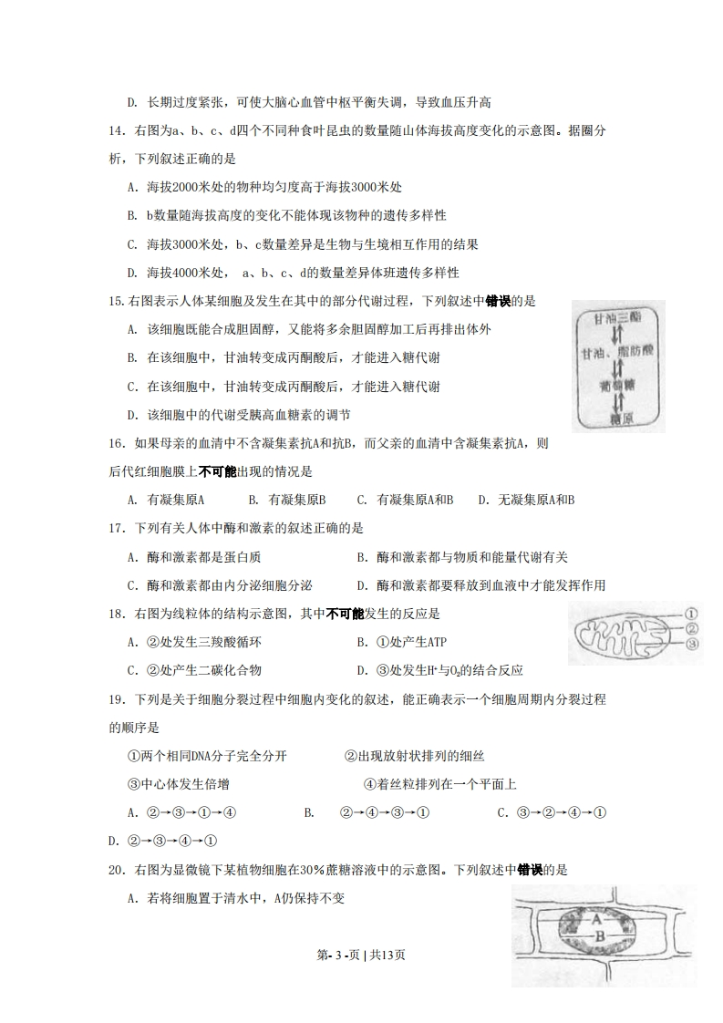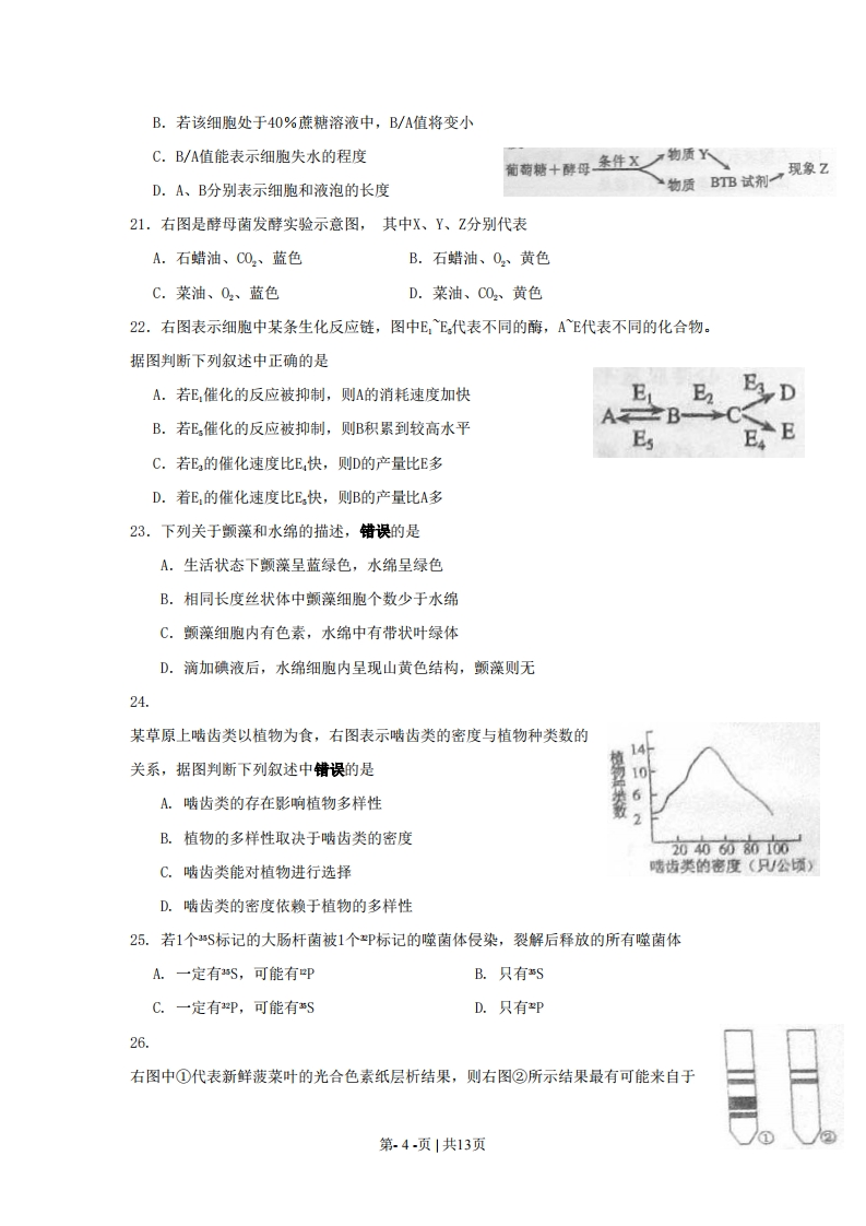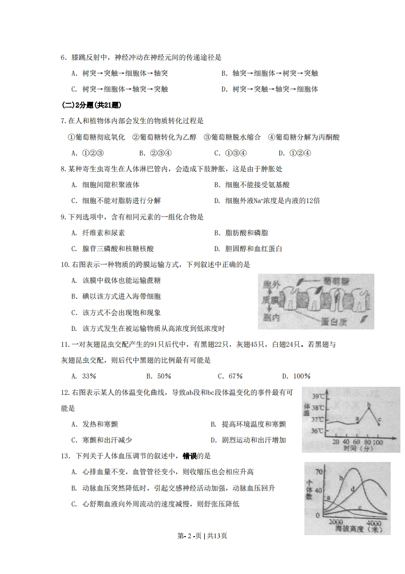 2010年全国普通高等学校招生统一考试上海生物试卷考生注意:1.满分150分。考试时间为120分钟。2.答第1卷前,考生务必在答题卡上用钢笔或圆珠笔清楚切写姓名、准考证号、校验码,并用铅笔正确涂写准考证号和校验码。3.第丨卷由机器阅卷,答案必须全部涂写在答题纷上。考生应将代表正确答案的小方格用铅笔涂黑。注意试题题号和答题纸编号一一对应,不能错位。答题需要更改时,必须将原选项用橡皮擦去,在新选择。答案不能写在试卷上,写在试卷上一律不给分。第I卷(共60分)一.单选题(共60分。每小题只有一个正确选项)(一)1分题(共6题)1.右图是某生物模式图,组成结构a的物质最有可能是A.蛋白质B RNAC.DNAD.脂质2.以“-GAATTG-”的互补链转录mRNA,则此段mRNA的序列是A.-GAAUUG-B.-CTTAAC-C.-CUUAAC-D.-GAATTG-3.以下最能反映健康人餐后6小时内血糖浓度变化趋势的曲线是血个时间时间时间时间4.细胞内某一DNA片段中有30%的碱基为A,则该片段中A.G的含量为30%B.U的含量为30%C.嘌呤含量为50%D.嘧啶含量为40%5·右图表示生物体内的某化学反应,下列有关该反应的叙述中错误的是A,需要解旋酶B.属于水解反应HOC.会有能量变化HN C OH H NO C 0D.反应速度与温度有关第.1-页|共13页6.膝跳反射中,神经冲动在神经元间的传递途径是A.树突→突触→细胞体→轴突B.轴突→细胞体→树突→突触C.树突→细胞体→轴突→突触D.树突→突触→轴突→细胞体(二)2分题(共21题)7.在人和植物体内部会发生的物质转化过程是①葡萄糖彻底氧化②葡萄糖转化为乙醇③葡萄糖脱水缩合④葡萄糖分解为丙酮酸A.①②③B.②③④C.①③④D.①②④8.某种寄生虫寄生在人体淋巴管内,会造成下肢肿胀,这是由于肿胀处A.细胞间隙积聚液体B.细胞不能接受氨基酸C.细胞不能对脂肪进行分解D.细胞外液Na浓度是内液的12倍9.下列选项中,含有相同元素的一组化合物是A.纤维素和尿素B.脂肪酸和磷脂C.腺苷三磷酸和核糖核酸D.胆固醇和血红蛋白10.右图表示一种物质的跨膜运输方式,下列叙述中正确的是A.该膜中载体也能运输蔗糖B.碘以该方式进入海带细胞C.该方式不会出现饱和现象内蛋白质D.该方式发生在被运输物质从高浓度到低浓度时11.一对灰翅昆虫交配产生的91只后代中,有黑翅22只,灰翅45只,白翅24只。若黑翅与灰翅昆虫交配,则后代中黑翅的比例最有可能是A.33%B.50%C.67%D.100%12.右图表示某人的体温变化曲线,导致b段和bc段体温变化的事件最有可39℃能是38℃37℃A.发热和寒颤B.提高环境温度和寒颤36CC.寒颤和出汗减少D.剧烈运动和出汗增加20406080100时间(分)13.下列关于人体血压调节的叙述中,错误的是A.心排血量不变,血管管径变小,则收缩压也会相应升高B.动脉血压突然降低时,引起交感神经活动加强,动脉血压回升C.心舒期血液向外周流动的速度减慢,则舒张压降低海拔高度(第.2-页|共13页D.长期过度紧张,可使大脑心血管中枢平衡失调,导致血压升高14.右图为a、b、c、d四个不同种食叶昆虫的数量随山体海拔高度变化的示意图。据圈分析,下列叙述正确的是A.海拔2000米处的物种均匀度高于海拔3000米处B.b数量随海拔高度的变化不能体现该物种的遗传多样性C.海拔3000米处,b、c数量差异是生物与生境相互作用的结果D.海拔4000米处,a、b、c、d的数量差异体班遗传多样性15.右图表示人体某细胞及发生在其中的部分代谢过程,下列叙述中错误的是甘油三酯A.该细胞既能合成胆固醇,又能将多余胆固醇加工后再排出体外B.在该细胞中,甘油转变成丙酮酸后,才能进入糖代谢甘油、眉肪酸C.在该细胞中,甘油转变成丙酮酸后,才能进入糖代谢D.该细胞中的代谢受胰高血糖素的调节16.如果母亲的血清中不含凝集素抗A和抗B,而父亲的血清中含凝集素抗A,则后代红细胞膜上不可能出现的情况是A.有凝集原AB.有凝集原BC.有凝集原A和BD.无凝集原A和B17.下列有关人体中酶和激素的叙述正确的是A.酶和激素都是蛋白质B.酶和激素都与物质和能量代谢有关C.酶和激素都由内分泌细胞分泌D.酶和激素都要释放到血液中才能发挥作用18.右图为线粒体的结构示意图,其中不可能发生的反应是2A.②处发生三羧酸循环B.①处产生ATPC.②处产生二碳化合物D.③处发生H与0的结合反应19.下列是关于细胞分裂过程中细胞内变化的叙述,能正确表示一个细胞周期内分裂过程的顺序是①两个相同DNA分子完全分开②出现放射状排列的细丝③中心体发生倍增④着丝粒排列在一个平面上A.②→③→①→④B.②→④→③→①C.③→②→④→①D.②→③→④→①20.右图为显微镜下某植物细胞在30%蔗糖溶液中的示意图。下列叙述中错误的是A.若将细胞置于清水中,A仍保持不变第.3-页|共13页