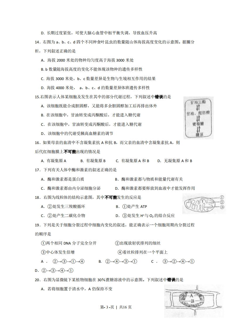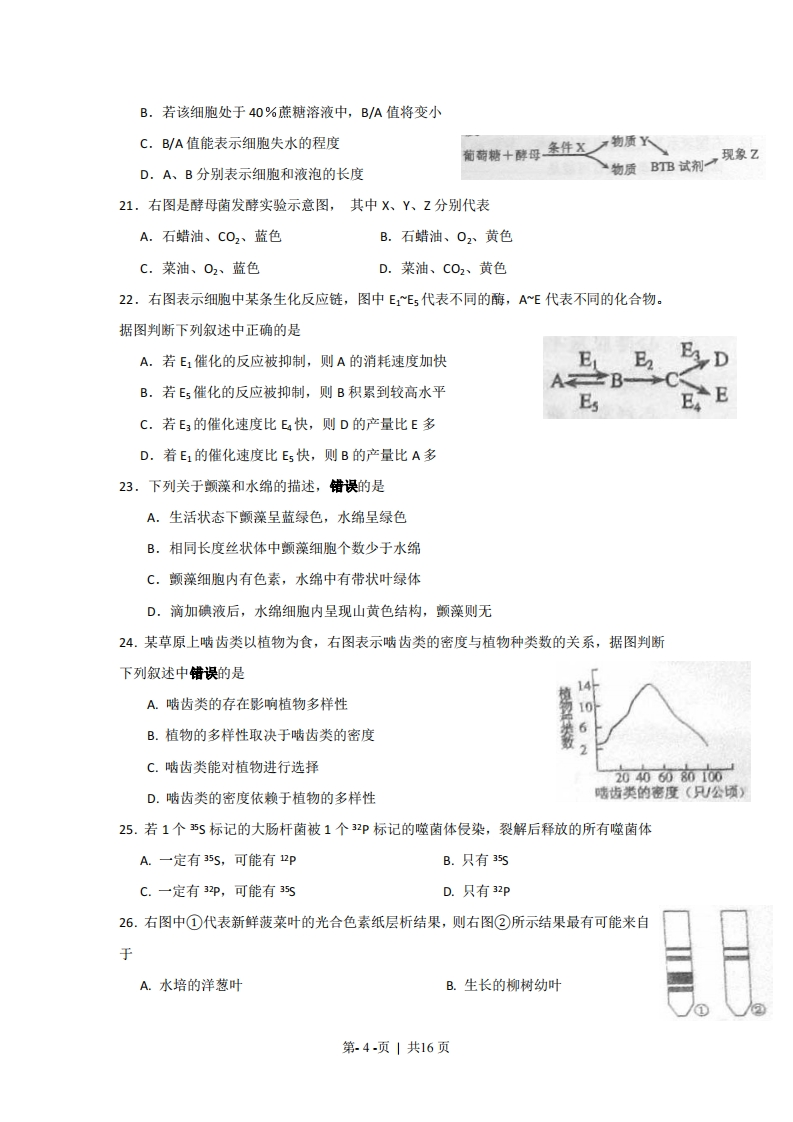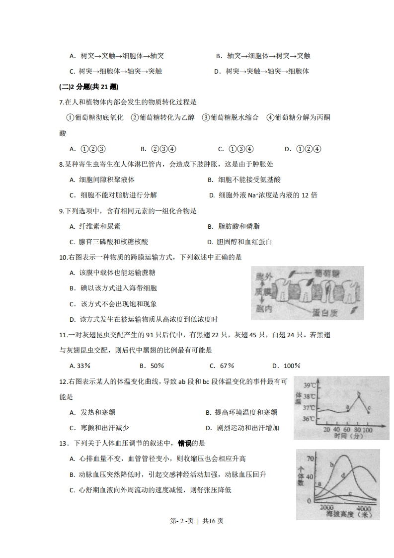 2010年全国普通高等学校招生统一考试上海生物试卷考生注意:1.满分150分。考试时间为120分钟。2.答第卷前,考生务必在答题卡上用钢笔或圆珠笔清楚切写姓名、准考证号、校验码,并用铅笔正确涂写准考证号和校验码。3.第ㄧ卷由机器阅卷,答案必须全部涂写在答题纷上。考生应将代表正确答案的小方格用铅笔涂黑。注意试题题号和答题纸编号一一对应,不能错位。答题需要更改时,必须将原选项用橡皮擦去,在新选择。答案不能写在试卷上,写在试卷上一律不给分。第I卷(共60分)一.单选题(共60分。每小题只有一个正确选项(一1分题(共6题)1.右图是某生物模式图,组成结构a的物质最有可能是A.蛋白质B RNAC.DNAD.脂质2.以“-GAATTG-"的互补链转录mRNA,则此段mRNA的序列是A.-GAAUUG-B.-CTTAAC-C.-CUUAAC-D.-GAATTG-3.以下最能反映健康人餐后6小时内血糖浓度变化趋势的曲线是度时间时间时间时间4.细胞内某一DNA片段中有30%的碱基为A,则该片段中A.G的含量为30%B.U的含量为30%C.嘌呤含量为50%D.嘧啶含量为40%5右图表示生物体内的某化学反应,下列有关该反应的叙述中错误的是A,需要解旋酶HN。一-O●C<8B.属于水解反应C.会有能量变化D.反应速度与温度有关6.膝跳反射中,神经冲动在神经元间的传递途径是第.1-页|共16页A.树突→突触→细胞体→轴突B.轴突→细胞体→树突→突触C.树突→细胞体→轴突→突触D.树突→突触一→轴突→细胞体(二2分题(共21题)7.在人和植物体内部会发生的物质转化过程是①葡萄糖彻底氧化②葡萄糖转化为乙醇③葡萄糖脱水缩合④葡萄糖分解为丙酮酸A.①②③B.②③④C.①③④D.①②④8.某种寄生虫寄生在人体淋巴管内,会造成下肢肿胀,这是由于肿胀处A.细胞间隙积聚液体B.细胞不能接受氨基酸C.细胞不能对脂肪进行分解D.细胞外液Na+浓度是内液的12倍9.下列选项中,含有相同元素的一组化合物是A.纤维素和尿素B.脂肪酸和磷脂C.腺苷三磷酸和核糖核酸D.胆固醇和血红蛋白10.右图表示一种物质的跨膜运输方式,下列叙述中正确的是A.该膜中载体也能运输蔗糖B.碘以该方式进入海带细胞C.该方式不会出现饱和现象内蛋白质D.该方式发生在被运输物质从高浓度到低浓度时11.一对灰翅昆虫交配产生的91只后代中,有黑翅22只,灰翅45只,白翅24只。若黑翅与灰翅昆虫交配,则后代中黑翅的比例最有可能是A.33%B.50%C.67%D.100%12.右图表示某人的体温变化曲线,导致ab段和bc段体温变化的事件最有可39℃能是体38℃37℃A.发热和寒颤B.提高环境温度和寒颤36CC.寒颤和出汗减少D.剧烈运动和出汗增加20406080100时间(分)13.下列关于人体血压调节的叙述中,错误的是A.心排血量不变,血管管径变小,则收缩压也会相应升高B.动脉血压突然降低时,引起交感神经活动加强,动脉血压回升C.心舒期血液向外周流动的速度减慢,则舒张压降低海拔高度(第.2-页|共16页D.长期过度紧张,可使大脑心血管中枢平衡失调,导致血压升高14.右图为a、b、c、d四个不同种食叶昆虫的数量随山体海拔高度变化的示意图。据圈分析,下列叙述正确的是A.海拔2000米处的物种均匀度高于海拔3000米处B.b数量随海拔高度的变化不能体现该物种的遗传多样性C.海拔3000米处,b、c数量差异是生物与生境相互作用的结果D.海拔4000米处,a、b、c、d的数量差异体班遗传多样性15.右图表示人体某细胞及发生在其中的部分代谢过程,下列叙述中错误的是甘油三酯A.该细胞既能合成胆固醇,又能将多余胆固醇加工后再排出体外B.在该细胞中,甘油转变成丙酮酸后,才能进入糖代谢甘油、脂防酸C.在该细胞中,甘油转变成丙酮酸后,才能进入糖代谢D.该细胞中的代谢受胰高血糖素的调节16.如果母亲的血清中不含凝集素抗A和抗B,而父亲的血清中含凝集素抗A,则后代红细胞膜上不可能出现的情况是A.有凝集原AB.有凝集原BC.有凝集原A和BD.无凝集原A和B17.下列有关人体中酶和激素的叙述正确的是A.酶和激素都是蛋白质B.酶和激素都与物质和能量代谢有关C.酶和激素都由内分泌细胞分泌D.酶和激素都要释放到血液中才能发挥作用18.右图为线粒体的结构示意图,其中不可能发生的反应是2A.②处发生三羧酸循环B.①处产生ATPC.②处产生二碳化合物D.③处发生H+与O2的结合反应19.下列是关于细胞分裂过程中细胞内变化的叙述,能正确表示一个细胞周期内分裂过程的顺序是①两个相同DNA分子完全分开②出现放射状排列的细丝③中心体发生倍增④着丝粒排列在一个平面上A.②→③→①④B.②→④→③→①C.③→②→④→①D.②→③→④→①20.右图为显微镜下某植物细胞在30%蔗糖溶液中的示意图。下列叙述中错误的是A.若将细胞置于清水中,A仍保持不变第.3-页|共16页