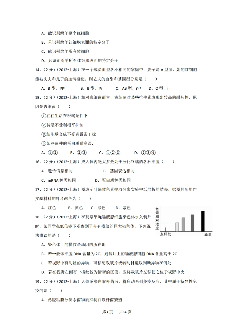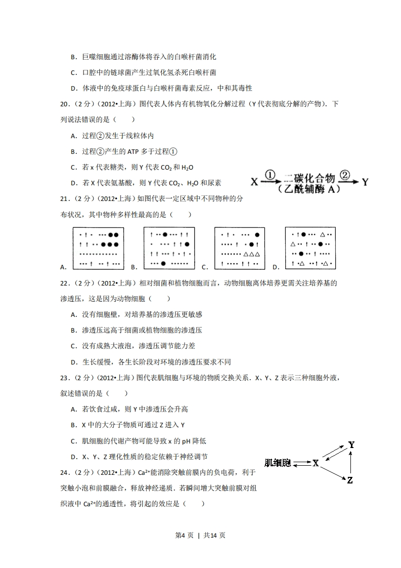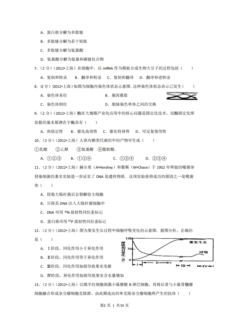 2012年全国普通高等学校招生统一考试上海生物试卷考生注意:1.满分150分。考试时间为120分钟。2.答第1卷前,考生务必在答题卡上用钢笔或圆珠笔清楚切写姓名、准考证号、校验码,并用铅笔正确涂写准考证号和校验码。3.第〡卷由机器阅卷,答案必须全部涂写在答题纷上。考生应将代表正确答案的小方格用铅笔涂黑。注意试题题号和答题纸编号一一对应,不能错位。答题需要更改时,必须将原选项用橡皮擦去,在新选择。答案不能写在试卷上,写在试卷上一律不给分。一、选择题(共60分,每小题2分。每小题只有一个正确答案)1.(2分)(2012·上海)由细胞形态判断,下列细胞中最可能连续分裂的是(A.D2.(2分)(2012·上海)如果图1表示纤维素的结构组成方式,那么符合图2所示结构组成方式的是()图10-000000000-图2公口△◇◇O公口◇△①核酸②多肽③淀粉.A.①②③B.②③c.①③D.①②3.(2分)(2012·上海)下列食物营养成分与鉴定试剂及显色反应之间的对应关系中,错误的是()A.淀粉:碘液,蓝紫色B.还原糖:班氏试剂,红黄色C.脂肪:苏丹Ⅲ染液,橘红色D.蛋白质:双缩脲试剂,黄绿色4.(2分)(2012·上海)图为某细胞结构的电镜照片,与图中箭头所指小点”结构形成有关的是()A.核仁B.中心体C.叶绿体D.溶酶体5.(2分)(2012·上海)微生物的种类繁多,下列微生物中属于原核生物的是((①黏菌②酵母菌③蓝细菌④大肠杆菌⑤乳酸杆菌.A.①②③B.②③④C.③④⑤D.①④⑤6.(2分)(2012·上海)生物体中的某种肽酶可水解肽链末端的肽键,导致()第1页|共14页A.蛋白质分解为多肽链B.多肽链分解为若干短肽C.多肽链分解为氨基酸D.氨基酸分解为氨基和碳链化合物7.(2分)(2012·上海)在细胞中,以mRNA作为模板合成生物大分子的过程包括()A.复制和转录B.翻译和转录C.复制和翻译D.翻译和逆转录8.2分)2012·上海)如图为细胞内染色体状态示意图.这种染色体状态表示己发生(A.染色体易位B.基因重组C.染色体倒位D.姐妹染色单体之间的交换9.(2分)(2012·上海)酶在大规模产业化应用中的核心问题是固定化技术,而酶固定化所依据的基本原理在于酶具有()A.热稳定性B.催化高效性C.催化特异性D.可反复使用性10.(2分)(2012·上海)人体内糖类代谢的中间产物可生成()①乳酸②乙醇③氨基酸④脂肪酸,A.①②③B.①②④C.①③④D.②③④11.(2分)(2012·上海)赫尔希(A.Hershey)和蔡斯(M~Chase)于1952年所做的噬菌体侵染细菌的著名实验进一步证实了DNA是遗传物质.这项实验获得成功的原因之一是噬菌体()A.侵染大肠杆菌后会裂解宿主细胞B.只将其DNA注入大肠杆菌细胞中C.DNA可用5N放射性同位素标记D.蛋白质可用2P放射性同位素标记12.(2分)(2012·上海)图为果实生长过程中细胞呼吸变化的示意图.据图分析,正确的是()10果生长A.I阶段,同化作用小于异化作用50呼吸B.Ⅱ阶段,同化作用等于异化作用C.Ⅲ阶段,同化作用加剧导致果实变甜+I++IⅡ+树KIV-D.V阶段,异化作用加剧导致果实含水量增加13.(2分)(2012·上海)以绵羊红细胞刺激小鼠脾脏B淋巴细胞,再将后者与小鼠骨髓瘤细胞融合形成杂交瘤细胞克隆群,由此筛选出的单克隆杂交瘤细胞所产生的抗体()第2页|共14页A.能识别绵羊整个红细胞B.只识别绵羊红细胞表面的特定分子C.能识别绵羊所有体细胞D.只识别绵羊所有体细胞表面的特定分子14.(2分)(2012·上海)在一个成员血型各不相同的家庭中,妻子是A型血,她的红细胞能被丈夫和儿子的血清凝集,则丈夫的血型和基因型分别是()A.B型,IBB.B型,1C.AB型,BD.O型,i15.(2分)(2012·上海)相对真细菌而言,古细菌对某些抗生素表现出较高的耐药性,原因是古细菌()①往往生活在极端条件下②转录不受利福平抑制③细胞壁合成不受青霉素干扰④某些菌种的蛋白质耐高温.A.①②B.②③C.①②③D.②③④16.(2分)(2012·上海)成人体内绝大多数处于分化终端的各种细胞()A.遗传信息相同B.基因表达相同C.mRNA种类相同D.蛋白质种类相同17.(2分)(2012·上海)图表示叶绿体色素提取分离实验中纸层析的结果,据图判断用作实验材料的叶片颜色为()A.红色B.黄色C.绿色D.紫色18.(2分)(2012·上海)在观察果蝇唾液腺细胞染色体永久装片素相对时,某同学在低倍镜下观察到了带有横纹的巨大染色体,下列说浓法错误的是()点样处距离A.染色体上的横纹是基因的所在地B.若一般体细胞DNA含量为2C,则装片上的唾液腺细胞DNA含量高于2CC.若视野中有明显的异物,可移动载玻片或转动目镜以判断异物在何处D.若在视野左侧有一横纹较为清晰的区段,应将载玻片左移使之位于视野中央19.(2分)(2012·上海)人体感染白喉杆菌后,将启动系列免疫反应,其中属于特异性免疫的是()A.鼻腔粘膜分泌杀菌物质抑制白喉杆菌繁殖第3页|共14页