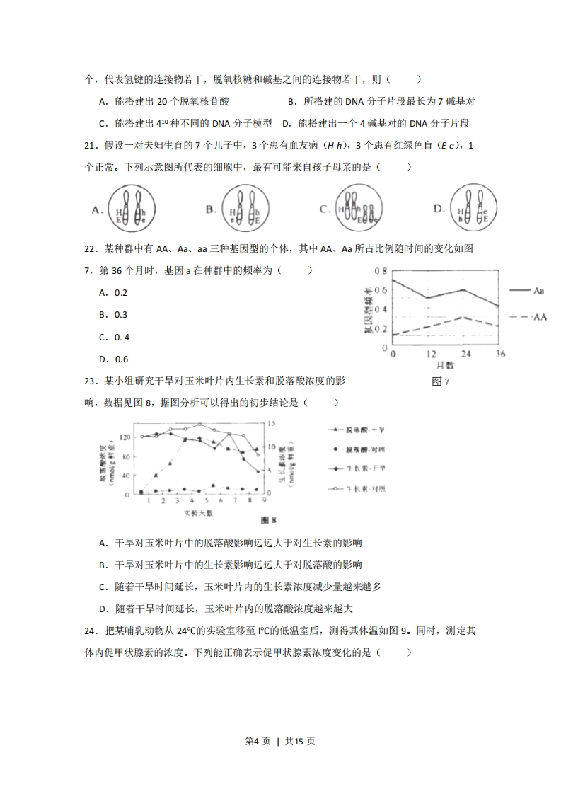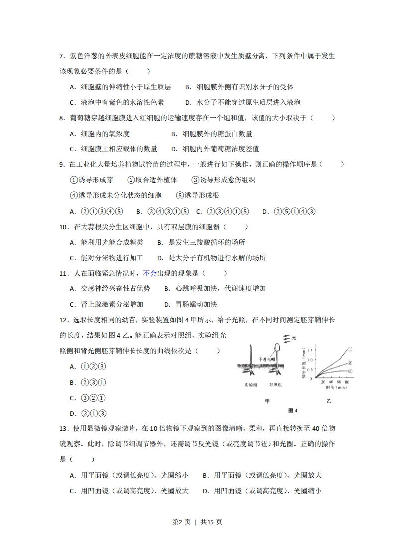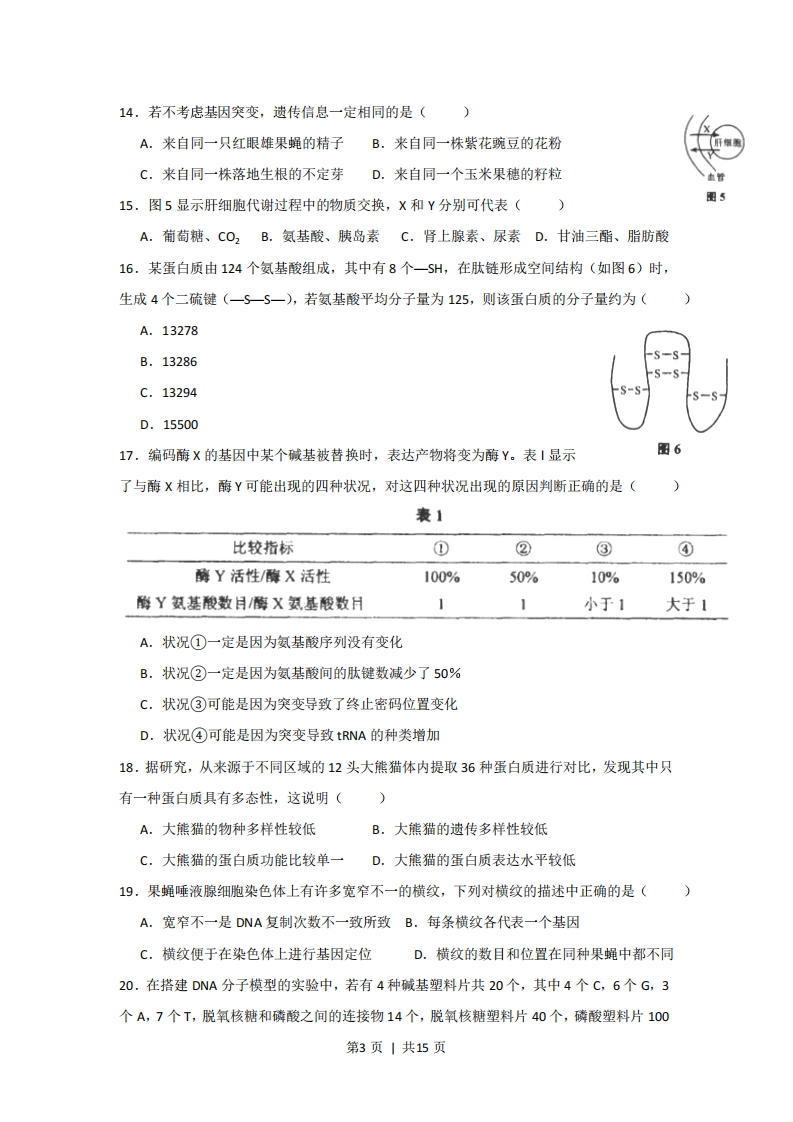 2013年全国普通高等学校招生统一考试上海生物试卷考生注意:1.满分150分。考试时间为120分钟。2.答第〡卷前,考生务必在答题卡上用钢笔或圆珠笔清楚切写姓名、准考证号、校验码,并用铅笔正确涂写准考证号和校验码。3.第丨卷由机器阅卷,答案必须全部涂写在答题纷上。考生应将代表正确答案的小方格用铅笔涂黑。注意试题题号和答题纸编号一一对应,不能错位。答题需要更改时,必须将原选项用橡皮擦去,在新选择。答案不能写在试卷上,写在试卷上一律不给分。一、选择题(共60分,每小题2分。每小题只有一个正确答案)1.下列感受器中属于化学感受器的是(A.人类皮肤感受器B.蝮蛇颊窝C.飞蛾的触角D.鱼类侧线2.图1表示细胞中一种常见的水解反应,下列化合物能发生此种反应的有()000000·0.,09①多肽②淀粉③纤维素④脂肪生物人分子单体A.①②③B.①②④C.①③④D.②③④图13.图2显示了细胞的部分质膜及其周围物质,其中一定代表蛋白质的符号是(A.oB.◆C.YD.o和Y4.下列细胞属于G,细胞的是()A.神经细胞B.肝细胞C.肌肉细胞D.骨髓细胞图25.下列关于乙型肝炎病毒的说法正确的是()A.能在人体血浆中增殖B.不能寄生在呼吸道黏膜细胞中C.核酸中含5种含氮碱基D.蛋白质由自身的核糖体合成6.图3显示了人体内能源物质的代谢途径,大写字母代表物质,其中物质Z直接参与了过程①,下列叙述不正确的是()脂肪A.X是葡萄糖B.Y是丙酮酸彻C.Q是甘油水解糖原--X-ATPD.Z可以是氨基酸脱去氨基的碳链图3第1页|共15页7.紫色洋葱的外表皮细胞能在一定浓度的蔗糖溶液中发生质壁分离,下列条件中属于发生该现象必要条件的是()A.细胞壁的伸缩性小于原生质层B.细胞膜外侧有识别水分子的受体C.液泡中有紫色的水溶性色素D.水分子不能穿过原生质层进入液泡8.葡萄糖穿越细胞膜进入红细胞的运输速度存在一个饱和值,该值的大小取决于()A.细胞内的氧浓度B,细胞膜外的糖蛋白数量C.细胞膜上相应载体的数量D.细胞内外葡萄糖浓度差值9.在工业化大量培养植物试管苗的过程中,一般进行如下操作,则正确的操作顺序是()①诱导形成芽②取合适外植体③诱导形成愈伤组织④诱导形成未分化状态的细胞⑤诱导形成根A.②①③④⑤B.②④③①⑤C.②③④①⑤D.②⑤①④③10.在大蒜根尖分生区细胞中,具有双层膜的细胞器()A.能利用光能合成糖类B.是发生三羧酸循环的场所C.能对分泌物进行加工D.是大分子有机物进行水解的场所11.人在面临紧急情况时,不会出现的现象是()A.交感神经兴奋性占优势B.心跳呼吸加快,代谢速度增加C.肾上腺激素分泌增加D.胃肠蠕动加快12.选取长度相同的幼苗,实验装置如图4甲所示,给子光照,在不同时间测定胚芽鞘伸长的长度,结果如图4乙。能正确表示对照组、实验组光照侧和背光侧胚芽鞘伸长长度的曲线依次是()A.①②③0B.②③①实粗20406080是H《档in)c.③②①多乙D.②①③图413.使用显微镜观察装片,在10倍物镜下观察到的图像清晰、柔和,再直接转换至40倍物镜观察。此时,除调节细调节器外,还需调节反光镜(或亮度调节钮)和光圈。正确的操作是()A.用平面镜(或调低亮度)、光圈缩小B.用平面镜(或调低亮度)、光圈放大C.用凹面镜(或调高亮度)、光圈放大D.用凹面镜(或调高亮度)、光圈缩小第2页|共15页14.若不考虑基因突变,遗传信息一定相同的是()A.来自同一只红眼雄果蝇的精子B.来自同一株紫花豌豆的花粉C.来自同一株落地生根的不定芽D.来自同一个玉米果穗的籽粒15.图5显示肝细胞代谢过程中的物质交换,X和Y分别可代表()图5A.葡萄糖、CO2B.氨基酸、胰岛素C.肾上腺素、尿素D.甘油三酯、脂肪酸16.某蛋白质由124个氨基酸组成,其中有8个一SH,在肽链形成空间结构(如图6)时,生成4个二硫键(一S一S一),若氨基酸平均分子量为125,则该蛋白质的分子量约为(A.13278B.13286C.13294D.1550017.编码酶X的基因中某个碱基被替换时,表达产物将变为酶Y。表〡显示图6了与酶X相比,酶Y可能出现的四种状况,对这四种状况出现的原因判断正确的是()表1比较指标①②③④酶Y活性/酶X活性100%50%10%150%酶Y氨基酸数目/酶X氨基酸数日1/小于1大于1A.状况①一定是因为氨基酸序列没有变化B.状况②一定是因为氨基酸间的肽键数减少了50%C.状况③可能是因为突变导致了终止密码位置变化D.状况④可能是因为突变导致tRNA的种类增加18.据研究,从来源于不同区域的12头大熊猫体内提取36种蛋白质进行对比,发现其中只有一种蛋白质具有多态性,这说明()A.大熊猫的物种多样性较低B.大熊猫的遗传多样性较低C.大熊猫的蛋白质功能比较单一D.大熊猫的蛋白质表达水平较低19.果蝇唾液腺细胞染色体上有许多宽窄不一的横纹,下列对横纹的描述中正确的是()A.宽窄不一是DNA复制次数不一致所致B.每条横纹各代表一个基因C.横纹便于在染色体上进行基因定位D.横纹的数目和位置在同种果蝇中都不同20.在搭建DNA分子模型的实验中,若有4种碱基塑料片共20个,其中4个C,6个G,3个A,7个T,脱氧核糖和磷酸之间的连接物14个,脱氧核糖塑料片40个,磷酸塑料片100第3页|共15页
