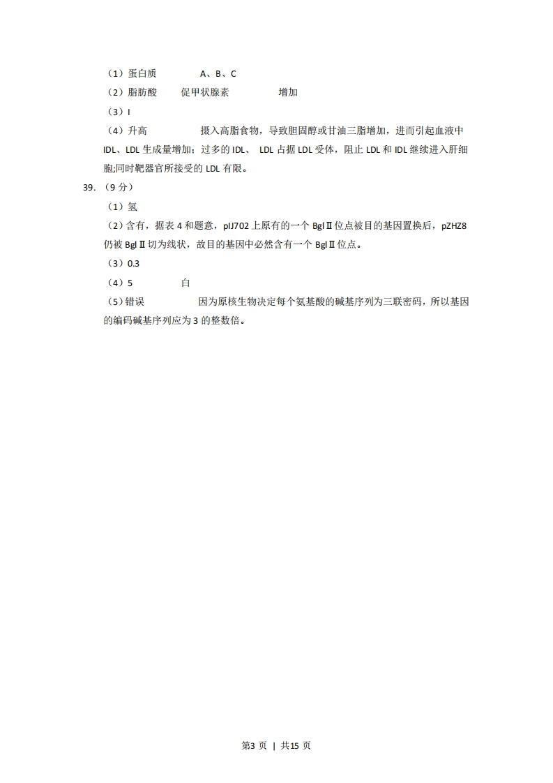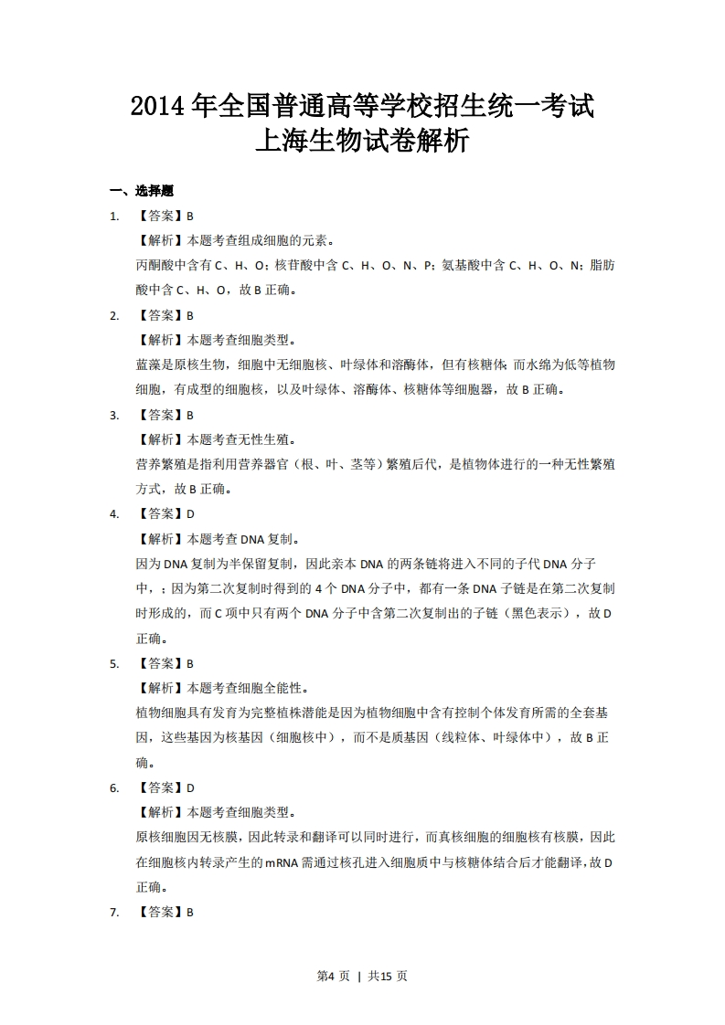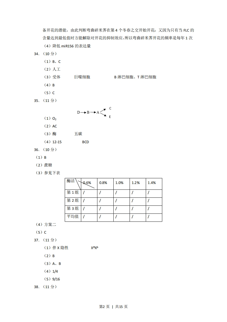 2014年全国普通高等学校招生统一考试上海生物试卷答案一、选择题题号12468910答案BBDBDBAC题号11121314151617181920答案BAAAACCA题号21222324252627282930答案B0BDBBC二、非选择题31.(9分)(1)遗传DNA的脱氧核苷酸序列(2)②③(3)有利于在⑥⑦原种群之间形成地理隔离(4)生物隔离A、E32.(10分)(1)间后(2)事件过程过程①②DNA序列改变细胞功能改变伴随蛋白质合成细胞数量增加(3)A(4)A(5)[GATA]/+[PU]/降低GATA的浓度/增加PU的浓度33.(9分)(1)A、D(2)C(3)4因为只有当植株内miR156含量低于开花临界值时,弯曲碎米荠才具第1页|共15页备开花的潜能,由此判断弯曲碎米荠在第4个冬春之交开始开花:又因为只有当LC的含量达到最低值时方能解除对开花的抑制效应,所以弯曲碎米荠开花的频率是每年1次(4)降低miR156的表达量34.(10分)(1)B、C(2)人工(3)受体巨噬细胞B淋巴细胞、T淋巴细胞(4)B(5)C35.(11分)D→B→A乙(1)02(2)AC(3)酶五碳(4)12-15BCD36.(10分)(1)B(2)蔗糖(3)参见下表酶活Q.6%0.8%1.0%1.2%1.4%第1组第2组第3组平均值(4)方案二(5)C37.(11分)(1)伴X隐性XXx地(2)B(3)A、B(4)1/4(5)9/1638.(11分)第2页|共15页(1)蛋白质A、B、C(2)脂肪酸促甲状腺素增加(3)1(4)升高摄入高脂食物,导致胆固醇或甘油三脂增加,进而引起血液中IDL、LDL生成量增加:过多的IDL、LDL占据LDL受体,阻止LDL和DL继续进入肝细胞;同时靶器官所接受的LDL有限。39.(9分)(1)氢(2)含有,据表4和题意,p702上原有的一个BglⅡ位点被目的基因置换后,pZH28仍被BgⅡ切为线状,故目的基因中必然含有一个BgⅡ位点。(3)0.3(4)5白(5)错误因为原核生物决定每个氨基酸的碱基序列为三联密码,所以基因的编码碱基序列应为3的整数倍。第3页|共15页