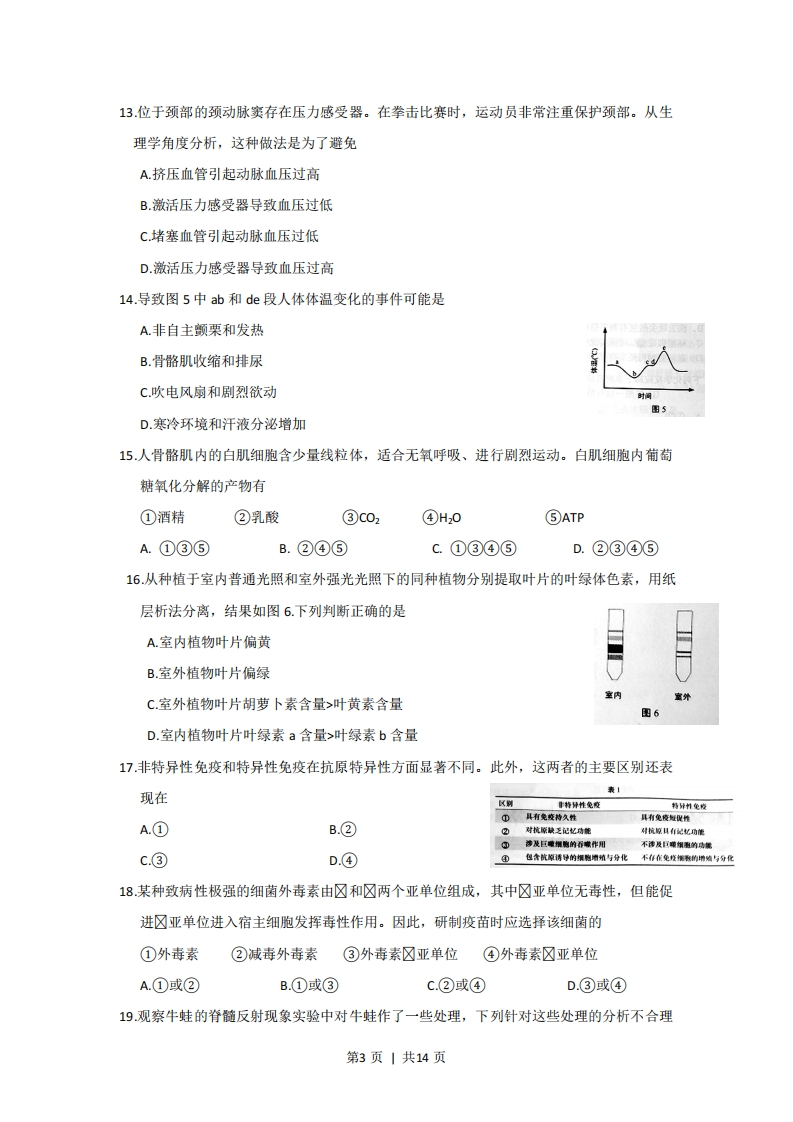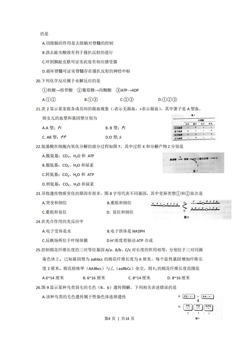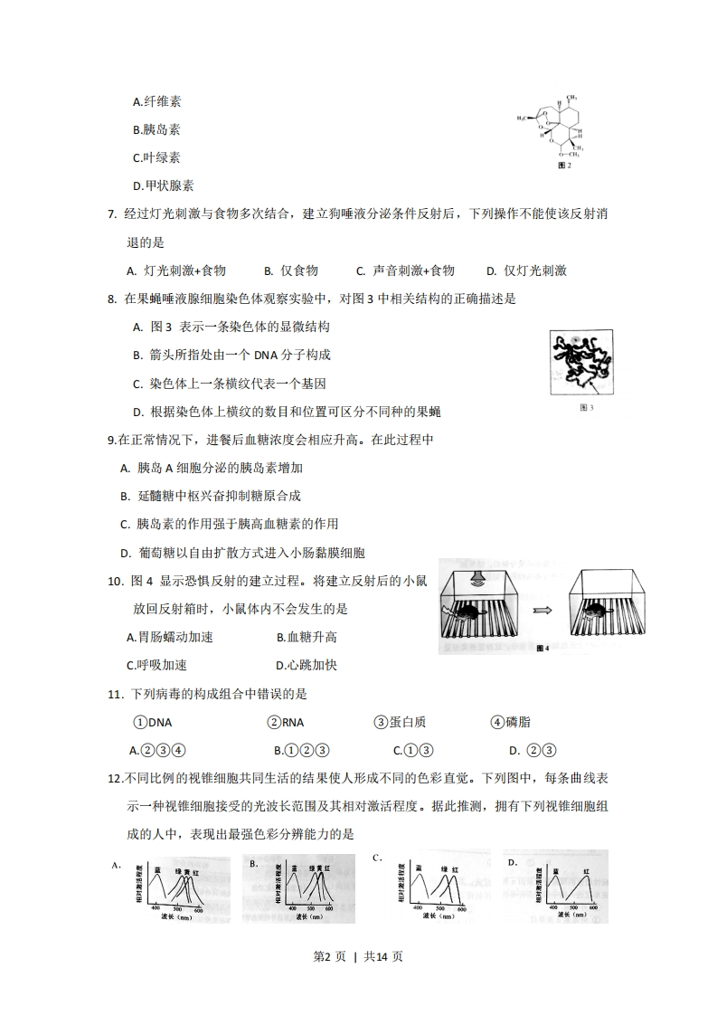 2016年全国普通高等学校招生统一考试上海生物试卷考生注意:1.满分150分。考试时间为120分钟。2.答第1卷前,考生务必在答题卡上用钢笔或圆珠笔清楚切写姓名、准考证号、校验码,并用铅笔正确涂写准考证号和校验码。3.第〡卷由机器阅卷,答案必须全部涂写在答题纷上。考生应将代表正确答案的小方格用铅笔涂黑。注意试题题号和答题纸编号一一对应,不能错位。答题需要更改时,必须将原选项用橡皮擦去,在新选择。答案不能写在试卷上,写在试卷上一律不给分。一、选择题(共60分,每小题2分。每小题只有一个正确答案)1.SARS病毒可以通过口腔分泌物进行传播,这种传播途径属于A.媒介物传播B.空气传播C病媒传播D接触传播2在电子显微镜下,放线菌和霉菌中都能观察到的结构是A.核糖体和质膜B.线粒体和内质网C核糖体和拟核D.线粒体和高尔基体3.将紫色洋葱鳞叶外表皮细胞置于30%蔗糖溶液数分钟后,结果如图1所示,紫色分部的区域和影响色素分布的结构分别是A.①和细胞膜B.①和细胞膜、液泡膜C.②和细胞膜、液泡膜D.②和细胞膜、液泡膜、细胞壁4.多肉植物鸡冠掌通常利用落叶上长出的不定芽繁殖,这种繁殖类型是A.出芽生殖B.营养繁殖C.分裂生殖D.有性生殖5.下列关于测量蚕豆叶下表皮保卫细胞长度的实验操作,错误的是A从低倍镜转到高倍镜时,两眼必须从显微镜侧面注视B.从低倍镜转到高倍镜时,轻轻地转动物镜使高倍镜到位C从低倍镜视野中,需将进一步放大观察的物像移至视野中央D.测量细胞长度时,应尽量使目镜测微尺与被测细胞平行并重叠6.诺贝尔奖得主屠呦呦在抗疟药物研发中,发现了一种药效高于青蒿素的衍生物蒿甲醚,结构如图2。下列与蒿甲醚的元素组成完全相同的物质是第1页1共14页A.纤维素B.胰岛素C.叶绿素D.甲状腺素7.经过灯光刺激与食物多次结合,建立狗唾液分泌条件反射后,下列操作不能使该反射消退的是A.灯光刺激+食物B.仅食物C.声音刺激+食物D.仅灯光刺激8.在果蝇唾液腺细胞染色体观察实验中,对图3中相关结构的正确描述是A.图3表示一条染色体的显微结构B.箭头所指处由一个DNA分子构成C.染色体上一条横纹代表一个基因D.根据染色体上横纹的数目和位置可区分不同种的果蝇9在正常情况下,进餐后血糖浓度会相应升高。在此过程中A.胰岛A细胞分泌的胰岛素增加B.延髓糖中枢兴奋抑制糖原合成C.胰岛素的作用强于胰高血糖素的作用D.葡萄糖以自由扩散方式进入小肠黏膜细胞10.图4显示恐惧反射的建立过程。将建立反射后的小鼠放回反射箱时,小鼠体内不会发生的是A.胃肠蠕动加速B.血糖升高C呼吸加速D.心跳加快11.下列病毒的构成组合中错误的是①DNA②RNA③蛋白质④磷脂A.②③④B.①②③c.①③D.②③12.不同比例的视锥细胞共同生活的结果使人形成不同的色彩直觉。下列图中,每条曲线表示一种视锥细胞接受的光波长范围及其相对激活程度。据此推测,拥有下列视锥细胞组成的人中,表现出最强色彩分辨能力的是第2页|共14页13.位于颈部的颈动脉窦存在压力感受器。在拳击比赛时,运动员非常注重保护颈部。从生理学角度分析,这种做法是为了避免A挤压血管引起动脉血压过高B.激活压力感受器导致血压过低C堵塞血管引起动脉血压过低D.激活压力感受器导致血压过高14.导致图5中ab和de段人体体温变化的事件可能是A.非自主颤栗和发热B.骨骼肌收缩和排尿C吹电风扇和剧烈欲动时D.寒冷环境和汗液分泌增加15.人骨骼肌内的白肌细胞含少量线粒体,适合无氧呼吸、进行剧烈运动。白肌细胞内葡萄糖氧化分解的产物有①酒精②乳酸③c02④H20⑤ATPA.①③⑤B.②④⑤c.①③④⑤D.②③④⑤16.从种植于室内普通光照和室外强光光照下的同种植物分别提取叶片的叶绿体色素,用纸层析法分离,结果如图6.下列判断正确的是A.室内植物叶片偏黄B.室外植物叶片偏绿C.室外植物叶片胡萝卜素含量>叶黄素含量图6D.室内植物叶片叶绿素a含量>叶绿素b含量17.非特异性免疫和特异性免疫在抗原特异性方面显著不同。此外,这两者的主要区别还表现在表1民群事特州性免疫精计州免夜Φ具有免整特久性具有免陵短仪性A.①B.②对技原缺乏记忆功能结抗原具有配忆功能及巨嫩的常作用不神及巨单细围的成餐c.③D.④鱼但含杭草锈球的蝶胸增殖与分化不存在免整能秋的销装与分化18某种致病性极强的细菌外毒素由☒和☒两个亚单位组成,其中☒亚单位无毒性,但能促进☒亚单位进入宿主细胞发挥毒性作用。因此,研制疫苗时应选择该细菌的①外毒素②减毒外毒素③外毒素☒亚单位④外毒素☒亚单位A.①或②B.①或③c.②或④D.③或④19.观察牛蛙的脊髓反射现象实验中对牛蛙作了一些处理,下列针对这些处理的分析不合理第3页|共14页