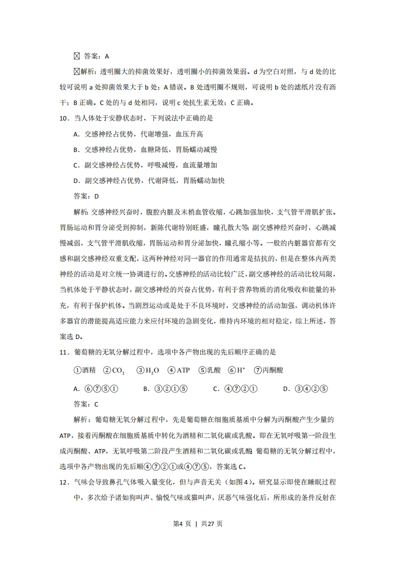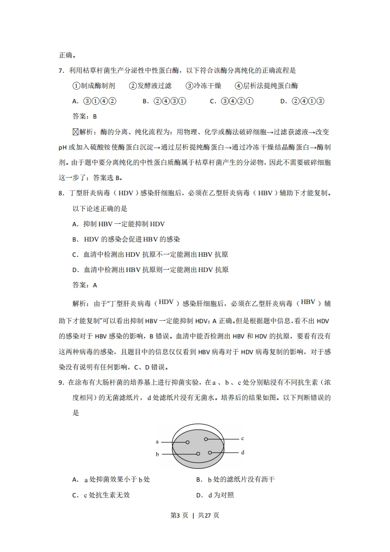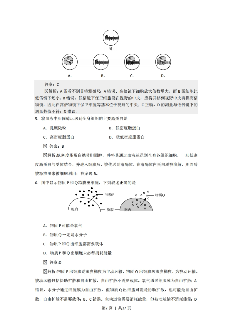 2015年全国普通高等学校招生统一考试上海生物试卷答案解析一、选择题(共60分,每小题2分。每小题只有一个正确答案)1.当环境温度接近体温时,人体维持体温恒定的散热方式是A.蒸发B.传导C.辐射D.对流答案:A解析:蒸发散热是指体液的水分在皮肤和粘膜(主要是呼吸道粘膜)表面由液态转化为气态,同时带走大量热量的一种散热方式。辐射散热是由温度较高的物体表面(一般为皮肤)发射红外线,而由温度较低的物体接收的散热方式。传导散热指机体的热量直接传给与之接触的温度较低物体的一种散热方式。对流散热紧贴身体的空气由于辐射的结果温度升高,体积膨胀而上升,冷空气接着来补充,体表又与新移动过来的较冷空气进行热量交换,因而不断带走热量。由上述散热方式的定义和题干中环境温度接近体温,可推断这种环境中人体维持温恒定的散热方式是蒸发散热:答案选A2.原核生物都具有的结构是A.质膜和核膜B.线粒体和核膜C.质膜和核搪体D.线粒体和核糖体答案:C解析:原核细胞无核膜,也无线粒体,只有一种细胞器核糖体:A、B、D错误。3.细菌共有的特征是①光学显微镜下可见②具有细胞结构③属于二倍体④能寄生A.①②B.①④C.②③D.③④☒答案:A☒解析:细菌无染色体,③错误:细菌营寄生的类型同化作用类型为异养,有的为自养,如硝化细菌,④错误。细菌为原核生物,由原核细胞构成,在光学显微镜下均可看到答案选A。4.若在低倍显微镜下用目镜侧微尺测量细胞长径(如图1),则转换高倍物镜后观察到的图像是第1页|共27页图1D答案:C☒解析:A图看不到目镜测微尺:A错误。高倍镜下细胞放大倍数增大,而B图细胞比低倍镜下还小:B错误。低倍镜下保卫细胞没在视野的中央,应将其移到视野中央再换高倍物镜,因此在高倍物镜下保卫细胞等基本位于视野的中央:C正确。D的测量与低倍镜下的测量数值不符:D错误。5.将血液中胆固醇运送到全身组织的主要脂蛋白是A.乳糜微粒B.低密度脂蛋白C.高密度脂蛋白D.极低密度脂蛋白☒答案:B☒解析:低密度脂蛋白携带胆固醇,并将其通过血液运送到全身各组织细胞,一旦低密度脂蛋白与受体结合,并进入细胞后,被传送到溶酶体,在溶酶体内蛋白质被降解,胆固醇被释放出来被细胞利用:答案选B。6.图中显示物质P和Q跨膜出细胞,下列叙述正确的是●●●一物质P一物质Q●●0000/0胞内质膜胞内00A.物质P可能是氧气B.物质Q一定是水分子C.物质P和Q出细胞都需要载体D.物质P和Q出细胞未必都捎耗能量☒答案:D☒解析:物质P出细胞逆浓度梯度为主动运输,物质Q出细胞顺浓度梯度,为被动运输。被动运输包括协助扩散和自由扩散,自由扩散不需要载体。氧气通过细胞膜为自由扩散:A错误。水分子通过细胞膜为自由扩散,但物质Q出细胞可能是协助扩散,也可能是自由扩散,自由扩散不需要载体:B、C错误。主动运输需要消耗能量,但被动运输不消耗能量:D第2页|共27页正确。7.利用枯草杆菌生产分泌性中性蛋白酶,以下符合该酶分离纯化的正确流程是①制成酶制剂②发酵液过滤③冷冻干燥④层析法提纯蛋白酶A.③①④②B.②④③①c.③④②①D.②④①③答案:B☒解析:酶的分离、纯化流程为:用物理、化学或酶法破碎细胞→过滤获滤液→改变pH或加入硫酸铵使酶蛋白沉淀→通过层析提纯酶蛋白→通过冷冻干燥结晶酶蛋白→酶制剂。由于题中要分离纯化的中性蛋白质酶属于枯草杆菌产生的分泌物,因此不需要破碎细胞这一步了:答案选B。8.丁型肝炎病毒(HDV)感染肝细胞后,必须在乙型肝炎病毒(HBV)辅助下才能复制。以下论述正确的是A.抑制HBV一定能抑制HDVB.HDV的感染会促进HBV的感染C.血清中检测出HDV抗原不一定能测出HBV抗原D.血清中检测出HBV抗原则一定能测出HDV抗原答案:A解析:由于丁型肝炎病毒(HDV)感染肝细胞后,必须在乙型肝炎病毒(HBV)辅助下才能复制”可以看出抑制HBV一定能抑制HDV:A正确.但是根据题中信息,看不出HDV的感染对于HBV感染的影响,B错误。血清中能否检测出HBV和HDV的抗原,要看有没有这两种病毒的感染,且题目中的信息仅仅看到HBV病毒对于HDV病毒复制的影响,对于感染没有说明有任何影响,C、D错误。9.在涂布有大肠杆菌的培养基上进行抑菌实验,在a、b、c处分别贴浸有不同抗生素(浓度相同)的无菌滤纸片,处滤纸片浸有无菌水。培养后的结果如图。以下判断错误的是A.a处抑菌效果小于b处B.b处的滤纸片没有沥干C.c处抗生素无效D.d为对照第3页|共27页