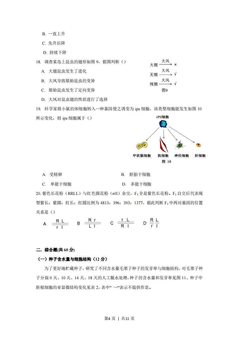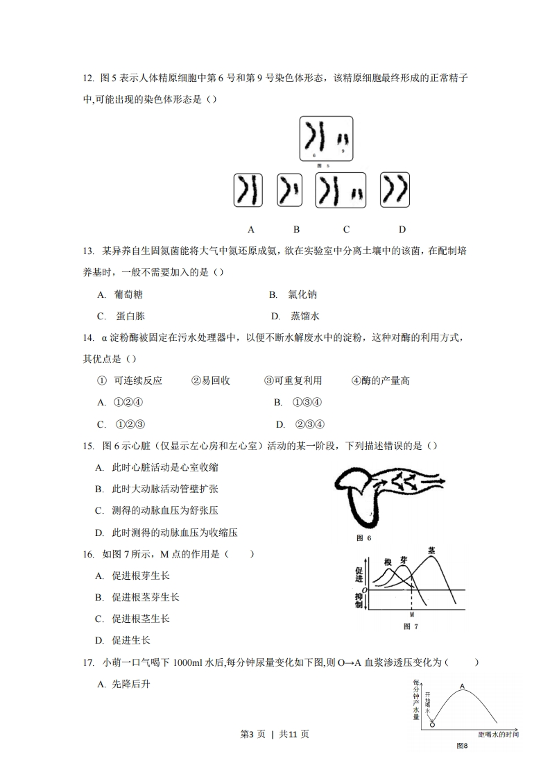 2018上海市普通高中学业水平等级性考试生物试卷考生注意:1,试卷满分100分,考试时间60分钟,2。本考试分设试卷和答愿纸。试卷包括两部分,第一部分全部为选择愿,第二部分为综合分析愿,包括填空惠、选择题和简答厘等型。3.考生应用2B船笔、钢笔或圆珠笔将答案直接写在答思纸上一.选择题(共40分,每小题2分,每小题只有一个正确答案)1.图1为丙氨酸结构式,依据氨基酸结构通式,判定他的R基是()HA.-HH2N-CCOOHB.-NH2C.-COOHCH3图1D.-CH32.我国科学家钟杨己保存种子4000万种,他的团队贡献属于保护生物多样性的措施()A.就地保护B.迁地保护C.离体保护D.异地保护3.图2为某动物细胞周期中各期时长,该细胞分裂间期时长为()A.1h7 h1h分裂期B.4h11hC.12h图2D.21h4.使用显微镜目镜测微尺在低倍镜10X下测量变形虫,测得虫体长占20格,转换高倍镜40X虫体所占格数为()A.10格B.20格C.40格D.80格5.表1为某同学设计的实验,该实验结果可以证明酶()表1步骤1号试管2号试管加淀粉液2ml加淀粉液2ml第1页|共11页2加充足淀粉酶加充足脂肪酶3加碘液加碘液现象不变色变蓝A.具有高效性B.具有专一性C.本质为蛋白质D.本质为RNA6.为一个基因型AaBb的土豆,将其块茎埋入土中,其后代基因型为()A.AaBbB.AaBBC.AABbD.aaBb7.如图3是人体内物质X和Y的代谢示意图,以下表述正确的是()A.①表示糖酵解物质XB.物质Y是丙酮酸水解氨基酸C.Z表示卡尔文循环→氨基D.物质X是脂肪c,,一物质→→最终产物8.发财树浇水太多容易导致烂根,烂根后植物能检测出()图3A.乙醇与CO2B.仅C02C.仅02D.仅H2O9.吸收外周组织中多余胆固醇并运到肝脏的脂蛋白主要是()A.乳糜微粒CMB.高密度脂蛋白HDLC.低密度脂蛋白LDLD.极低密度脂蛋白VLDL10.小萌正在参加百米赛跑,下列状况中符合此时身体情况的是()A.支气管扩张,心跳加快B.支气管收缩,心跳加快C.支气管扩张,心跳减慢D.支气管收缩,心跳减慢11.图4是某植物细胞有丝分裂的光学显微镜照片,该细胞刚完成()A.细胞核分离B.染色单体分离C.DNA双链解开D.同源染色体分离图4第2页|共11页12.图5表示人体精原细胞中第6号和第9号染色体形态,该精原细胞最终形成的正常精子中,可能出现的染色体形态是()ACD13.某异养自生固氮菌能将大气中氮还原成氨,欲在实验室中分离土壤中的该菌,在配制培养基时,一般不需要加入的是()A.葡萄糖B.氯化钠C.蛋白胨D.蒸馏水14.α淀粉酶被固定在污水处理器中,以便不断水解废水中的淀粉,这种对酶的利用方式,其优点是()①可连续反应②易回收③可重复利用④酶的产量高A.①②④B.①③④C.①②③D.②③④15.图6示心脏(仅显示左心房和左心室)活动的某一阶段,下列描述错误的是()A.此时心脏活动是心室收缩B.此时大动脉活动管壁扩张C.测得的动脉血压为舒张压D.此时测得的动脉血压为收缩压图616.如图7所示,M点的作用是(A.促进根芽生长B.促进根茎芽生长C.促进根茎生长图7D.促进生长17.小萌一口气喝下1000ml水后,每分钟尿量变化如下图,则0→A血浆渗透压变化为(A.先降后升每分钟产水第3页|共11页更喝水的时向图8