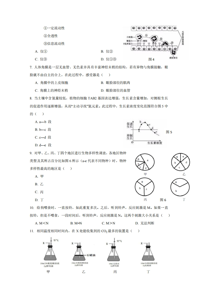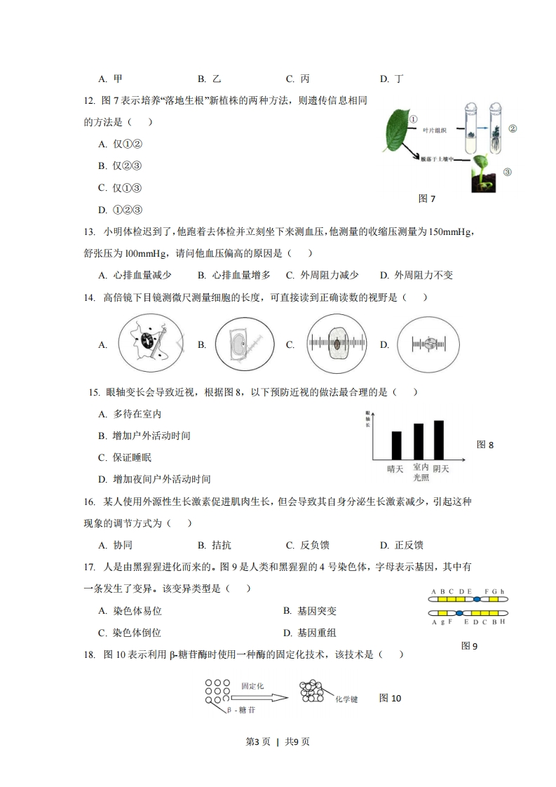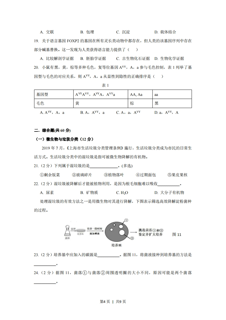 2019上海市普通高中学业水平等级性考试生物试卷考生注意:1,试卷满分100分,考试时间60分钟。2,本考试分设试卷和答题纸。试卷包括两部分,第一部分全部为选择题,第二部分为综合分析题,包括填空愿、选择题和简答思等题型。3.考生应用2B铅笔、钢笔或圆珠笔将答案直接写在答题纸上一、选择题(共40分,每小题2分,每小题只有一个正确答案)1.“雨前椿芽雨后笋,谷雨之前,香椿芽成为人们餐桌上的美食,香椿芽富含的C2+常用用来治疗()A.甲状腺肿大B.肌肉抽搐C.红绿色盲D.贫血2.图1是某动物细胞局部的电子显微镜照片,箭头所指细胞器是()A.细胞核B.大液泡C.内质网D.线粒体3.果蝇某体细胞有8条染色体,在其细胞周期中,仅有8个DNA分子的图1时期是()A.G1期B.S期结束C.G2期D.M期开始4.图2所示,在最适温度和PH下,增大反应速度的方法是()A.增加酶数量速B.增加底物浓度C.增加反应时间底物浓度D.增加温度图25.牛胰核糖核苷酸酶是由124个氨基酸组成的多肽,在尿素和阝巯基乙醇的作用下发生如图3所示变化失去生物活性,则尿素和B巯基乙酸的作用为()A.增大氨基酸数量B.改变氨基酸顺序C.减少氨基酸数量图3D.破坏多肽空间结构6.图4表示血液中白细胞进入组织液的一种方式,此过程体现细胞膜具有()第1页1共9页①一定流动性②全透性蛋白③信息流动性P选择蛋自A.仅①B.仅②C.仅③D.仅①③图47.人体角膜是一层无血管、无色素并具有丰富神经末梢的结构,若有异物与角膜接触,眼脸就不由自主的合上,在此过程中,感受器是()A.角膜中的上皮细胞B.眼脸部位的肌肉C.角膜上的神经末梢D.眼脸部位的血管8.当土壤中含氮量较低,植物的细胞TAB2基因表达增强,生长素含量增加,对侧根生长的促进作用逐渐增强,从而“主动寻找”氮元素。此过程中,生长素浓度变化范围符合图5中的()A.a-b段B.b-c段图5C.c-d段生长素浓度D.d-e段9.对甲、乙、丙、丁四个地区进行生物多样性调查,各地区物种类型及其所占百分比如图6所示(ae代表不同物种)时,物种多样性最高的地区是()甲A.甲B.乙bC.丙D.丁丙图610.给狗喂食时,一直按铃,如此重复多次。之后,听到铃声,反应刺激是M。如果一直按铃,但是不喂食,一段时间后,听到铃声,反应刺激是N。这两个刺激大小关系是()A.MND.无法判断11.相同温度相同时间内,在X处能收集到的C02最多的装置是()空气空气石蜡油10l5八葡箱糖溶液10m5我葡溶10无黄水2g酵母菌2醉得阔2g乳酸同甲丙A.甲B.乙C.丙D.丁12.图7表示培养“落地生根”新植株的两种方法,则遗传信息相同的方法是()叶片组A.仅①②B.仅②③C.仅①③图7D.①②③13.小明体检迟到了,他跑着去体检并立刻坐下来测血压,他测量的收缩压测量为150 nmHg,舒张压为100mmHg,请问他血压偏高的原因是()A.心排血量减少B.心排血量增多C.外周阻力减少D.外周阻力不变14.高倍镜下目镜测微尺测量细胞的长度,可直接读到正确读数的视野是()BD叫15.眼轴变长会导致近视,根据图8,以下预防近视的做法最合理的是()A.多待在室内B.增加户外活动时间图8C.保证睡眠晴天室内阴天D.增加夜间户外活动时间光照16.某人使用外源性生长激素促进肌肉生长,但会导致其自身分泌生长激素减少,引起这种现象的调节方式为()A.协同B.拮抗C.反负馈D.正反馈17.人是由黑猩猩进化而来的。图9是人类和黑猩猩的4号染色体,字母表示基因,其中有一条发生了变异。该变异类型是()ABCDEOTGA.染色体易位B.基因突变O○ABF EDCBHC.染色体倒位D.基因重组图918.图10表示利用B糖苷酶时使用一种酶的固定化技术,该技术是()000固定化Qo0日化学键图10人B-糖苷第3页丨共9页
