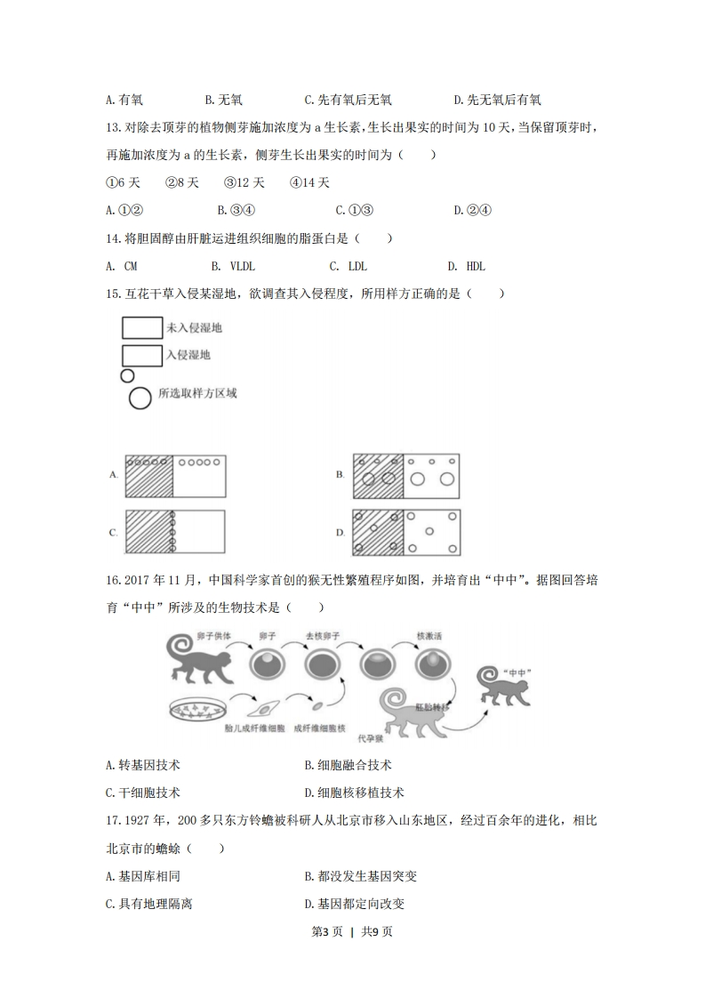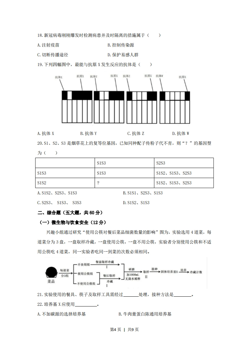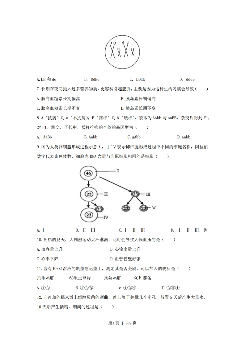 2020年上海市普通高中学业水平等级性考试生物试卷考生注意:1.本试卷满分100分,考试时间60分钟。2.本考试设试卷和答题纸两部分,试卷包括试题与答题要求;所有答题必须涂(选释题)或写(综合愿)在容题纸上:做在试卷上一律不得分。3.答题前,考生务必在答题纸上用钢笔或圆珠笔清楚填写姓名、准考证号,并将核对后的条形码贴在指定位置上。4.答题纸与试卷在试题编号上是一一对应的,答题时应特别注意,不能错位。一、选释题(共40分,每小题2分,每小题只有一个正确答案)1.“芳林新叶催陈叶,流水前波让后波”,新叶中叶绿素的合成必须含有的离子是()A.Mg2B.Fe2C.Zn2D.Caz2.观察1000个酵母菌有丝分裂,根据表格分析时间最长的是(G1期S期440303A.G1期B.G2期C.S期D.M期3.B淋巴细胞分化形成浆细胞和记忆B淋巴细胞,他们相同的是()A.细胞形态相同B.蛋白质相同C.遗传物质相同D.mRNA相同4.HIV通过cd4受体主要感染T淋巴细胞,主要阻断了人体的(A.细胞免疫B.体液免疫C.非特异性免疫D.特异性免疫5.根据表格检测的结果,被检测的物质含有的成分有(双缩脲试剂蓝色苏丹Ⅲ染液橘红色班氏试剂砖红色A脂肪,还原性糖B.蛋白质、脂肪C.蛋白质、还原性糖D.蛋白质,淀粉6.据图有丝分裂后,产生的子代的基因型为()第1页1共9页EA.DE和deB.DdEeC.DDEED.ddee7.长期在夜间摄入过多营养物质,更容易引起肥胖,主要是因为这种生活习惯会导致()A.胰高血糖素长期偏高B.胰岛素长期偏高C.胰高血糖素长期不变D.胰岛素长期不变8.A(抗病)对a(不抗病),B(高杆)对b(矮杆),亲本为AAbb与aaBB,杂交后得到F1,对F1、测交,子代中,矮杆抗病的个体的基因型为()A.AaBbB.AabbC.AAbbD.aabb9.图为人类卵细胞形成过程示意图,I~V表示卵细胞形成过程中不同的细胞名称,阿拉伯数字代表染色体数,细胞内DNA含量与卵原细胞相同的是细胞()62323232323A.IB.ⅡⅢC.IⅡD.IⅡⅢV10.炎热的夏天,人剧烈运动大汗淋漓,此时会导致人低血压的是()A.血容量上升B.心输出量上升C.心率下降D.血管管壁舒张11.盛有H202溶液的瓶盖忘记盖上,测定其是否变质,可以加入的物质是()①生鸡肝②生土豆片③熟鸡肝④炸薯条A.①②B.①②③c.①②④D.②③④12.向冷却的糯米饭上倒酵母菌的酒曲,盖上盖子并戳几个小孔,放置5天后产生大量水,10天后产生酒精,期间的过程是(第2页1共9页A.有氧B.无氧C.先有氧后无氧D.先无氧后有氧13.对除去顶芽的植物侧芽施加浓度为a生长素,生长出果实的时间为10天,当保留顶芽时,再施加浓度为a的生长素,侧芽生长出果实的时间为()①6天②8天③12天④14天A.①②B.③④C.①③D.②④14.将胆固醇由肝脏运进组织细胞的脂蛋白是()A.CMB.VLDLC.LDLD.HDL15.互花干草入侵某湿地,欲调查其入侵程度,所用样方正确的是(未入侵湿地入侵湿地所选取样方区域00000●16.2017年11月,中国科学家首创的猴无性繁殖程序如图,并培育出“中中”。据图回答培育“中中”所涉及的生物技术是()卵子供体卵子去核卵子核激活中”胎儿成纤罐细整成纤雄细腹核代孕A.转基因技术B.细胞融合技术C.干细胞技术D.细胞核移植技术17.1927年,200多只东方铃蟾被科研人从北京市移入山东地区,经过百余年的进化,相比北京市的蟾蜍()A.基因库相同B.都没发生基因突变C.具有地理隔离D.基因都定向改变第3页1共9页
