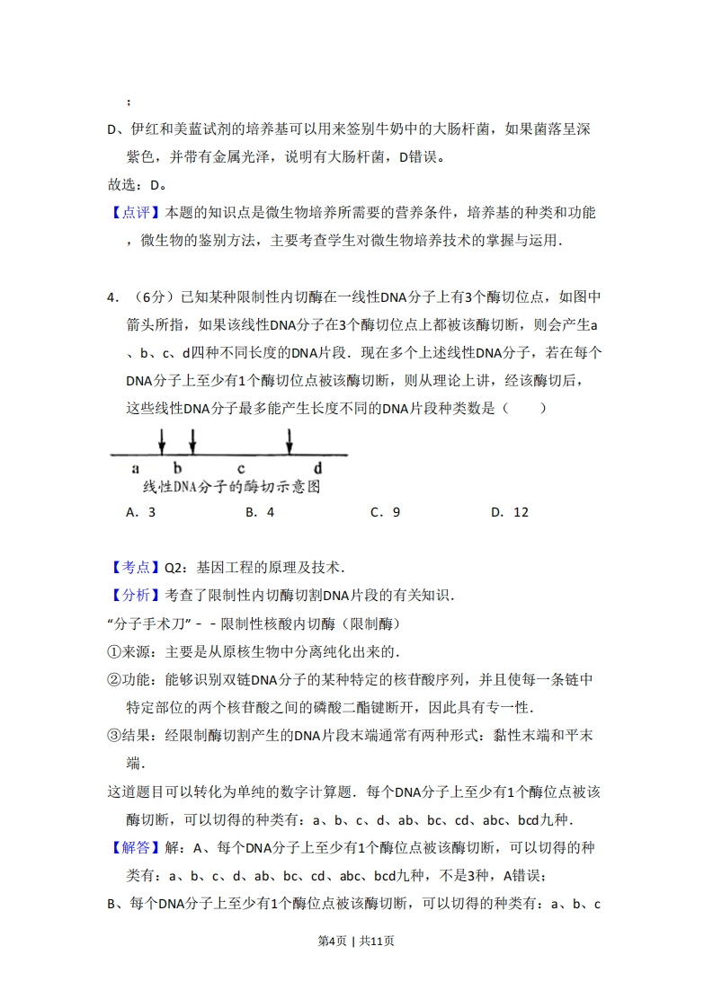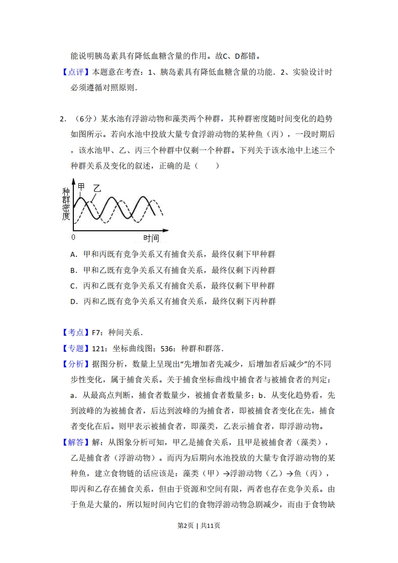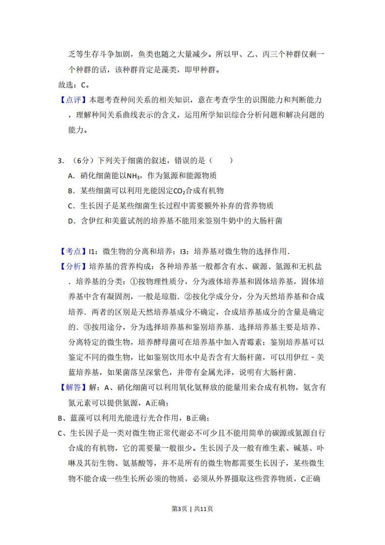 2008年全国统一高考生物试卷(全国卷I)套考答来与试题解析一、选择题(本题共5小题,在每小题给出的四个选项中,只有一项是符合题目要求的.)1.(6分)为了验证胰岛素具有降低血糖含量的作用,在设计实验方案时,如果以正常小鼠每次注射药物前后小鼠症状的变化为观察指标,则下列对实验组小鼠注射药物的顺序正确的是()A.先注射胰岛素溶液,后注射葡萄糖溶液B.先注射胰岛素溶液,再注射胰高血糖素溶液C.先注射胰岛素溶液,后注射生理盐水D.先注射生理盐水,后注射胰岛素溶液【考点】E3:体温调节、水盐调节、血糖调节.【分析】该实验是验证性试验,目的是“验证胰岛素具有降低血糖的作用”,试验对象是“小鼠”,观察指标是“小鼠活动状况”,注射胰岛素溶液后,血糖含量下降,小鼠组织细胞特别是脑组织细胞因血糖供应减少,导致能量供应不足而发生功能障碍,从而出现低血糖症状.注射葡萄糖后,低血糖症状消失,通过自身前后对照说明胰岛素具有降低血糖的作用【解答】解:A、首先注射胰岛素溶液,若胰岛素的浓度对小鼠体内的血糖有降低的作用,那么小鼠被注入胰岛素溶液后变会进入昏迷状态,因为小鼠体内的血糖供应不足。后注射葡萄糖溶液的原因是当小鼠被注入胰岛素溶液后出现昏迷,及时补充葡萄糖,升高血糖浓度,若小鼠注射葡萄糖溶液后恢复正常,则证明胰岛素具有降低血糖含量的作用。故A对。B、如果先注射胰岛素,让它产生低糖的生理反应,这之后注射胰高血糖素,虽然血糖浓度会有所升高,但小鼠的生理反应不明显,实验效果没有注射葡萄糖好。故B错。C、D、注射过胰岛素后,小鼠会出现的低血糖症状,但由于缺乏对照实验,不第1页|共11页能说明胰岛素具有降低血糖含量的作用。故C、D都错。【点评】本题意在考查:1、胰岛素具有降低血糖含量的功能.2、实验设计时必须遵循对照原则.2.(6分)某水池有浮游动物和藻类两个种群,其种群密度随时间变化的趋势如图所示。若向水池中投放大量专食浮游动物的某种鱼(丙),一段时期后,该水池甲、乙、丙三个种群中仅剩一个种群。下列关于该水池中上述三个种群关系及变化的叙述,正确的是()神群密度时间A.甲和丙既有竞争关系又有捕食关系,最终仅剩下甲种群B.甲和乙既有竞争关系又有捕食关系,最终仅剩下丙种群C.丙和乙既有竞争关系又有捕食关系,最终仅剩下甲种群D.丙和乙既有竞争关系又有捕食关系,最终仅剩下丙种群【考点】F7:种间关系【专题】121:坐标曲线图:536:种群和群落.【分析】据图分析,数量上呈现出“先增加者先减少,后增加者后减少”的不同步性变化,属于捕食关系。关于捕食坐标曲线中捕食者与被捕食者的判定:a.从最高点判断,捕食者数量少,被捕食者数量多:b.从变化趋势看,先到波峰的为被捕食者,后达到波峰的为捕食者,即被捕食者变化在先,捕食者变化在后。则甲表示被捕食者,即藻类,乙表示捕食者,即浮游动物。【解答】解:从图象分析可知,甲乙是捕食关系,且甲是被捕食者(藻类),乙是捕食者(浮游动物)。而丙为后期向水池投放的大量专食浮游动物的某种鱼,建立食物链的话应该是:藻类(甲)→浮游动物(乙)→鱼(丙),即丙和乙存在捕食关系,但由于资源和空间有限,两者也存在竞争关系。由于鱼是大量的,所以短时间内它们的食物浮游动物急剧减少,而由于食物缺第2页1共11页乏等生存斗争加剧,鱼类也随之大量减少。所以甲、乙、丙三个种群仅剩一个种群的话,该种群肯定是藻类,即甲种群。故选:C。【点评】本题考查种间关系的相关知识,意在考查学生的识图能力和判断能力,理解种间关系曲线表示的含义,运用所学知识综合分析问题和解决问题的能力。3.(6分)下列关于细菌的叙述,错误的是()A.硝化细菌能以NH3,作为氮源和能源物质B.某些细菌可以利用光能因定C02合成有机物C.生长因子是某些细菌生长过程中需要额外补弃的营养物质D.含伊红和美蓝试剂的培养基不能用来签别牛奶中的大肠杆菌【考点】1:微生物的分离和培养:3:培养基对微生物的选择作用,【分析】培养基的营养构成:各种培养基一般都含有水、碳源、氮源和无机盐,培养基的分类:①按物理性质分,分为液体培养基和固体培养基,固体培养基中含有凝固剂,一般是琼脂.②按化学成分分,分为天然培养基和合成培养.两者的区别是天然培养基成分不确定,合成培养基成分的含量是确定的.③按用途分,分为选择培养基和鉴别培养基.选择培养基主要是培养、分离特定的微生物,培养酵母菌可在培养基中加入青霉素:鉴别培养基可以鉴定不同的微生物,比如鉴别饮用水中是否含有大肠杆菌,可以用伊红-美蓝培养基,如果菌落呈深紫色,并带有金属光泽,说明有大肠杆菌。【解答】解:A、硝化细菌可以利用氧化氨释放的能量用来合成有机物,氨含有氮元素可以提供氮源,A正确:B、蓝藻可以利用光能进行光合作用,B正确:C、生长因子是一类对微生物正常代谢必不可少且不能用简单的碳源或氮源自行合成的有机物,它的需要量一般很少。生长因子及一般有维生素、碱基、卟啉及其衍生物、氨基酸等,并不是所有的微生物都需要生长因子,某些微生物不能合成一些生长所必须的物质,必须从外界摄取这些营养物质,C正确第3页|共11页