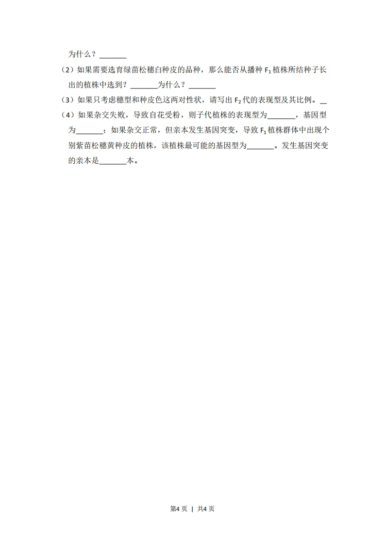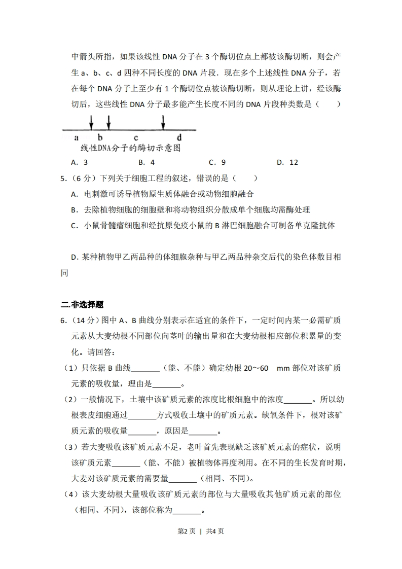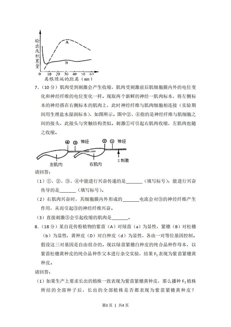 2008年全国统一高考生物试卷(全国卷I)一、选择题(本题共5小题,在每小题给出的四个选项中,只有一项是符合题目要求的.)1.(6分)为了验证胰岛素具有降低血糖含量的作用,在设计实验方案时,如果以正常小鼠每次注射药物前后小鼠症状的变化为观察指标,则下列对实验组小鼠注射药物的顺序正确的是()A.先注射胰岛素溶液,后注射葡萄糖溶液B.先注射胰岛素溶液,再注射胰高血糖素溶液C,先注射胰岛素溶液,后注射生理盐水D.先注射生理盐水,后注射胰岛素溶液2.(6分)某水池有浮游动物和藻类两个种群,其种群密度随时间变化的趋势如图所示。若向水池中投放大量专食浮游动物的某种鱼(丙),一段时期后,该水池甲、乙、丙三个种群中仅剩一个种群。下列关于该水池中上述三个种群关系及变化的叙述,正确的是()群密度时间A.甲和丙既有竞争关系又有捕食关系,最终仅剩下甲种群B.甲和乙既有竞争关系又有捕食关系,最终仅剩下丙种群C.丙和乙既有竞争关系又有捕食关系,最终仅剩下甲种群D.丙和乙既有竞争关系又有捕食关系,最终仅剩下丙种群3.(6分)下列关于细菌的叙述,错误的是()A.硝化细菌能以NH3,作为氮源和能源物质B.某些细菌可以利用光能因定C02合成有机物C.生长因子是某些细菌生长过程中需要额外补弃的营养物质D,含伊红和美蓝试剂的培养基不能用来签别牛奶中的大肠杆菌4.(6分)已知某种限制性内切酶在一线性DNA分子上有3个酶切位点,如图第1页1共4页中箭头所指,如果该线性DNA分子在3个酶切位点上都被该酶切断,则会产生a、b、c、d四种不同长度的DNA片段.现在多个上述线性DNA分子,若在每个DNA分子上至少有1个酶切位点被该酶切断,则从理论上讲,经该酶切后,这些线性DNA分子最多能产生长度不同的DNA片段种类数是()上a b0线性DNA分子的酶切示意图A.3B.4C.9D.125.(6分)下列关于细胞工程的叙述,错误的是()A.电刺激可诱导植物原生质体融合或动物细胞融合B.去除植物细胞的细胞壁和将动物组织分散成单个细胞均需酶处理C.小鼠骨髓瘤细胞和经抗原免疫小鼠的B淋巴细胞融合可制备单克隆抗体D.某种植物甲乙两品种的体细胞杂种与甲乙两品种杂交后代的染色体数目相同二非选择题6.(14分)图中A、B曲线分别表示在适宜的条件下,一定时间内某一必需矿质元素从大麦幼根不同部位向茎叶的输出量和在大麦幼根相应部位积累量的变化。请回答:(1)只依据B曲线(能、不能)确定幼根20~60mm部位对该矿质元素的吸收量,理由是(2)一般情况下,土壤中该矿质元素的浓度比根细胞中的浓度。所以幼根表皮细胞通过方式吸收土壤中的矿质元素。缺氧条件下,根对该矿质元素的吸收量,原因是(3)若大麦吸收该矿质元素不足,老叶首先表现缺乏该矿质元素的症状,说明该矿质元素(能、不能)被植物体再度利用。在不同的生长发育时期,大麦对该矿质元素的需要量(相同、不同)。(4)该大麦幼根大量吸收该矿质元素的部位与大量吸收其他矿质元素的部位(相同、不同),该部位称为第2页1共4页出或积累量0102000500离根顶端的距离(mm)7,(10分)肌肉受到刺激会产生收缩,肌肉受刺激前后肌细胞膜内外的电位变化和神经纤维的电位变化一样。现取两个新鲜的神经一肌肉标本,将左侧标本的神经搭在右侧标本的肌肉上,此时神经纤维与肌肉细胞相连接(实验期间用生理盐水湿润标本),如图所示。图中②、④指的是神经纤维与肌细胞之间的接头,此接头与突触结构类似。刺激①可引起右肌肉收缩,左肌肉也随之收缩。④③神经②①神经s刺激左肌肉右肌肉请回答:(1)①、②、③、④中能进行兴奋传递的是(填写标号):能进行兴奋传导的是(填写标号)。(2)右肌肉兴奋时,其细胞膜内外形成的电流会对③的神经纤维产生作用,从而引起③的神经纤维兴奋。(3)直接刺激③会引起收缩的肌肉是8.(18分)某自花传粉植物的紫苗(A)对绿苗(a)为显性,紧穗(B)对松穗(b)为显性,黄种皮(D)对白种皮(d)为显性,各由一对等位基因控制。假设这三对基因是自由组合的。现以绿苗紧穗白种皮的纯合品种作母本,以紫苗松穗黄种皮的纯合品种作父本进行杂交实验,结果「1表现为紫苗紧穗黄种皮。请回答:(1)如果生产上要求长出的植株一致表现为紫苗紧穗黄种皮,那么播种F:植株所结的全部种子后,长出的全部植株是否都表现为紫苗紧穗黄种皮?第3页1共4页