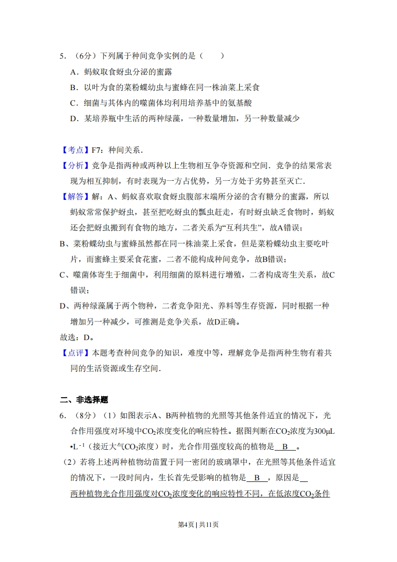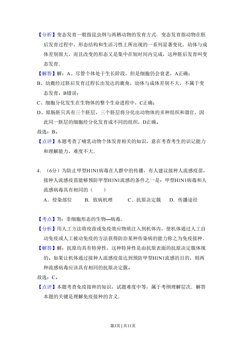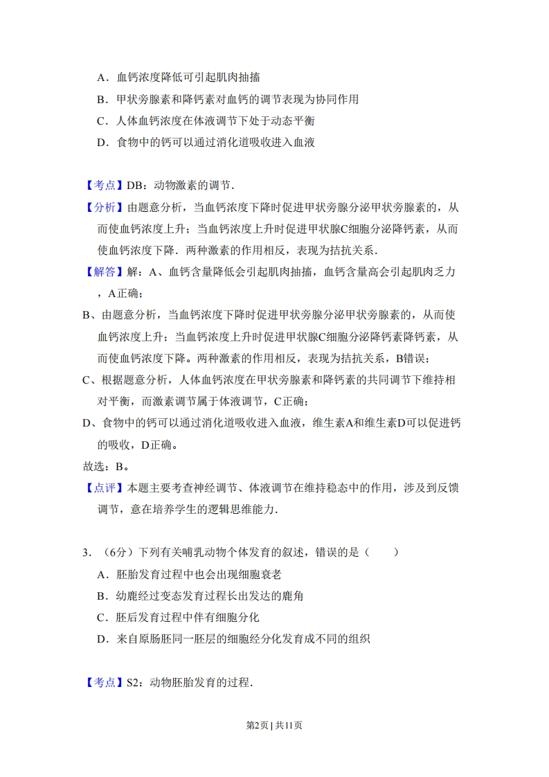 2009年全国统一高考生物试卷(全国卷Ⅱ)事考答案与试题佩折一、选择题(本题共5小题。在每小题给出的四个选项中,只有一项是符合题目要求的.)1.(6分)下列关于细胞呼吸的叙述,错误的是()A.细胞呼吸必须在酶的催化下进行B.人体硬骨组织细胞也进行呼吸C.酵母菌可以进行有氧呼吸和无氧呼吸D.叶肉细胞在光照下进行光合作用,不进行呼吸作用【考点】30:细胞呼吸的过程和意义,【分析】此题是一道基础知识题,具体考查的是呼吸作用的知识.呼吸作用的意义是为生命活动提供能量,条件是有光无光都能进行,原料是有机物和氧气,部位是细胞的线粒体中进行,【解答】解:A、不论有氧呼吸还是无氧呼吸,有机物的分解都必须在酶的催化作用下进行,A正确:B、人体硬骨组织细胞是活细胞,也能进行呼吸,B正确:C、酵母菌可以进行有氧呼吸和无氧呼吸,有氧呼吸产生二氧化碳和水,无氧呼吸产生酒精和二氧化碳,C正确:D、叶肉细胞在光照下进行光合作用,同时也进行呼吸作用,D错误。故选:D。【点评】呼吸作用的条件是有光无光都能进行,呼吸作用分为有氧呼吸和无氧呼吸两种类型,注意区别两种呼吸类型的条件和产物.2.(6分)人体甲状旁腺分泌甲状旁腺素,当人体血钙浓度下降时,甲状旁腺素分泌增加,作用于骨和肾脏使血钙浓度上升.甲状腺C细胞分泌降钙素,当血钙浓度上升时,降钙素分泌增加,作用于骨等使血钙浓度下降.下列关于血钙的叙述,错误的是()第1页1共11页A.血钙浓度降低可引起肌肉抽搐B.甲状旁腺素和降钙素对血钙的调节表现为协同作用C.人体血钙浓度在体液调节下处于动态平衡D.食物中的钙可以通过消化道吸收进入血液【考点】DB:动物激素的调节.【分析】由题意分析,当血钙浓度下降时促进甲状旁腺分泌甲状旁腺素的,从而使血钙浓度上升:当血钙浓度上升时促进甲状腺C细胞分泌降钙素,从而使血钙浓度下降.两种激素的作用相反,表现为拮抗关系,【解答】解:A、血钙含量降低会引起肌肉抽搐,血钙含量高会引起肌肉乏力,A正确;B、由题意分析,当血钙浓度下降时促进甲状旁腺分泌甲状旁腺素的,从而使血钙浓度上升:当血钙浓度上升时促进甲状腺C细胞分泌降钙素降钙素,从而使血钙浓度下降。两种激素的作用相反,表现为拮抗关系,B错误:C、根据题意分析,人体血钙浓度在甲状旁腺素和降钙素的共同调节下维持相对平衡,而激素调节属于体液调节,C正确:D、食物中的钙可以通过消化道吸收进入血液,维生素A和维生素D可以促进钙的吸收,D正确。故选:B。【点评】本题主要考查神经调节、体液调节在维持稳态中的作用,涉及到反馈调节,意在培养学生的逻辑思维能力,3.(6分)下列有关哺乳动物个体发育的叙述,错误的是()A,胚胎发育过程中也会出现细胞衰老B.幼鹿经过变态发育过程长出发达的鹿角C.胚后发育过程中伴有细胞分化D.来自原肠胚同一胚层的细胞经分化发育成不同的组织【考点】S2:动物胚胎发育的过程.第2页1共11页【分析】变态发育一般指昆虫纲与两栖动物的发育方式.变态发育指动物在胚后发育过程中,形态结构和生活习性上所出现的一系列显著变化.幼体与成体差别很大,而且改变的形态又是集中在短时间内完成,这种胚后发育叫变态发育【解答】解:A、尽管个体处于生长阶段,但是细胞仍会衰老,A正确:B、幼鹿经过胚后发育过程长出发达的鹿角,幼体与成体差别不大,不属于变态发育,B错误:C、细胞分化发生在生物体的整个生命进程中,C正确:D、原肠胚只具有三个胚层,三个胚层将分化出动物体的多种组织和器官,因此同一胚层的细胞经分化发育成不同的组织,D正确。故选:B。【点评】本题考查了哺乳动物个体发育相关的知识,意在考查考生的识记能力和理解能力,难度不大4.(6分)为防止甲型H1N1病毒在人群中的传播,有人建议接种人流感疫苗,接种人流感疫苗能够预防甲型H1N1流感的条件之一是:甲型H1N1病毒和人流感病毒具有相同的()A.侵染部位B.致病机理C.抗原决定簇D.传播途径【考点】刀:非细胞形态的生物一病毒,【分析】用人工方法将疫苗或免疫效应物质注入到机体内,使机体通过人工自动免疫或人工被动免疫的方法获得防治某种传染病的能力称之为免疫接种.【解答】解:抗原均具有特异性,这种特异性是由抗原表面的抗原决定簇体现的。如果让机体通过接种人流感疫苗达到预防甲型HN1流感的目的,则两种流感病毒应该具有相同的抗原决定簇。故选:C。【点评】本题考查免疫接种的知识,试题难度中等,属于考纲理解层次.解答本题的关键是理解免疫接种的含义.第3页1共11页