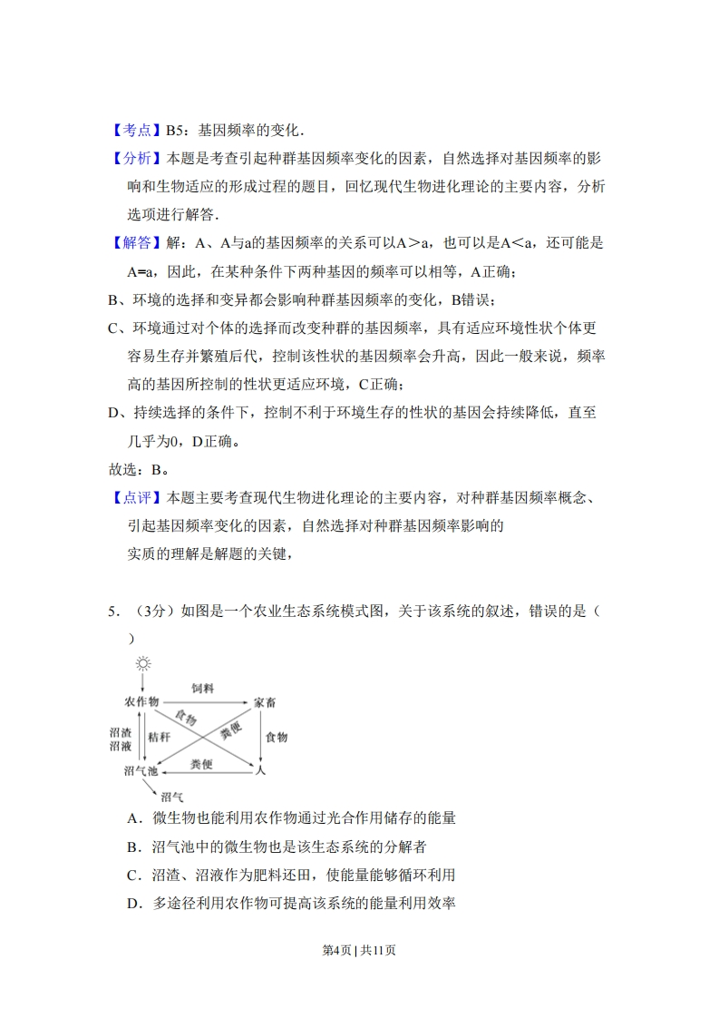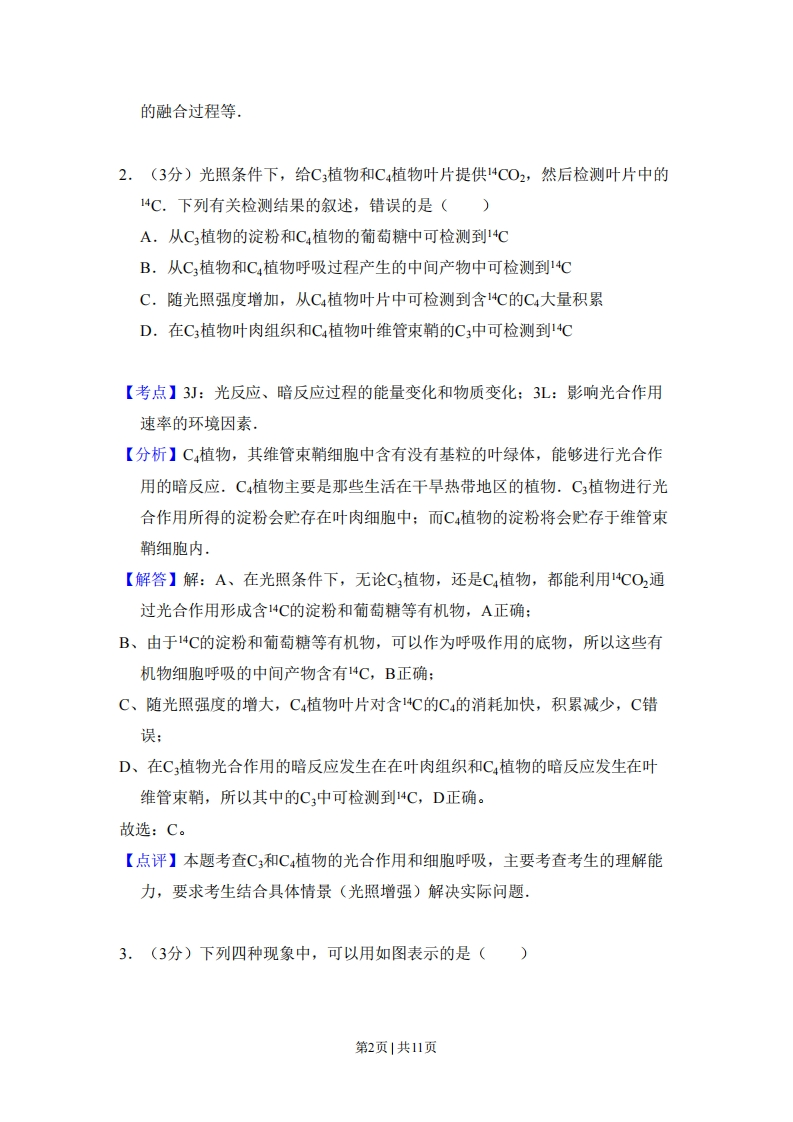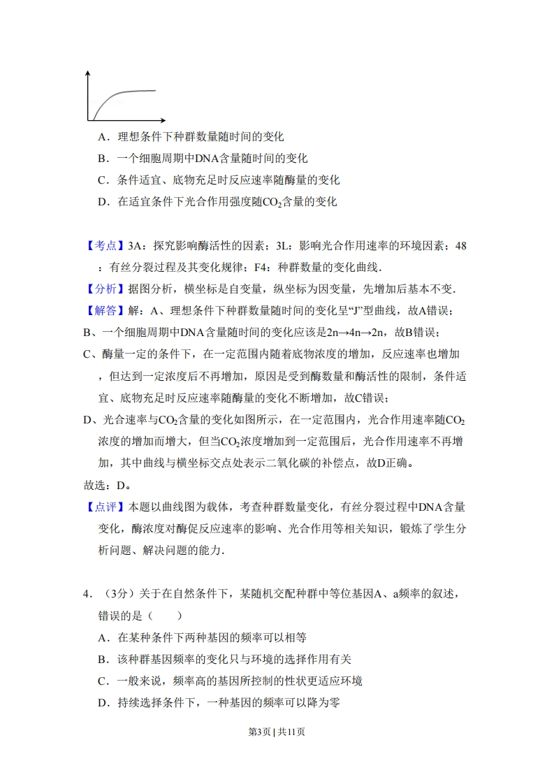 2010年全国统一高考生物试卷(全国卷1)事考答案与试题佩折一、选择题(共5小题,每小题3分,满分15分)1.(3分)下列过程中,不直接依赖细胞膜的流动性就能完成的是()A,胰岛B细胞分泌胰岛素B.吞噬细胞对抗原的摄取C.mRNA与游离核糖体的结合D.植物体细胞杂交中原生质体融合【考点】23:细胞膜的结构特点.【分析】本题考查了细胞膜的功能特点和物质的跨膜运输的方式.细胞膜的特点分为:1、结构特点:流动性.2、功能特点:选择透过性.由此答题,【解答】解:有分析可知:A、胰岛B细胞分泌胰岛素中胰岛素是分泌蛋白质,需要由细胞核提供的DNA合成RNA运出细胞核,并和核糖体结合,在核糖体合成肽链、内质网初步加工、高尔基体加工成成熟的蛋白质,再通过小泡运输到细胞膜,分泌出去。这个过程直接依赖细胞膜的流动性就能完成,A不符合题意:B、吞噬细胞对抗原的摄取是胞吞过程,胞吞需要能量,细胞膜此时发生形变,细胞膜物质发生运动,才能启动胞吞和胞吐过程,这个过程直接依赖细胞膜的流动性就能完成,B不符合题意:C、RNA在细胞核中合成后,通过核膜上的核孔进入细胞质与核糖体结合,该过程不直接依赖细胞膜的流动性就能完成,C符合题意:D、植物体细胞杂交中原生质体融合物细胞融合和植物原生质体融合的基本原理相同,都是利用了细胞膜的流动性,这个过程直接依赖细胞膜的流动性就能完成,D不符合题意。故选:C。【点评】本题考查了细胞膜的功能特点和物质的跨膜运输的方式及特点,还要理解内膜系统的结构和功能特点,并且知道免疫过程、转录、翻译和原生质第1页1共11页的融合过程等.2.(3分)光照条件下,给C3植物和C4植物叶片提供14C02,然后检测叶片中的14C.下列有关检测结果的叙述,错误的是()A.从C,植物的淀粉和C4植物的葡萄糖中可检测到14CB.从C,植物和C4植物呼吸过程产生的中间产物中可检测到14CC.随光照强度增加,从C4植物叶片中可检测到含14℃的C4大量积累D.在C3植物叶肉组织和C4植物叶维管束鞘的C3中可检测到14℃【考点】3J:光反应、暗反应过程的能量变化和物质变化:3L:影响光合作用速率的环境因素,【分析】C4植物,其维管束鞘细胞中含有没有基粒的叶绿体,能够进行光合作用的暗反应.C4植物主要是那些生活在干旱热带地区的植物.C3植物进行光合作用所得的淀粉会贮存在叶肉细胞中:而C4植物的淀粉将会贮存于维管束鞘细胞内.【解答】解:A、在光照条件下,无论C3植物,还是C4植物,都能利用4CO2通过光合作用形成含14C的淀粉和葡萄糖等有机物,A正确:B、由于14C的淀粉和葡萄糖等有机物,可以作为呼吸作用的底物,所以这些有机物细胞呼吸的中间产物含有14C,B正确:C、随光照强度的增大,C4植物叶片对含14℃的C4的消耗加快,积累减少,C错误:D、在C:植物光合作用的暗反应发生在在叶肉组织和C4植物的暗反应发生在叶维管束鞘,所以其中的C3中可检测到14C,D正确。故选:C。【点评】本题考查C3和C4植物的光合作用和细胞呼吸,主要考查考生的理解能力,要求考生结合具体情景(光照增强)解决实际问题.3.(3分)下列四种现象中,可以用如图表示的是()第2页1共11页A.理想条件下种群数量随时间的变化B,一个细胞周期中DNA含量随时间的变化C.条件适宜、底物充足时反应速率随酶量的变化D.在适宜条件下光合作用强度随CO2含量的变化【考点】3A:探究影响酶活性的因素:3L:影响光合作用速率的环境因素:48:有丝分裂过程及其变化规律:F4:种群数量的变化曲线【分析】据图分析,横坐标是自变量,纵坐标为因变量,先增加后基本不变【解答】解:A、理想条件下种群数量随时间的变化呈型曲线,故A错误:B、一个细胞周期中DNA含量随时间的变化应该是2n→4n→2n,故B错误:C、酶量一定的条件下,在一定范围内随着底物浓度的增加,反应速率也增加,但达到一定浓度后不再增加,原因是受到酶数量和酶活性的限制,条件适宜、底物充足时反应速率随酶量的变化不断增加,故C错误:D、光合速率与CO2含量的变化如图所示,在一定范围内,光合作用速率随CO2浓度的增加而增大,但当CO2浓度增加到一定范围后,光合作用速率不再增加,其中曲线与横坐标交点处表示二氧化碳的补偿点,故D正确。故选:D。【点评】本题以曲线图为载体,考查种群数量变化,有丝分裂过程中DNA含量变化,酶浓度对酶促反应速率的影响、光合作用等相关知识,锻炼了学生分析问题、解决问题的能力,4.(3分)关于在自然条件下,某随机交配种群中等位基因A、频率的叙述,错误的是()A.在某种条件下两种基因的频率可以相等B.该种群基因频率的变化只与环境的选择作用有关C.一般来说,频率高的基因所控制的性状更适应环境D.持续选择条件下,一种基因的频率可以降为零第3页1共11页