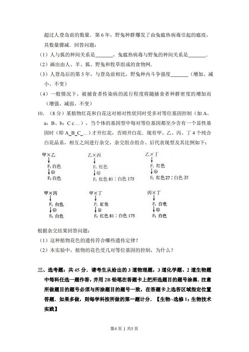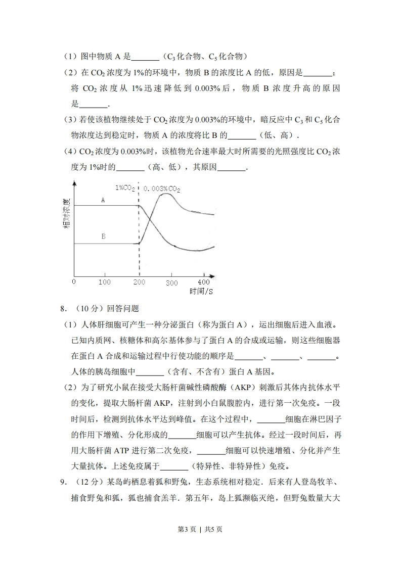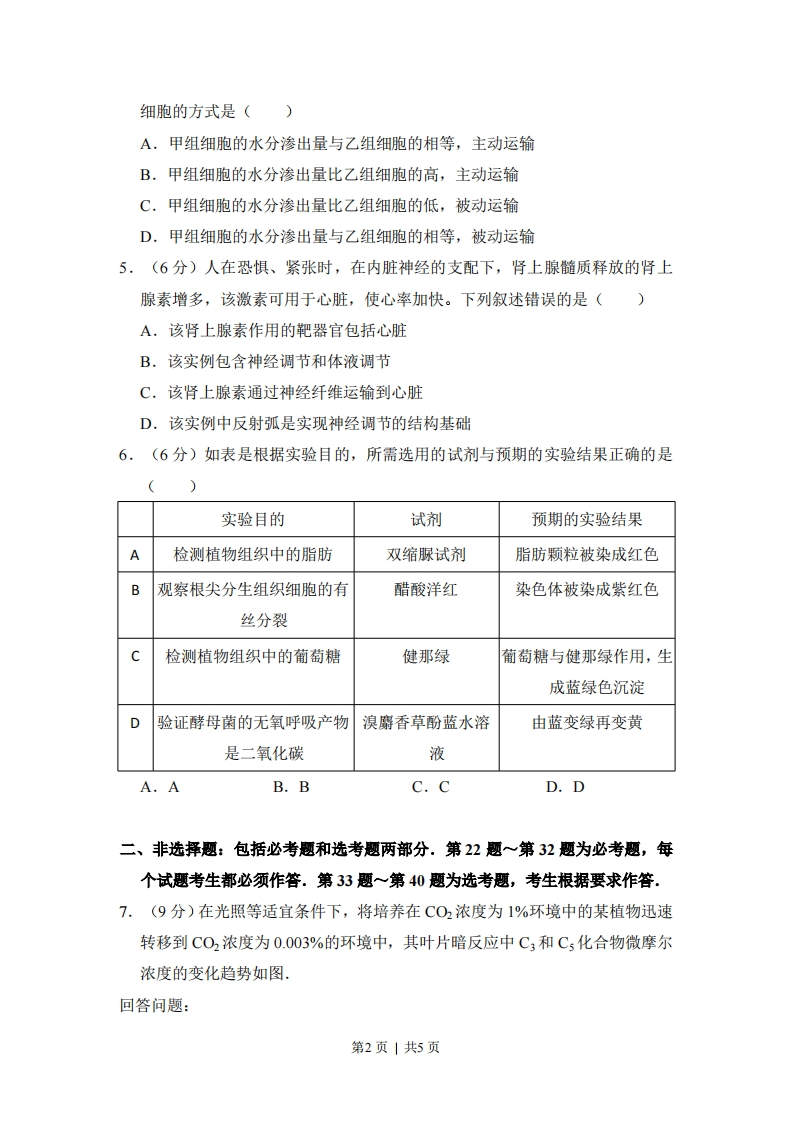 2011年全国统一高考生物试卷(新课标)一、选择题:本大题共6小题,每小题6分.在每小题给出的四个选项中,只有一项是符合题目要求的.1.(6分)将人的红细胞放入4℃蒸馏水中,一段时间后红细胞破裂,主要原因是()A,红细胞具有水溶性B.红细胞的液泡体积增大C.蒸馏水大量进入红细胞D.低温时红细胞膜流动性增大2.(6分)A、B两种酶用同一种蛋白酶处理,酶活性与处理时间的关系如图所示.下列分析错误的是()程甲衡乙酶时间A.甲酶能够抗该种蛋白酶降解B.甲酶不可能是具有催化功能的RNAC.乙酶的化学本质为蛋白质D.乙酶活性的改变是因为其分子结构的改变3,(6分)番茄幼苗在缺镁的培养液中培养一段时间后,与对照组相比,其叶片光合作用强度下降,原因是()A.光反应强度升高,暗反应强度降低B.光反应强度降低,暗反应强度降低C.光反应强度不变,暗反应强度降低D.光反应强度降低,暗反应强度不变4.(6分)取紫色洋葱外表皮,分为两份,假定两份外表皮细胞的大小、数目和生理状态一致,一份在完全营养液中浸泡一段时间,浸泡后的外表皮称为甲组:另一份在蒸馏水中浸泡相同的时间,浸泡后的外表皮称为乙组.然后,两组外表皮都用浓度为0.3gL的蔗糖溶液里处理,一段时间后外表皮细胞中的水分不再减少,此时甲、乙两组细胞水分渗出量的大小,以及水分运出第1页|共5页细胞的方式是()A,甲组细胞的水分渗出量与乙组细胞的相等,主动运输B.甲组细胞的水分渗出量比乙组细胞的高,主动运输C,甲组细胞的水分渗出量比乙组细胞的低,被动运输D.甲组细胞的水分渗出量与乙组细胞的相等,被动运输5,(6分)人在恐惧、紧张时,在内脏神经的支配下,肾上腺髓质释放的肾上腺素增多,该激素可用于心脏,使心率加快。下列叙述错误的是()A.该肾上腺素作用的靶器官包括心脏B.该实例包含神经调节和体液调节C.该肾上腺素通过神经纤维运输到心脏D.该实例中反射弧是实现神经调节的结构基础6.(6分)如表是根据实验目的,所需选用的试剂与预期的实验结果正确的是实验目的试剂预期的实验结果检测植物组织中的脂肪双缩脲试剂脂肪颗粒被染成红色6观察根尖分生组织细胞的有醋酸洋红染色体被染成紫红色丝分裂检测植物组织中的葡萄糖健那绿葡萄糖与健那绿作用,生成蓝绿色沉淀0验证酵母菌的无氧呼吸产物溴麝香草酚蓝水溶由蓝变绿再变黄是二氧化碳液A.AB.BC.CD.D二、非选择题:包括必考题和选考题两部分.第22题~第32题为必考题,每个试题考生都必须作答.第33题~第40题为选考题,考生根据要求作答.7.(9分)在光照等适宜条件下,将培养在CO2浓度为1%环境中的某植物迅速转移到CO2浓度为0.003%的环境中,其叶片暗反应中C;和C5化合物微摩尔浓度的变化趋势如图。回答问题:第2页|共5页(1)图中物质A是(C3化合物、Cs化合物)(2)在CO2浓度为1%的环境中,物质B的浓度比A的低,原因是将CO2浓度从1%迅速降低到0.003%后,物质B浓度升高的原因是(3)若使该植物继续处于CO2浓度为0.003%的环境中,暗反应中C3和C5化合物浓度达到稳定时,物质A的浓度将比B的(低、高).(4)CO2浓度为0.003%时,该植物光合速率最大时所需要的光照强度比CO2浓度为1%时的(高、低),其原因1%00210.003%C02AB1上10020030040时间/S8.(10分)回答问题(1)人体肝细胞可产生一种分泌蛋白(称为蛋白A),运出细胞后进入血液。已知内质网、核糖体和高尔基体参与了蛋白A的合成或运输,则这些细胞器在蛋白A合成和运输过程中行使功能的顺序是人体的胰岛细胞中(含有、不含有)蛋白A基因。(2)为了研究小鼠在接受大肠杆菌碱性磷酸酶(AKP)刺激后其体内抗体水平的变化,提取大肠杆菌AKP,注射到小白鼠腹腔内,进行第一次免疫。一段时间后,检测到抗体水平达到峰值。在这个过程中,细胞在淋巴因子的作用下增殖、分化形成的细胞可以产生抗体。经过一段时间后,再用大肠杆菌ATP进行第二次免疫,细胞可以快速增殖、分化并产生大量抗体。上述免疫属于(特异性、非特异性)免疫。9.(12分)某岛屿栖息着狐和野兔,生态系统相对稳定.后来有人登岛牧羊、捕食野兔和狐,狐也捕食羔羊,第五年,岛上狐濒临灭绝,但野兔数量大大第3页|共5页
