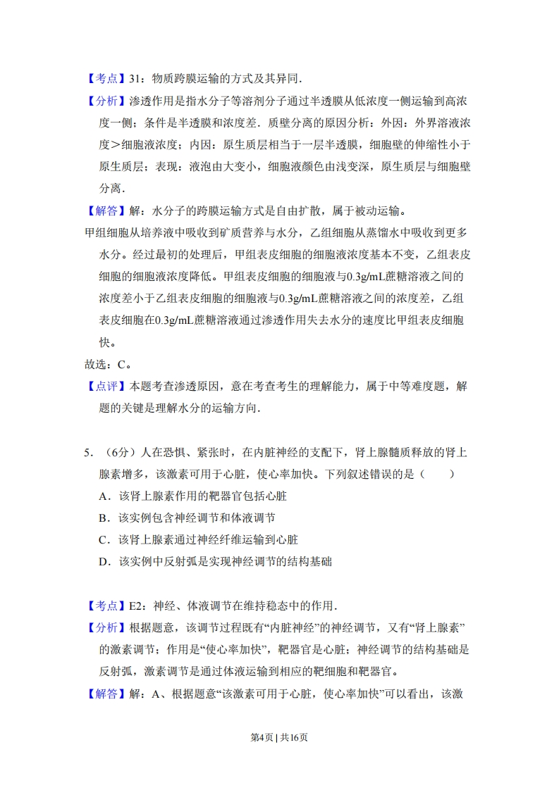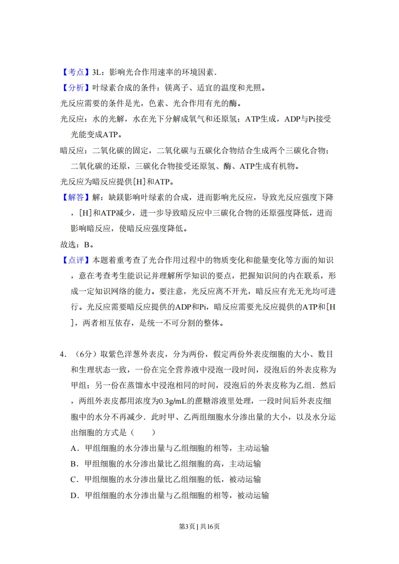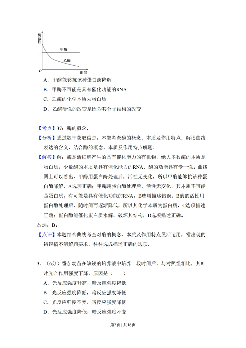 2011年全国统一高考生物试卷(新课标)事考答案与试题佩折一、选择题:本大题共6小题,每小题6分,在每小题给出的四个选项中,只有一项是符合题目要求的.1.(6分)将人的红细胞放入4℃蒸馏水中,一段时间后红细胞破裂,主要原因是(A.红细胞具有水溶性B.红细胞的液泡体积增大C.蒸馏水大量进入红细胞D.低温时红细胞膜流动性增大【考点】22:细胞膜的制备方法.【分析】人和哺乳动物的成熟红细胞内没有细胞核、线粒体等细胞器,是制备细胞膜的好材料,方法即是将红细胞置于低渗溶液如蒸馏水中,使之渗透吸水而胀破,【解答】解:A、细胞膜的基本骨架是磷脂双分子层,而磷脂分子的头部具有亲水性,故A错误:B、人的红细胞属于动物细胞,没有像成熟植物细胞那样的大液泡,故B错误:C、由于细胞膜具有选择透过性,放在蒸馏水中,由于外界浓度低于细胞内浓度,导致吸水涨破,故C正确:D、温度降低时,细胞膜的流动性减弱,故D错误。故选:C。【点评】本题主要考察制备细胞膜的方法与原理,涉及细胞膜的结构、动物细胞结构、渗透作用和细胞膜的结构特点,但难度不大2.(6分)A、B两种酶用同一种蛋白酶处理,酶活性与处理时间的关系如图所示.下列分析错误的是()第1页1共16页活性甲衡乙酶时向A,甲酶能够抗该种蛋白酶降解B.甲酶不可能是具有催化功能的RNAC.乙酶的化学本质为蛋白质D.乙酶活性的改变是因为其分子结构的改变【考点】37:酶的概念,【分析】通过题干获取信息,本题考查酶的概念、本质及作用特点.解读曲线表达的含义,结合酶的概念、本质及作用特点解题【解答】解:酶是活细胞产生的具有催化能力的有机物,绝大多数酶的本质是蛋白质,少数酶的本质是具有催化能力的RNA.酶的功能具有专一性。曲线图上可以看出,甲酶用蛋白酶处理后,活性无变化,所以甲酶能够抗该种蛋白酶降解,A选项正确:甲酶用蛋白酶处理后,活性无变化,其本质不可能是蛋白质,有可能是具有催化功能的RNA,B选项描述错误;B酶的活性用蛋白酶处理后,随时间而逐渐降低,所以其化学本质为蛋白质,C选项描述正确:蛋白酶能催化蛋白质水解,破坏其结构,D选项描述正确。故选:B。【点评】本题结合曲线考查对酶的概念、本质及作用特点灵活运用,常出现的错误搞不清解题要求,往往选成描述正确的选项,3.(6分)番茄幼苗在缺镁的培养液中培养一段时间后,与对照组相比,其叶片光合作用强度下降,原因是()A.光反应强度升高,暗反应强度降低B.光反应强度降低,暗反应强度降低C.光反应强度不变,暗反应强度降低D.光反应强度降低,暗反应强度不变第2页|共16页【考点】3L:影响光合作用速率的环境因素,【分析】叶绿素合成的条件:镁离子、适宜的温度和光照。光反应需要的条件是光,色素、光合作用有光的酶。光反应:水的光解,水在光下分解成氧气和还原氢:ATP生成,ADP与Pi接受光能变成ATP。暗反应:二氧化碳的固定,二氧化碳与五碳化合物结合生成两个三碳化合物:二氧化碳的还原,三碳化合物接受还原氢、酶、ATP生成有机物。光反应为暗反应提供[H]和ATP。【解答】解:缺鎂影响叶绿素的合成,进而影响光反应,导致光反应强度下降,[H)和ATP减少,进一步导致暗反应中三碳化合物的还原强度降低,进而影响暗反应,使暗反应强度降低。故选:B。【点评】本题着重考查了光合作用过程中的物质变化和能量变化等方面的知识,意在考查考生能识记并理解所学知识的要点,把握知识间的内在联系,形成一定知识网络的能力。要注意,光反应离不开光,暗反应有光无光均可进行。光反应需要暗反应提供的ADP和Pi,暗反应需要光反应提供的ATP和[H],两者相互依存,是统一不可分割的整体。4.(6分)取紫色洋葱外表皮,分为两份,假定两份外表皮细胞的大小、数目和生理状态一致,一份在完全营养液中浸泡一段时间,浸泡后的外表皮称为甲组:另一份在蒸馏水中浸泡相同的时间,浸泡后的外表皮称为乙组.然后,两组外表皮都用浓度为0.3gmL的蔗糖溶液里处理,一段时间后外表皮细胞中的水分不再减少,此时甲、乙两组细胞水分渗出量的大小,以及水分运出细胞的方式是()A,甲组细胞的水分渗出量与乙组细胞的相等,主动运输B.甲组细胞的水分渗出量比乙组细胞的高,主动运输C,甲组细胞的水分渗出量比乙组细胞的低,被动运输D.甲组细胞的水分渗出量与乙组细胞的相等,被动运输第3页1共16页