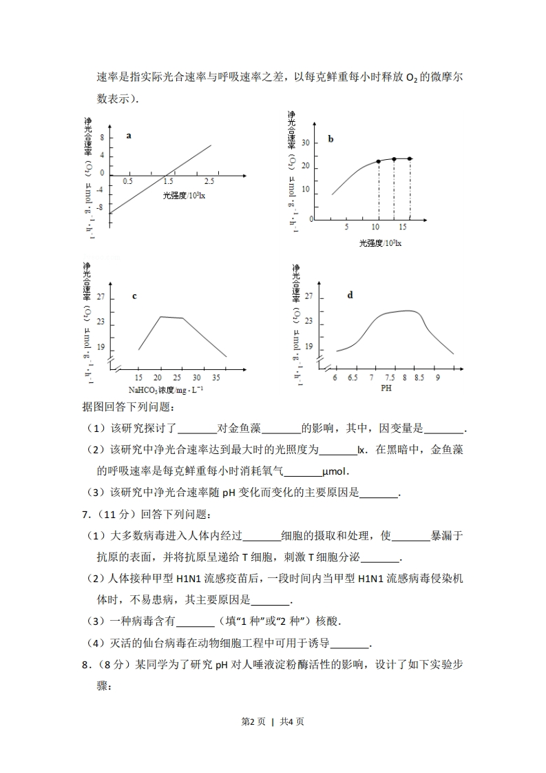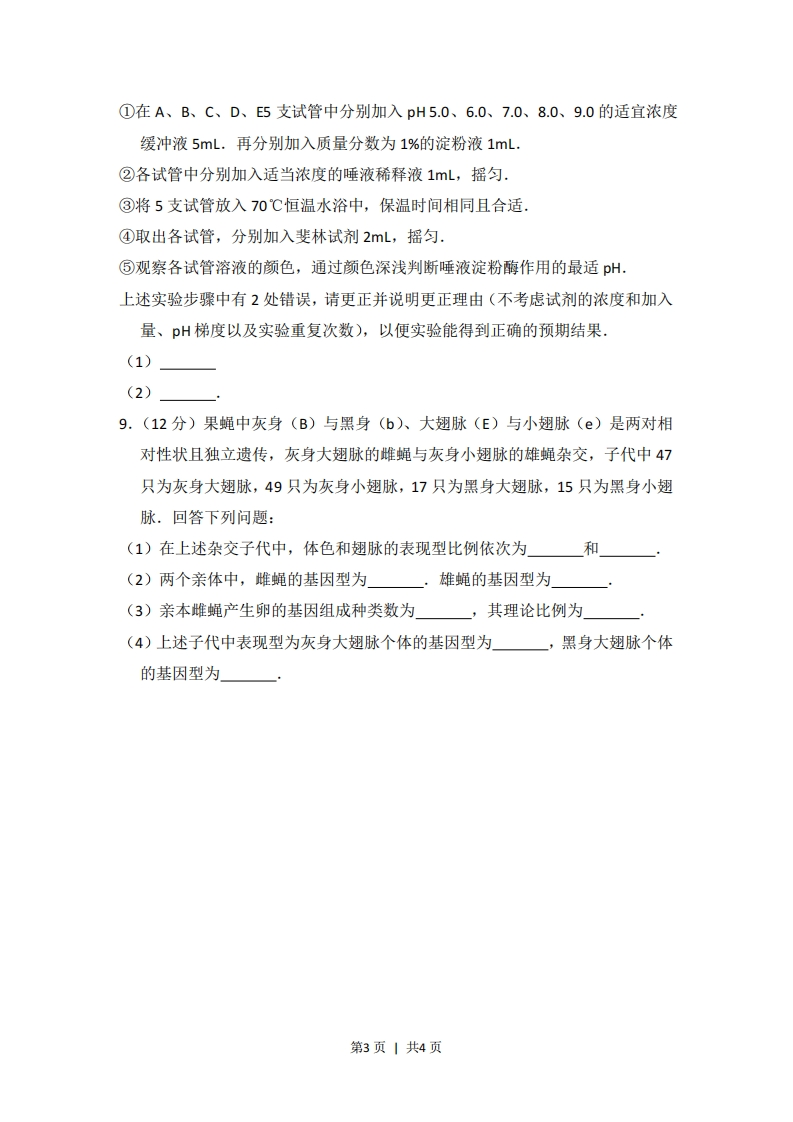 2012年全国统一高考生物试卷(大纲版)一、选择题(共5小题)1.下列关于膝跳反射的叙述,错误的是()A.反射活动由一定的刺激引起B.反射活动中兴奋在突触处双向传递C.反射活动的发生需要反射弧结构完整D.反射活动中需要神经递质参与兴奋的传递2.下列关于叶绿体和线粒体的叙述,正确的是()A.线粒体和叶绿体均含有少量的DNAB.叶绿体在光下和黑暗中均能合成ATPC.细胞生命活动所需的ATP均来自线粒体D.线粒体基质和叶绿体基质所含酶的种类相同3,一块农田中有豌豆、杂草、田鼠和土壤微生物等生物,其中属于竞争关系的是()A.田鼠和杂草B.豌豆和杂草C.豌豆和其根中的根瘤菌D.细菌和其细胞内的噬菌体4.下列关于森林群落垂直结构的叙述错误的是()A.群落中的植物具有垂直分层现象B.群落中的动物具有垂直分层现象C.动物在群落中的垂直分层与植物的分层有关D.乔木层的疏密程度不会影响草木层的水平结构5.关于细菌的叙述,正确的是()A.不同种类细菌的生长均需要相同的碳源B.常用液体培养基分离获得细菌单菌落C,细菌大量培养过程中,芽孢形成于细菌生长的调整期D.培养基中含有高浓度NaC有利于金黄色葡萄球菌的筛选二、解答题(共4小题)6,(11分)金鱼藻是一种高等沉水植物,有关研究结果如图所示(图中净光合第1页1共4页速率是指实际光合速率与呼吸速率之差,以每克鲜重每小时释放O2的微摩尔数表示).净光合速事净光合速率0b5200.51.5234mol'g10光强度10s10光强度10x净光合速率净光合速率()27d231919152025303566.577.588.59NHC0浓度mgLPH据图回答下列问题:(1)该研究探讨了对金鱼藻的影响,其中,因变量是(2)该研究中净光合速率达到最大时的光照度为x.在黑暗中,金鱼藻的呼吸速率是每克鲜重每小时消耗氧气umol.(3)该研究中净光合速率随pH变化而变化的主要原因是7.(11分)回答下列问题:(1)大多数病毒进入人体内经过细胞的摄取和处理,使暴漏于抗原的表面,并将抗原呈递给T细胞,刺激T细胞分泌(2)人体接种甲型H1N1流感疫苗后,一段时间内当甲型H1N1流感病毒侵染机体时,不易患病,其主要原因是(3)一种病毒含有(填“1种”或“2种”)核酸.(4)灭活的仙台病毒在动物细胞工程中可用于诱导8.(8分)某同学为了研究p州对人唾液淀粉酶活性的影响,设计了如下实验步骤:第2页1共4页①在A、B、C、D、E5支试管中分别加入pH5.0、6.0、7.0、8.0、9.0的适宜浓度缓冲液5mL.再分别加入质量分数为1%的淀粉液1mL.②各试管中分别加入适当浓度的唾液稀释液1mL,摇匀.③将5支试管放入70℃恒温水浴中,保温时间相同且合适.④取出各试管,分别加入斐林试剂2mL,摇匀.⑤观察各试管溶液的颜色,通过颜色深浅判断唾液淀粉酶作用的最适p州.上述实验步骤中有2处错误,请更正并说明更正理由(不考虑试剂的浓度和加入量、pH梯度以及实验重复次数),以便实验能得到正确的预期结果.(1)(2)9.(12分)果蝇中灰身(B)与黑身(b)、大翅脉(E)与小翅脉(e)是两对相对性状且独立遗传,灰身大翅脉的雌蝇与灰身小翅脉的雄蝇杂交,子代中47只为灰身大翅脉,49只为灰身小翅脉,17只为黑身大翅脉,15只为黑身小翅脉.回答下列问题:(1)在上述杂交子代中,体色和翅脉的表现型比例依次为和(2)两个亲体中,雌蝇的基因型为雄蝇的基因型为(3)亲本雌蝇产生卵的基因组成种类数为,其理论比例为(4)上述子代中表现型为灰身大翅脉个体的基因型为,黑身大翅脉个体的基因型为第3页1共4页