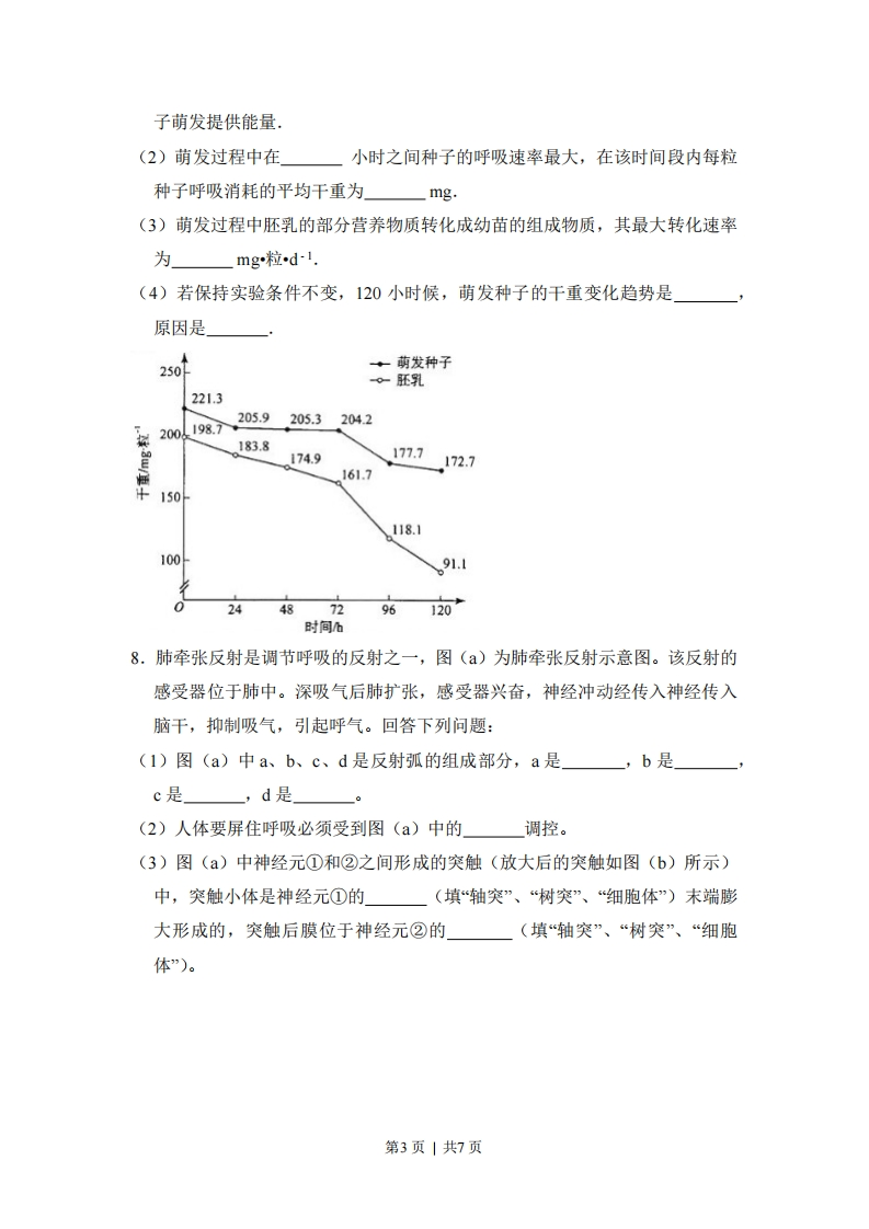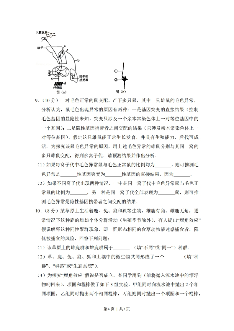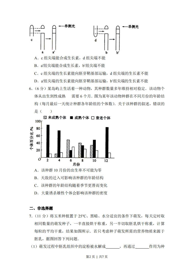 2012年全国统一高考生物试卷(新课标)一、选择题:每小题6分,共36分1.(6分)同一物种的两类细胞各产生一种分泌蛋白,组成这两种蛋白质的各种氨基酸含量相同,但排列顺序不同。其原因是参与这两种蛋白质合成的()A.RNA种类不同B.mRNA碱基序列不同C.核糖体成分不同D.同一密码子所决定的氨基酸不同2.(6分)下列关于细胞癌变的叙述,错误的是()A.癌细胞在适宜条件时可无限增殖B.癌变前后,细胞的形态和结构有明显差别C.病毒癌基因可整合到宿主基因组诱发癌变D,原癌基因的主要功能是阻止细胞发生异常增殖3.6分)哺乳动物因长时间未饮水导致机体脱水时,会发生的生理现象是()A.血浆渗透压降低B.抗利尿激素分泌增加C.下丘脑渗透压感受器受到的刺激减弱D.肾小管和集合管对水的重吸收作用减弱4,(6分)当人看见酸梅时唾液分泌会大量增加.对此现象的分析,错误的是()A,这一反射过程需要大脑皮层的参与B.这是一种反射活动,其效应器是唾液腺C.酸梅色泽直接刺激神经中枢引起唾液分泌D.这一过程中有“电-化学-电”信号的转化5.(6分)取生长状态一致的燕麦胚芽鞘,分为a、b、c、d四组,将a、b两组胚芽鞘尖端下方的一段切除,再从©、d两组胚芽鞘中的相应位置分别切取等长的一段,并按图中所示分别接入a、b两组胚芽鞘被切除的位置,得到a'、b'两组胚芽鞘.然后用单侧光照射,发现a'组胚芽鞘向光弯曲生长,b'组胚芽鞘无弯曲生长,其原因是()第1页|共7页一单侧光一单侧光A,c组尖端能合成生长素,d组尖端不能B.a'组尖端能合成生长素,b'组尖端不能C.c组尖端的生长素能向胚芽鞘基部运输,d组尖端的生长素不能D.a'组尖端的生长素能向胚芽鞘基部运输,b'组尖端的生长素不能6.(6分)某岛屿上生活着一种动物,其种群数量多年维持相对稳定,该动物个体从出生到性成熟需要6个月.图为某年该动物种群在不同月份的年龄结构(每月最后一天统计种群各年龄组的个体数).关于该种群的叙述,错误的是()☑未成熟个体■成熟个体口衰老个体100S560210月份A.该种群10月份的出生率不可能为零B.天敌的迁入可影响该种群的年龄结构C.该种群的年龄结构随着季节更替而变化D.大量诱杀雄性个体会影响该种群的密度二、非选择题7.(11分)将玉米种植置于25℃、黑暗、水分适宜的条件下萌发,每天定时取相同数量的萌发种子,一半直接烘干称重,另一半切取胚乳烘干称重,计算每粒的平均干重,结果如图所示.若只考虑种子萌发所需的营养物质来源于胚乳,据图回答下列问题(1)萌发过程中胚乳组织中的淀粉被水解成再通过作用为种第2页|共7页子萌发提供能量.(2)萌发过程中在小时之间种子的呼吸速率最大,在该时间段内每粒种子呼吸消耗的平均干重为mg.(3)萌发过程中胚乳的部分营养物质转化成幼苗的组成物质,其最大转化速率为mg粒d1(4)若保持实验条件不变,120小时候,萌发种子的干重变化趋势是原因是250→萌发种子-。-胚乳221.3205.9205.3204.2200198.7183.8174.9177.7172.7161.7+150118.110091.124487296120时间68.肺牵张反射是调节呼吸的反射之一,图()为肺牵张反射示意图。该反射的感受器位于肺中。深吸气后肺扩张,感受器兴奋,神经冲动经传入神经传入脑干,抑制吸气,引起呼气。回答下列问题:(1)图(a)中a、b、c、d是反射弧的组成部分,a是b是c是,d是(2)人体要屏住呼吸必须受到图(a)中的」调控。(3)图(a)中神经元①和②之间形成的突触(放大后的突触如图(b)所示)中,突触小体是神经元①的(填“轴突”、“树突”、“细胞体”)末端膨大形成的,突触后膜位于神经元②的(填“轴突”、“树突”、“细胞体”)。第3页|共7页