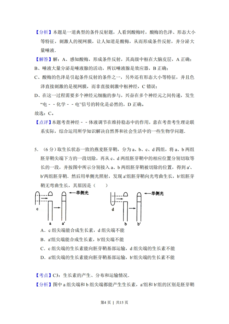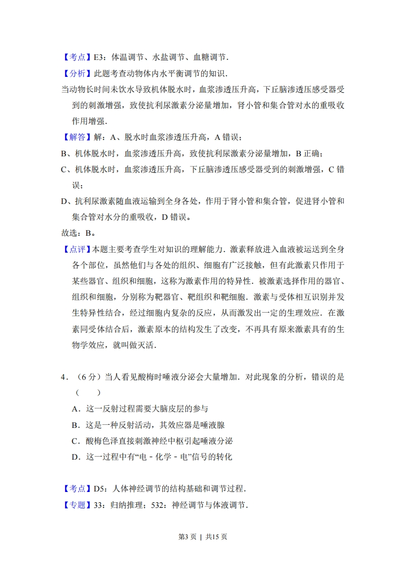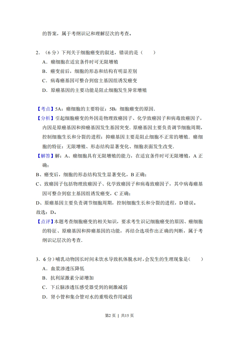 2012年全国统一高考生物试卷(新课标)事考答来与试想解析一、选择题:每小题6分,共36分1.(6分)同一物种的两类细胞各产生一种分泌蛋白,组成这两种蛋白质的各种氨基酸含量相同,但排列顺序不同。其原因是参与这两种蛋白质合成的()A.RNA种类不同B.mRNA碱基序列不同C.核糖体成分不同D.同一密码子所决定的氨基酸不同【考点】15:蛋白质分子结构多样性的原因:51:细胞的分化:7F:遗传信息的转录和翻译,【分析】蛋白质合成包括转录和翻译两个重要的过程,其中翻译过程需要模板(mRNA)、原料(氨基酸)、酶、能量和RNA(识别密码子,并转运相应的氨基酸到核糖体上进行翻译过程),场所是核糖体。组成这两种蛋白质的各种氨基酸排列顺序不同的根本原因是DNA中碱基序列不同,直接原因是mRNA中碱基序列不同。【解答】解:A、细胞中的RNA种类相同,都有61种,A错误:B、蛋白质是以mRNA为模板直接翻译形成的,所以组成这两种蛋白质的各种氨基酸排列顺序不同的原因是mRNA碱基序列不同,B正确:C、参与这两种蛋白质合成的核糖体的成分相同,都是由蛋白质和RNA组成,C错误:D、一种密码子只能决定一种氨基酸,D错误。故选:B。【点评】本题考查细胞分化、遗传信息的转录和翻译等知识,要求考生识记遗传信息的转录和翻译过程,明确蛋白质合成的直接模板是mRNA,再选出正确第1页|共15页的答案,属于考纲识记和理解层次的考查。2.(6分)下列关于细胞癌变的叙述,错误的是()A.癌细胞在适宜条件时可无限增殖B.癌变前后,细胞的形态和结构有明显差别C.病毒癌基因可整合到宿主基因组诱发癌变D.原癌基因的主要功能是阻止细胞发生异常增殖【考点】5A:癌细胞的主要特征:5B:细胞癌变的原因.【分析】引起细胞癌变的外因是物理致癌因子、化学致癌因子和病毒致癌因子,内因是原癌基因和抑癌基因发生基因突变,原癌基因主要负责调节细胞周期,控制细胞生长和分裂的进程:抑癌基因主要是阻止细胞不正常的增殖.癌细胞的特征:无限增殖、形态结构显著变化、细胞表面发生改变【解答】解:A、癌细胞具有无限增殖的能力,在适宜条件时可无限增殖,A正确:B、癌变后,细胞的形态结构发生显著变化,B正确:C、致癌因子包括物理致癌因子、化学致癌因子和病毒致癌因子,其中病毒癌基因可整合到宿主基因组诱发癌变,C正确:D、原癌基因主要负责调节细胞周期,控制细胞生长和分裂的进程,D错误。故选:D。【点评】本题考查细胞癌变的相关知识,要求考生识记细胞癌变的原因、癌细胞的特征、原癌基因和抑癌基因的功能,再结合选项作出正确的判断,属于考纲识记层次的考查.3.6分)哺乳动物因长时间未饮水导致机体脱水时,会发生的生理现象是()A.血浆渗透压降低B.抗利尿激素分泌增加C.下丘脑渗透压感受器受到的刺激减弱D.肾小管和集合管对水的重吸收作用减弱第2页|共15页【考点】E3:体温调节、水盐调节、血糖调节.【分析】此题考查动物体内水平衡调节的知识.当动物长时间未饮水导致机体脱水时,血浆渗透压升高,下丘脑渗透压感受器受到的刺激增强,致使抗利尿激素分泌量增加,肾小管和集合管对水的重吸收作用增强【解答】解:A、脱水时血浆渗透压升高,A错误:B、机体脱水时,血浆渗透压升高,致使抗利尿激素分泌量增加,B正确:C、机体脱水时,血浆渗透压升高,下丘脑渗透压感受器受到的刺激增强,C错误:D、抗利尿激素随血液运输到全身各处,作用于肾小管和集合管,促进肾小管和集合管对水分的重吸收,D错误。故选:B。【点评】本题主要考查学生对知识的理解能力.激素释放进入血液被运送到全身各个部位,虽然他们与各处的组织、细胞有广泛接触,但有此激素只作用于某些器官、组织和细胞,这称为激素作用的特异性.被激素选择作用的器官、组织和细胞,分别称为靶器官、靶组织和靶细胞.激素与受体相互识别并发生特异性结合,经过细胞内复杂的反应,从而激发出一定的生理效应.在激素同受体结合后,激素原本的结构发生了改变,不再具有原来激素具有的生物学效应,就叫做灭活.4.(6分)当人看见酸梅时唾液分泌会大量增加.对此现象的分析,错误的是()A.这一反射过程需要大脑皮层的参与B.这是一种反射活动,其效应器是唾液腺C.酸梅色泽直接刺激神经中枢引起唾液分泌D.这一过程中有“电-化学-电”信号的转化【考点】D5:人体神经调节的结构基础和调节过程.【专题】33:归纳推理:532:神经调节与体液调节.第3页|共15页