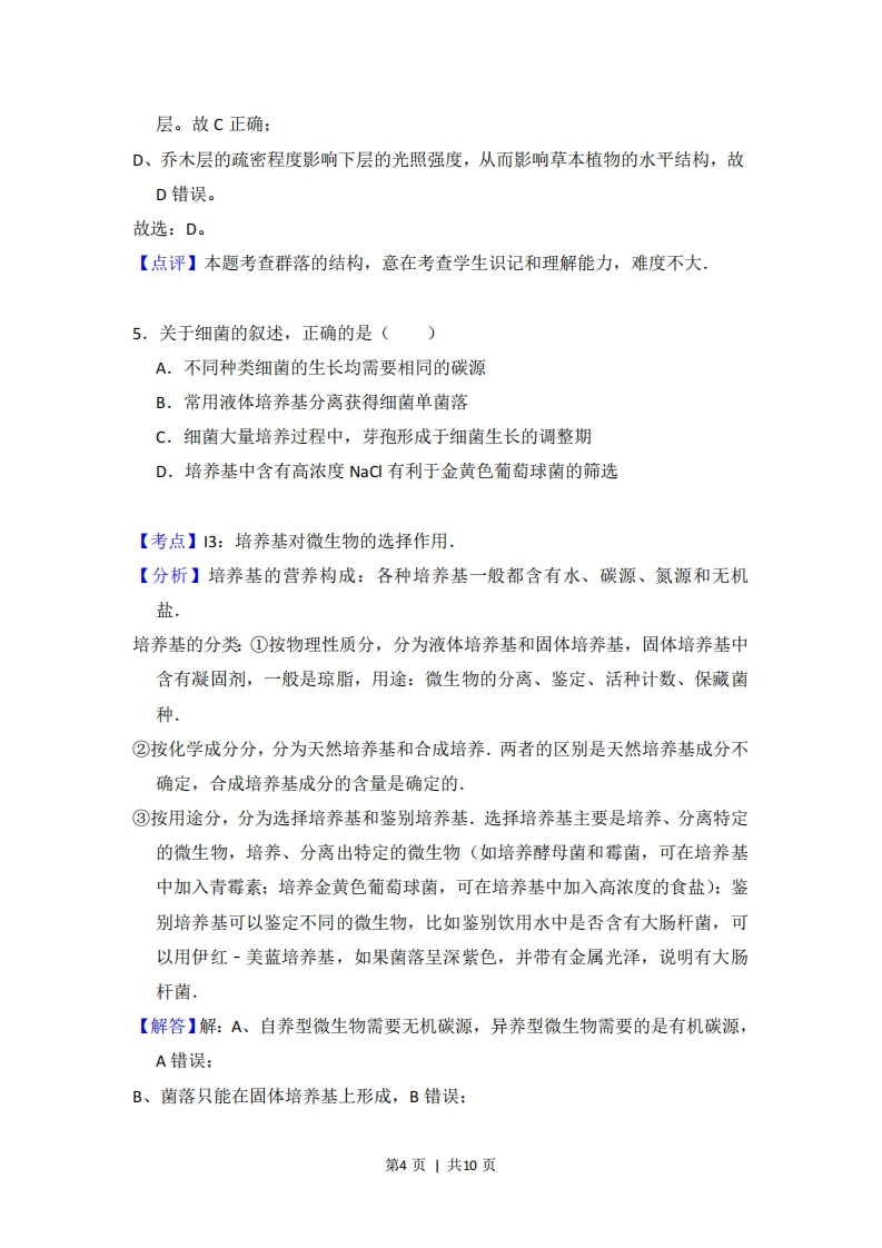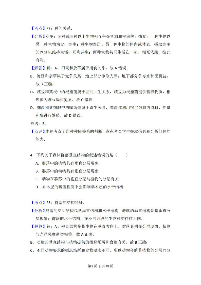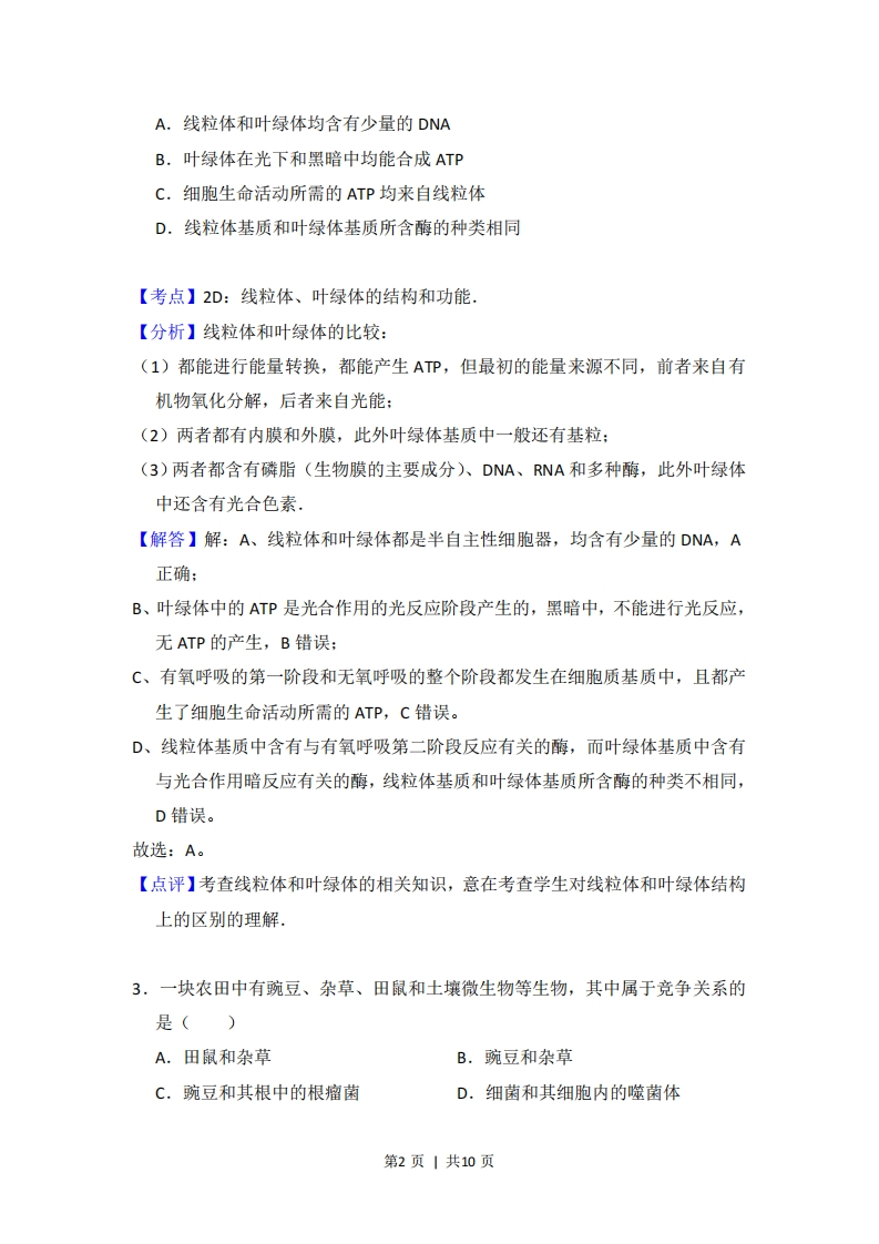 2012年全国统一高考生物试卷(大纲版)套考答案与试题解析一、选择题(共5小题)1.下列关于膝跳反射的叙述,错误的是()A.反射活动由一定的刺激引起B.反射活动中兴奋在突触处双向传递C.反射活动的发生需要反射弧结构完整D,反射活动中需要神经递质参与兴奋的传递【考点】D3:反射的过程.【分析】反射分为非条件反射和条件反射,反射发生必须具备两个条件:反射弧完整和一定条件的刺激。兴奋在神经元之间通过突触结构进行传递,需要神经递质参与,且神经递质只能由突触前膜释放,作用于突触后膜,因此兴在神经元之间的传递是单向的。【解答】解A、反射活动发生需要两个条件,即完整的反射弧和适宜的刺激,A正确:B、反射活动中兴奋在突触处单向传递,原因是神经递质只能由突触前膜释放,作用于突触后膜,B错误:C、反射活动发生需要两个条件,即完整的反射弧和适宜的刺激,C正确:D、一个反射弧至少由2个神经元组成,而兴奋在神经元之间传递时,需要神经递质参与,D正确。故选:B。【点评】本题考查反射、突触的结构、神经冲动的产生和传导,首先要求考生识记反射的类型及反射活动发生的条件:其次还要求考生识记突触的结构,明确兴奋在突触处的传递需要神经递质参与且单向传递,再对选项作出正确的判断。2.下列关于叶绿体和线粒体的叙述,正确的是()第1页|共10页A.线粒体和叶绿体均含有少量的DNAB.叶绿体在光下和黑暗中均能合成ATPC.细胞生命活动所需的ATP均来自线粒体D,线粒体基质和叶绿体基质所含酶的种类相同【考点】2D:线粒体、叶绿体的结构和功能.【分析】线粒体和叶绿体的比较:(1)都能进行能量转换,都能产生ATP,但最初的能量来源不同,前者来自有机物氧化分解,后者来自光能:(2)两者都有内膜和外膜,此外叶绿体基质中一般还有基粒:(3)两者都含有磷脂(生物膜的主要成分)、DNA、RNA和多种酶,此外叶绿体中还含有光合色素。【解答】解:A、线粒体和叶绿体都是半自主性细胞器,均含有少量的DNA,A正确:B、叶绿体中的ATP是光合作用的光反应阶段产生的,黑暗中,不能进行光反应,无ATP的产生,B错误:C、有氧呼吸的第一阶段和无氧呼吸的整个阶段都发生在细胞质基质中,且都产生了细胞生命活动所需的ATP,C错误。D、线粒体基质中含有与有氧呼吸第二阶段反应有关的酶,而叶绿体基质中含有与光合作用暗反应有关的酶,线粒体基质和叶绿体基质所含酶的种类不相同,D错误。故选:A。【点评】考查线粒体和叶绿体的相关知识,意在考查学生对线粒体和叶绿体结构上的区别的理解,3,一块农田中有豌豆、杂草、田鼠和土壤微生物等生物,其中属于竞争关系的是()A.田鼠和杂草B.豌豆和杂草C.豌豆和其根中的根瘤菌D.细菌和其细胞内的噬菌体第2页|共10页【考点】F7:种间关系.【分析】竞争:两种或两种以上生物相互争夺资源和空间等:捕食:一种生物以另一种生物为食:寄生:种生物寄居于另一种生物的体内或体表,摄取寄主的养分以维持生活:互利共生:两种生物共同生活在一起,相互依赖,彼此有利.【解答】解:A、田鼠和杂草属于捕食关系,故A错误:B、豌豆和杂草属于竞争关系,地上部分争取光照,地下部分争夺水和无机盐,故B正确:D、豌豆和其根中的根瘤菌属于互利共生关系,豌豆为根瘤菌提供营养物质,根瘤菌为豌豆提供氮素,故C错误:D、细菌和其细胞中的噬菌体属于寄生关系,噬菌体利用宿主细胞内原料、能量和酶进行繁殖,故D错误。故选:B。【点评】本题考查了四种种间关系的判断,意在考查学生提取信息和分析问题的能力.4.下列关于森林群落垂直结构的叙述错误的是()A.群落中的植物具有垂直分层现象B.群落中的动物具有垂直分层现象C,动物在群落中的垂直分层与植物的分层有关D.乔木层的疏密程度不会影响草木层的水平结构【考点】F5:群落的结构特征,【分析】群落的空间结构包括垂直结构和水平结构:群落的垂直结构是指垂直分层现象:群落的水平结构,在不同地段的生物种类往往不同.【解答】解:A、垂直结构是指生物在垂直方向上,群落具明显分层现象,植物与光照强度密切相关,故A正确,B、动物的垂直结构与植物提供的栖息场所和食物有关,故B正确:C、不同动物要求的栖息场所和食物要求不同,所以动物会随着植物的分层而分第3页|共10页