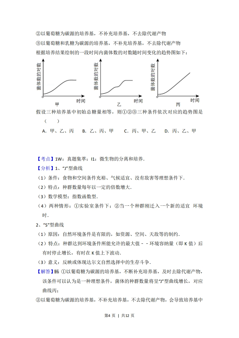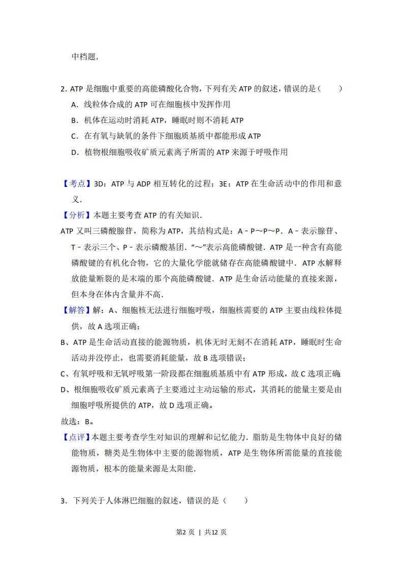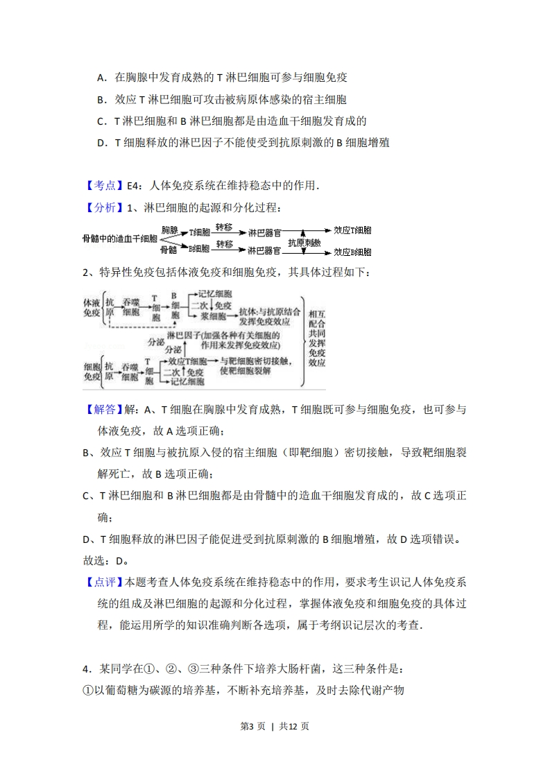 2014年全国统一高考生物试卷(大纲版)事考答来与试想解析一、解答题1.下列有关细胞核的叙述,错误的是()A.蛋白质是细胞核中染色质的组成成分B.细胞核中可进行遗传物质的复制和转录C.小分子物质可以通过核孔,大分子物质不能D.有丝分裂过程中存在核膜消失和重新形成的现象【考点】2G:细胞核的结构和功能【分析】1、染色质主要是由DNA和蛋白质组成的,在分裂间期呈染色质状态,进入分裂期前期,染色质缩短变粗成为染色体,分裂末期染色体解螺旋成为染色质.2、核膜上的核孔的功能是实现核质之间频繁的物质交换和信息交流,是大分子物质进出的通道,3、细胞核是遗传物质贮存和复制的场所,是细胞遗传和代谢的控制中心.4、有丝分裂记忆口诀:前期:膜仁消失现两体,中期:形定数晰赤道齐,后期:点裂体增均两极,末期:两消两现重开始【解答】解:A、细胞核中染色质由DNA和蛋白质组成,故A正确:B、DNA主要存在于细胞核中,则遗传物质的复制和转录的主要场所是细胞核,故B正确:C、原则上分子直径较小的物质可通过核孔,大分子物质如酶或RNA也能通过核孔,故C错误:D、在有丝分裂的前期核膜和核仁消失,在有丝分裂的末期核膜和核仁重现,故D正确。故选:C。【点评】本题考查细胞核的结构和功能,意在考查学生的识记和理解能力,属于第1页|共12页中档题.2.ATP是细胞中重要的高能磷酸化合物,下列有关ATP的叙述,错误的是()A.线粒体合成的ATP可在细胞核中发挥作用B.机体在运动时消耗ATP,睡眠时则不消耗ATPC.在有氧与缺氧的条件下细胞质基质中都能形成ATPD.植物根细胞吸收矿质元素离子所需的ATP来源于呼吸作用【考点】3D:ATP与ADP相互转化的过程:3E:ATP在生命活动中的作用和意义【分析】本题主要考查ATP的有关知识,ATP又叫三磷酸腺苷,简称为ATP,其结构式是:A-P~PP.A-表示腺苷、T-表示三个、P-表示磷酸基团.“~"表示高能磷酸键.ATP是一种含有高能磷酸键的有机化合物,它的大量化学能就储存在高能磷酸键中,ATP水解释放能量断裂的是末端的那个高能磷酸键.ATP是生命活动能量的直接来源,但本身在体内含量并不高,【解答】解:A、细胞核无法进行细胞呼吸,细胞核需要的ATP主要由线粒体提供,故A选项正确:B、ATP是生命活动直接的能源物质,机体无时无刻不在消耗ATP,睡眠时生命活动并没停止,也需要消耗能量,故B选项错误:C、有氧呼吸和无氧呼吸第一阶段都在细胞质基质中有ATP形成,故C选项正确D、根细胞吸收矿质元素离子主要通过主动运输的形式,其消耗的能量主要是由细胞呼吸所提供的ATP,故D选项正确。故选:B。【点评】本题主要考查学生对知识的理解和记忆能力.脂肪是生物体中良好的储能物质,糖类是生物体中主要的能源物质,ATP是生物体所需能量的直接能源物质,根本的能量来源是太阳能,3.下列关于人体淋巴细胞的叙述,错误的是()第2页|共12页A.在胸腺中发育成熟的T淋巴细胞可参与细胞免疫B.效应T淋巴细胞可攻击被病原体感染的宿主细胞C.T淋巴细胞和B淋巴细胞都是由造血干细胞发育成的D,T细胞释放的淋巴因子不能使受到抗原刺激的B细胞增殖【考点】E4:人体免疫系统在维持稳态中的作用,【分析】1、淋巴细胞的起源和分化过程:骨髓中的造血千细胞胸腺,T细胞转移→淋巴器官本→效应T细胞骨髓→细跑转移,淋巴器官抗原刺微效应B细胞2、特异性免疫包括体液免疫和细胞免疫,其具体过程如下:体液抗吞噬TB+记忆细形原细胞细+细二次,免疫免疫胞胞抗体:与抗原结合七浆细胞一→发挥免疫效应相互配合分泌淋巴,因子你强各种有关细胞的共同分泌作用米发挥免疫效应发挥免疫细胞抗吞噬→效应T细胞→与配细胞密切接触,效应+细免疫原细胞胞二次↑免疫使无细胞裂解,记忆细胞【解答】解:A、T细胞在胸腺中发育成熟,T细胞既可参与细胞免疫,也可参与体液免疫,故A选项正确:B、效应T细胞与被抗原入侵的宿主细胞(即靶细胞)密切接触,导致靶细胞裂解死亡,故B选项正确:C、T淋巴细胞和B淋巴细胞都是由骨髓中的造血干细胞发育成的,故C选项正确:D、T细胞释放的淋巴因子能促进受到抗原刺激的B细胞增殖,故D选项错误。故选:D。【点评】本题考查人体免疫系统在维持稳态中的作用,要求考生识记人体免疫系统的组成及淋巴细胞的起源和分化过程,掌握体液免疫和细胞免疫的具体过程,能运用所学的知识准确判断各选项,属于考纲识记层次的考查.4.某同学在①、②、③三种条件下培养大肠杆菌,这三种条件是:①以葡萄糖为碳源的培养基,不断补充培养基,及时去除代谢产物第3页|共12页