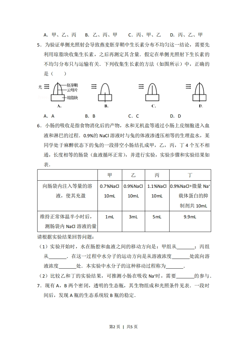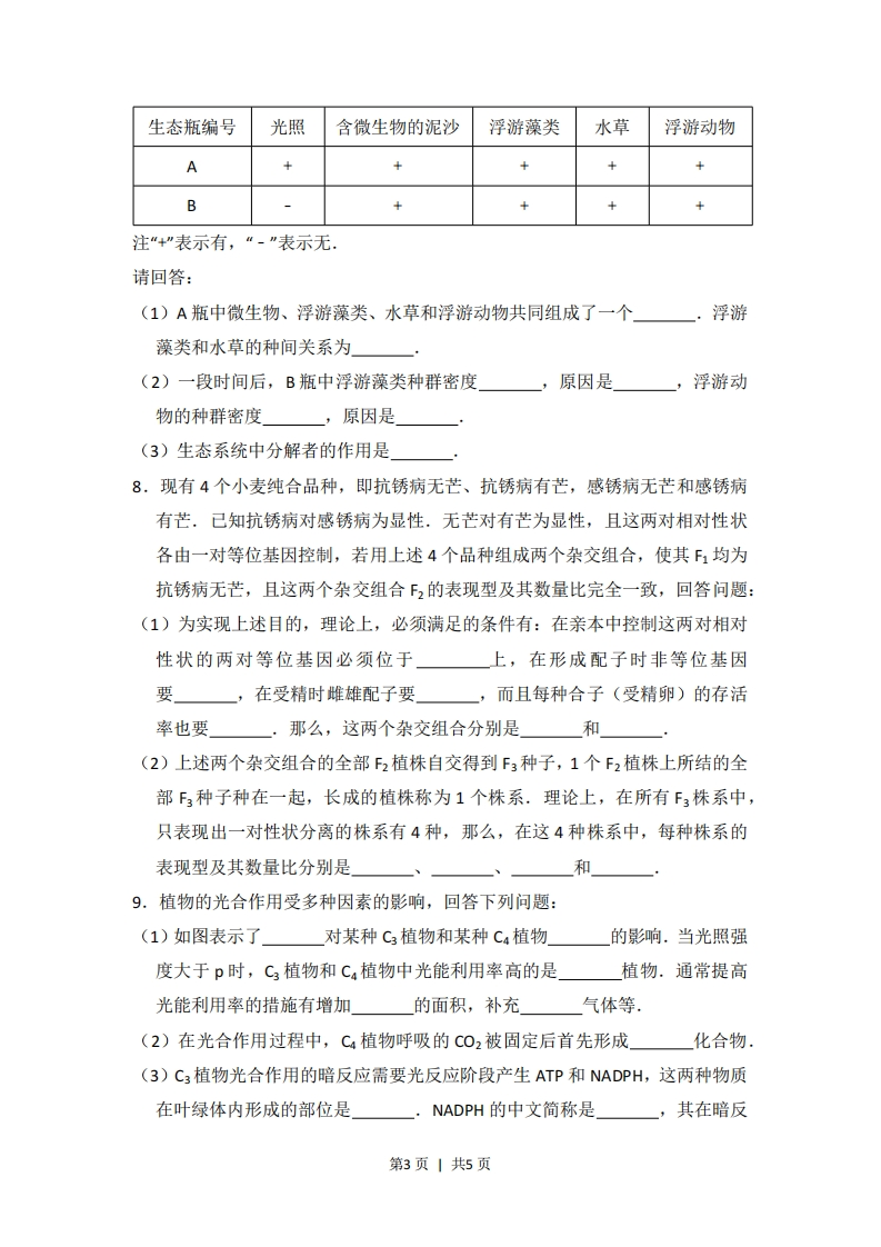 2014年全国统一高考生物试卷(大纲版)一、解答题1.下列有关细胞核的叙述,错误的是()A.蛋白质是细胞核中染色质的组成成分B.细胞核中可进行遗传物质的复制和转录C.小分子物质可以通过核孔,大分子物质不能D.有丝分裂过程中存在核膜消失和重新形成的现象2.ATP是细胞中重要的高能磷酸化合物,下列有关ATP的叙述,错误的是()A.线粒体合成的ATP可在细胞核中发挥作用B.机体在运动时消耗ATP,睡眠时则不消耗ATPC.在有氧与缺氧的条件下细胞质基质中都能形成ATPD.植物根细胞吸收矿质元素离子所需的ATP来源于呼吸作用3.下列关于人体淋巴细胞的叙述,错误的是()A.在胸腺中发育成熟的T淋巴细胞可参与细胞免疫B.效应T淋巴细胞可攻击被病原体感染的宿主细胞C.T淋巴细胞和B淋巴细胞都是由造血干细胞发育成的D,T细胞释放的淋巴因子不能使受到抗原刺激的B细胞增殖4.某同学在①、②、③三种条件下培养大肠杆菌,这三种条件是:①以葡萄糖为碳源的培养基,不断补充培养基,及时去除代谢产物②以葡萄糖为碳源的培养基,不补充培养基,不去除代谢产物③以葡萄糖和乳糖为碳源的培养基,不补充培养基,不去除代谢产物根据培养结果绘制的一段时间内菌体数的对数随时间变化的趋势图如下:较捆时间时间时间甲丙假设三种培养基中初始总糖量相等,则①②③三种条件依次对应的趋势图是()第1页1共5页A.甲、乙、丙B.乙、丙、甲C.丙、甲、乙D.丙、乙、甲5,为验证单侧光照射会导致燕麦胚芽鞘中生长素分布不均匀这一结论,需要先利用琼脂块收集生长素,之后再测定其含量.假定在单侧光照射下生长素的不均匀分布只与运输有关.下列收集生长素的方法(如图所示)中,正确的是()光胚芽鞘云母片琼指块DA.AB.BC.CD.D6,小肠的吸收是指食物消化后的产物,水和无机盐等通过小肠上皮细胞进入血液和淋巴的过程.0.9%的NaCI溶液时与兔的体液渗透压相等的生理盐水,某同学处于麻醉状态下的兔的一段排空小肠结扎成甲,乙,丙,丁4个互不相通,长度相等的肠袋(血液循环正常),并进行实验,实验步骤和实验结果如表。甲乙丙丁向肠袋内注入等量的溶0.7%NaCl0.9%NaCl1.1%NaCl0.9%NaC+微量Na液,使其充盈10mL10mL10mL载体蛋白的抑制剂共10mL维持正常体温半小时后,1mL3mL5mL9.9mL测肠袋内NaC溶液的量请根据实验结果回答问题:(1)实验开始时,水在肠腔和血液之间的移动方向是:甲组从:丙组从在这一过程中水分子的运动方向是从溶液浓度处流向溶液浓度■处.本实验中水分子的这种移动过程称为(2)比较乙和丁的实验结果,可推测小肠在吸收Na时,需要的参与7.现有A,B两个密闭,透明的生态瓶,其生物组成和光照条件见表.一段时间后,发现A瓶的生态系统较B瓶的稳定,第2页1共5页生态瓶编号光照含微生物的泥沙浮游藻类水草浮游动物A++B注“4”表示有,“-”表示无.请回答:(1)A瓶中微生物、浮游藻类、水草和浮游动物共同组成了一个浮游藻类和水草的种间关系为(2)一段时间后,B瓶中浮游藻类种群密度原因是浮游动物的种群密度,原因是(3)生态系统中分解者的作用是8.现有4个小麦纯合品种,即抗锈病无芒、抗锈病有芒,感锈病无芒和感锈病有芒.已知抗锈病对感锈病为显性.无芒对有芒为显性,且这两对相对性状各由一对等位基因控制,若用上述4个品种组成两个杂交组合,使其「1均为抗锈病无芒,且这两个杂交组合「2的表现型及其数量比完全一致,回答问题:(1)为实现上述目的,理论上,必须满足的条件有:在亲本中控制这两对相对性状的两对等位基因必须位于上,在形成配子时非等位基因要在受精时雌雄配子要,而且每种合子(受精卵)的存活率也要那么,这两个杂交组合分别是和(2)上述两个杂交组合的全部F2植株自交得到F3种子,1个F2植株上所结的全部F3种子种在一起,长成的植株称为1个株系.理论上,在所有「3株系中,只表现出一对性状分离的株系有4种,那么,在这4种株系中,每种株系的表现型及其数量比分别是和9.植物的光合作用受多种因素的影响,回答下列问题:(1)如图表示了对某种C3植物和某种C4植物的影响.当光照强度大于p时,C3植物和C4植物中光能利用率高的是植物.通常提高光能利用率的措施有增加的面积,补充气体等。(2)在光合作用过程中,C4植物呼吸的C02被固定后首先形成化合物.(3)C3植物光合作用的暗反应需要光反应阶段产生ATP和NADPH,这两种物质在叶绿体内形成的部位是NADPH的中文简称是其在暗反第3页1共5页