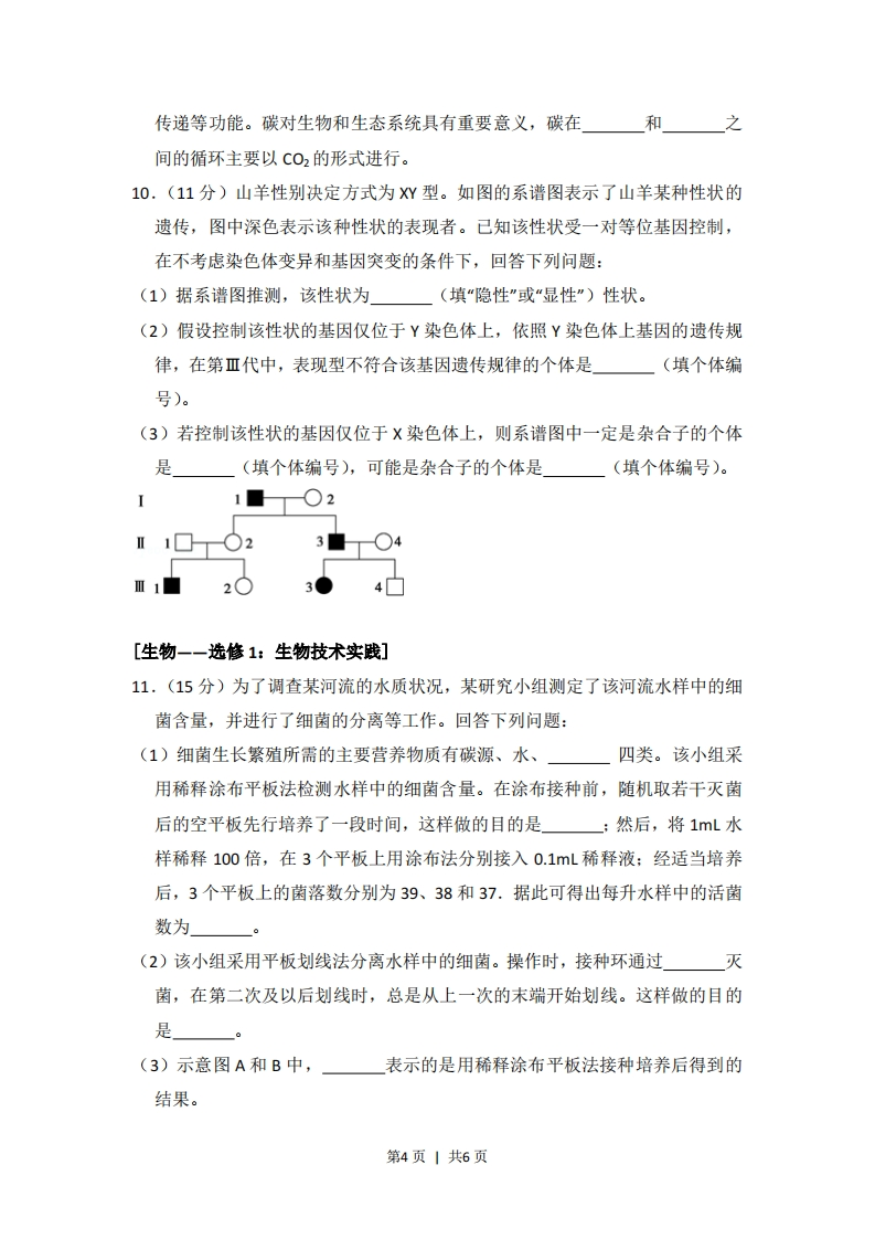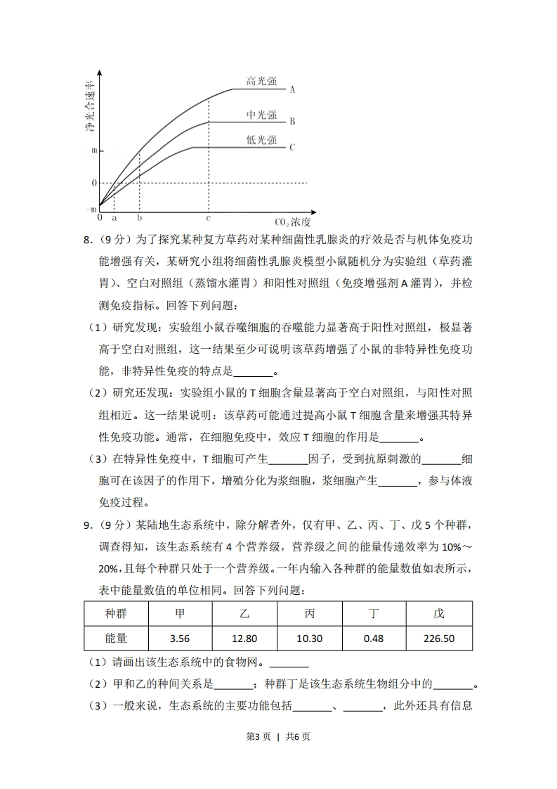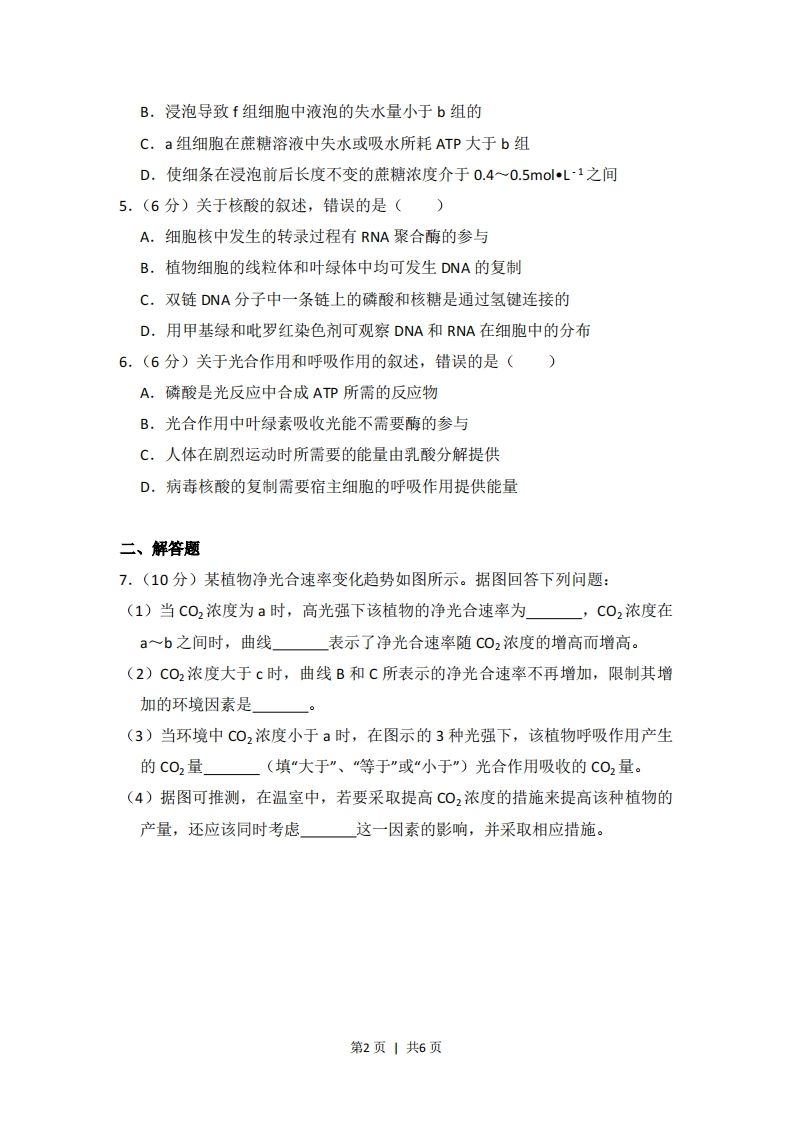 2014年全国统一高考生物试卷(新课标Ⅱ)一、选择题:本题共6小题,每小题6分,在每小题给出的四个选项中,只有一项是符合题目要求的。1.(6分)关于细胞的叙述,错误的是()A.植物细胞的胞间连丝具有物质运输的作用B.动物细胞间的黏着性与细胞膜上的糖蛋白有关C.ATP水解释放的能量可用于细胞内的吸能反应D.哺乳动物的细胞可以合成蔗糖,也可以合成乳糖2.(6分)同一动物个体的神经细胞与肌细胞在功能上是不同的,造成这种差异的主要原因是()A.二者所处的细胞周期不同B.二者合成的特定蛋白不同C.二者所含有的基因组不同D.二者核DNA的复制方式不同3.(6分)关于正常情况下组织液生成与回流的叙述,错误的是()A.生成与回流的组织液中氧气的含量相等B.组织液不断生成与回流,并保持动态平衡C.血浆中的有些物质经毛细血管动脉端进入组织液D.组织液中的有些物质经毛细血管静脉端进入血液4.(6分)将某植物花冠切成大小和形状相同的细条,分为a、b、c、d、e和f组(每组的细条数相等),取上述6组细条分别置于不同浓度的蔗糖溶液中,浸泡相同时间后测量各组花冠细条的长度,结果如图所示。假如蔗糖溶液与花冠细胞之间只有水分交换,则()21.11.0090.80.7020.30.40.50.60.7爸糖浓度(molL)】A.实验后,a组液泡中的溶质浓度比b组的高第1页1共6页B.浸泡导致f组细胞中液泡的失水量小于b组的C.a组细胞在蔗糖溶液中失水或吸水所耗ATP大于b组D.使细条在浸泡前后长度不变的蔗糖浓度介于0.4~0.5molL1之间5.(6分)关于核酸的叙述,错误的是()A.细胞核中发生的转录过程有RNA聚合酶的参与B.植物细胞的线粒体和叶绿体中均可发生DNA的复制C.双链DNA分子中一条链上的磷酸和核糖是通过氢键连接的D.用甲基绿和吡罗红染色剂可观察DNA和RNA在细胞中的分布6.(6分)关于光合作用和呼吸作用的叙述,错误的是()A.磷酸是光反应中合成ATP所需的反应物B.光合作用中叶绿素吸收光能不需要酶的参与C.人体在剧烈运动时所需要的能量由乳酸分解提供D.病毒核酸的复制需要宿主细胞的呼吸作用提供能量二、解答题7.(10分)某植物净光合速率变化趋势如图所示。据图回答下列问题:(1)当C02浓度为a时,高光强下该植物的净光合速率为,C02浓度在a~b之间时,曲线表示了净光合速率随C02浓度的增高而增高。(2)CO2浓度大于c时,曲线B和C所表示的净光合速率不再增加,限制其增加的环境因素是(3)当环境中C02浓度小于a时,在图示的3种光强下,该植物呼吸作用产生的C02量(填“大于”、等于”或“小于")光合作用吸收的C0,量。(4)据图可推测,在温室中,若要采取提高C02浓度的措施来提高该种植物的产量,还应该同时考虑这一因素的影响,并采取相应措施。第2页1共6页高光强中光强一B低光强C02浓度8.(9分)为了探究某种复方草药对某种细菌性乳腺炎的疗效是否与机体免疫功能增强有关,某研究小组将细菌性乳腺炎模型小鼠随机分为实验组(草药灌胃)、空白对照组(蒸馏水灌胃)和阳性对照组(免疫增强剂A灌胃),并检测免疫指标。回答下列问题:(1)研究发现:实验组小鼠吞噬细胞的吞噬能力显著高于阳性对照组,极显著高于空白对照组,这一结果至少可说明该草药增强了小鼠的非特异性免疫功能,非特异性免疫的特点是(2)研究还发现:实验组小鼠的T细胞含量显著高于空白对照组,与阳性对照组相近。这一结果说明:该草药可能通过提高小鼠T细胞含量来增强其特异性免疫功能。通常,在细胞免疫中,效应T细胞的作用是(3)在特异性免疫中,T细胞可产生因子,受到抗原刺激的细胞可在该因子的作用下,增殖分化为浆细胞,浆细胞产生一,参与体液免疫过程。9.(9分)某陆地生态系统中,除分解者外,仅有甲、乙、丙、丁、戊5个种群,调查得知,该生态系统有4个营养级,营养级之间的能量传递效率为10%~20%,且每个种群只处于一个营养级。一年内输入各种群的能量数值如表所示,表中能量数值的单位相同。回答下列问题:种群甲乙丙丁戊能量3.5612.8010.300.48226.50(1)请画出该生态系统中的食物网。(2)甲和乙的种间关系是种群丁是该生态系统生物组分中的(3)一般来说,生态系统的主要功能包括此外还具有信息第3页1共6页