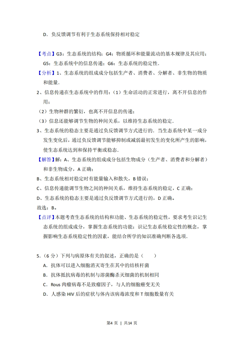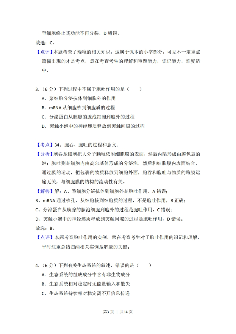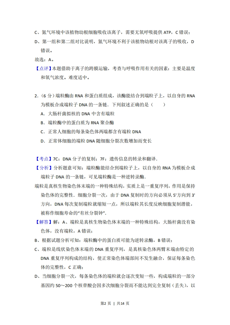 2015年全国统一高考生物试卷(新课标Ⅱ)考答来与试题解析一、选择题(本题共6小题,每小题6分,在每小题给出的四个选项中,只有一项是符合题目要求的)1.(6分)将三组生理状态相同的某植物幼根分别培养在含有相同培养液的密闭培养瓶中,一段时间后,测定根吸收某一矿质元素离子的量。培养条件及实验结果见下表:培养瓶中气体温度(℃)离子相对吸收量(%)空气17100氮气1710空气328下列分析正确的是()A.有氧条件有利于该植物幼根对该离子的吸收B.该植物幼根对该离子的吸收与温度的变化无关C.氮气环境中该植物幼根细胞吸收该离子不消耗ATPD.与空气相比,氮气环境有利于该植物幼根对该离子的吸收【考点】33:主动运输的原理和意义.【专题】122:数据表格;518:物质跨膜运输.【分析】分析表格数据可知:该实验的自变量是空气的成分和温度,因变量是离子相对吸收量,由实验结果可以看出:温度和氧气都影响离子相对吸收量,根本原因是离子的吸收为主动运输,需要呼吸作用提供能量,而氧气浓度和温度都影响呼吸作用。【解答】解:A、第一组和第二组对比说明,有氧条件有利于该植物幼根对该离子的吸收,A正确:B、第一组和第三组对比说明,幼根对该离子的吸收与温度的变化有关,温度较高时,吸收离子较快,B错误:第1页|共14页C、氮气环境中该植物幼根细胞吸收该离子,需要无氧呼吸提供ATP,C错误:D、第一组和第二组对比说明,氮气环境不利于该植物幼根对该离子的吸收,D错误。故选:A。【点评】本题借助于离子的跨膜运输,考查与呼吸作用有关的因素:主要是温度和氧气浓度。难度适中。2.(6分)端粒酶由RNA和蛋白质组成,该酶能结合到端粒子上,以自身的RNA为模板合成端粒子DNA的一条链.下列叙述正确的是()A.大肠杆菌拟核的DNA中含有端粒B.端粒酶中的蛋白质为RNA聚合酶C.正常人细胞的每条染色体两端都含有端粒DNAD.正常体细胞的端粒DNA随细胞分裂次数增加而变长【考点】7C:DNA分子的复制;7F:遗传信息的转录和翻译,【分析】分析题意可知:端粒酶能结合到端粒子上,以自身的RNA为模板合成端粒子DNA的一条链,可见端粒酶是一种逆转录酶,端粒是真核生物染色体末端的一种特殊结构,实质上是一重复序列,作用是保持染色体的完整性,细胞分裂一次,由于DNA复制时的方向必须从5'方向到3方向,DNA每次复制端粒就缩短一点,所以端粒其长度反映细胞复制潜能,被称作细胞寿命的“有丝分裂钟”.【解答】解:A、端粒是真核生物染色体末端的一种特殊结构,大肠杆菌没有染色体,没有端粒,A错误:B、根据试题分析可知:端粒酶中的蛋白质可能为逆转录酶,B错误:C、端粒是线状染色体末端的DNA重复序列,是真核染色体两臂末端由特定的DNA重复序列构成的结构,使正常染色体端部间不发生融合,保证每条染色体的完整性,C正确:D、当细胞分裂一次,每条染色体的端粒就会逐次变短一些,构成端粒的一部分基因约50一200个核苷酸会因多次细胞分裂而不能达到完全复制(丢失),以第2页|共14页至细胞终止其功能不再分裂,D错误。故选:C。【点评】本题考查了端粒的相关知识,这属于课本的小字部分,可见不一定重点篇幅出现的才是考点,意在考查考生的理解和审题能力,识记能力,难度适中.3.(6分)下列过程中不属于胞吐作用的是()A.浆细胞分泌抗体到细胞外的作用B.mRNA从细胞核到细胞质的过程C,分泌蛋白从胰腺的腺泡细胞到胞外的过程D.突触小泡中的神经递质释放到突触间隙的过程【考点】34:胞吞、胞吐的过程和意义.【分析】胞吞是细胞把大分子颗粒依附细胞膜的表面,然后内陷形成由膜包裹的泡:胞吐则是细胞内由高尔基体形成的分泌泡,然后和细胞膜内表面结合,通过膜的运动,把包裹的物质释放到细胞外面,胞吞和胞吐与物质的跨膜运输无关,与细胞膜的结构的流动性有关。【解答】解:A、浆细胞分泌抗体到细胞外是胞吐作用,A错误:B、mRNA通过核孔,从细胞核到细胞质的过程,不是胞吐作用,B正确:C、分泌蛋白从胰腺的腺泡细胞到胞外的过程是胞吐作用,C错误:D、突触小泡中的神经递质释放到突触间隙的过程是胞吐作用,D错误。故选:B。【点评】本题考查胞吐作用的实例,意在考查考生对于胞吐作用的识记和理解,平时注重总结归纳相关实例是解题的关键。4.(6分)下列有关生态系统的叙述,错误的是()A.生态系统的组成成分中含有非生物成分B.生态系统相对稳定时无能量输入和散失C.生态系统持续相对稳定离不开信息传递第3页|共14页