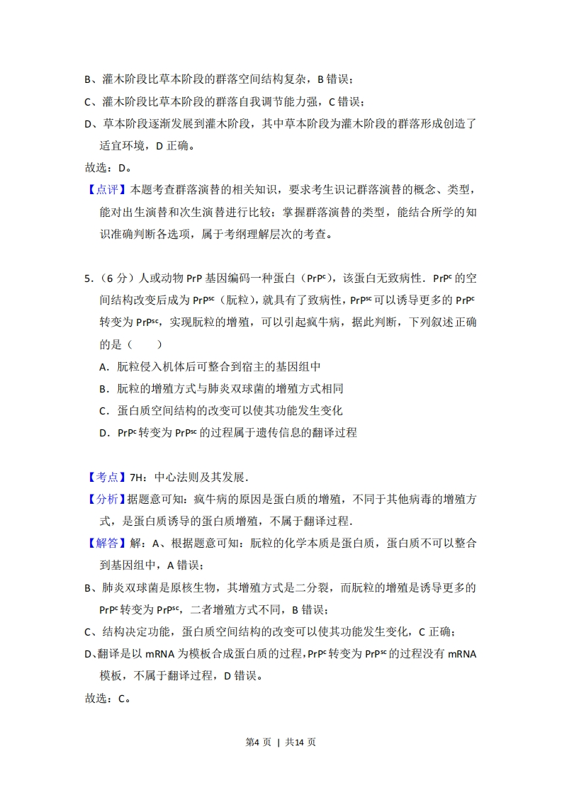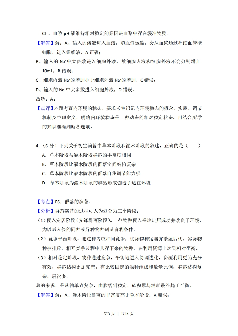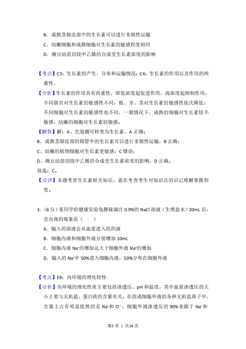 2015年全国统一高考生物试卷(新课标I)◆考答案与试题解析一、选择题(每小题6分)1.(6分)下列叙述错误的是()A.DNA与ATP中所含元素的种类相同B.一个tRNA分子中只有一个反密码子C.T2噬菌体的核酸由脱氧核糖核苷酸组成D.控制细菌性状的基因位于拟核和线粒体中的DNA上【考点】1B:核酸的基本组成单位;3C:ATP的化学组成和特点;7D:RNA分子的组成和种类,【分析】一个tRNA中只含有一个反密码子,只能转运一种氨基酸.ATP的结构简式为A-P~P~P,DNA由脱氧核糖核苷酸组成,一分子脱氧核糖核苷酸由一分子磷酸、一分子脱氧核糖、一分子含氮碱基组成,DNA与ATP中所含元素的种类相同,都是C、H、O、N、P.原核生物只有一种细胞器是核糖体,【解答】解:A、DNA与ATP中所含元素的种类相同,都是C、H、O、N、P,A正确:B、一个tRNA只能转运一种氨基酸。只含有一个反密码子,B正确:C、T2噬菌体的核酸是DNA,由脱氧核糖核苷酸组成,C正确:D、细菌是原核生物,没有线粒体,此外细菌的基因也可以位于质粒上,D错误。故选:D。【点评】本题考查了ATP、DNA的组成元素、T2噬菌体的核酸种类、原核生物的结构,综合性较强,难度适中,2.(6分)下列关于植物生长素的叙述,错误的是()A.植物幼嫩叶片中的色氨酸可转变为生长素第1页|共14页B.成熟茎韧皮部中的生长素可以进行非极性运输C.幼嫩细胞和成熟细胞对生长素的敏感程度相同D.豌豆幼苗切段中乙烯的合成受生长素浓度的影响【考点】C3:生长素的产生、分布和运输情况:C4:生长素的作用以及作用的两重性,【分析】生长素的作用具有两重性,即低浓度起促进作用,高浓度起抑制作用:不同器官对生长素的敏感性不同,根、芽、茎对生长素的敏感性依次降低:不同细胞对生长素的敏感性也不同,一般情况下,成熟的细胞对生长素较不敏感,幼嫩的细胞对生长素较敏感。【解答】解:A、色氨酸可转变为生长素,A正确:B、成熟茎韧皮部的筛管中的生长素可以进行非极性运输,B正确:C、幼嫩的植物细胞对生长素更敏感,C错误:D、豌豆幼苗切段中乙烯的合成受生长素浓度的影响,D正确。故选:C。【点评】本题考查生长素相关知识,意在考查考生对知识点的识记理解掌握程度。3.(6分)某同学给健康实验兔静脉滴注0.9%的NacI溶液(生理盐水)20mL后,会出现的现象是()A.输入的溶液会从血浆进入组织液B.细胞内液和细胞外液分别增加10mLC.细胞内液Na的增加远大于细胞外液Na的增加D.输入的Na中50%进入细胞内液,50%分布在细胞外液【考点】E9:内环境的理化特性.【分析】内环境的理化性质主要包括渗透压、pH和温度,其中血浆渗透压的大小主要与无机盐、蛋白质的含量有关。在组成细胞外液的各种无机盐离子中,含量上占有明显优势的是Na和C~,细胞外液渗透压的90%来源于Na和第2页|共14页C,血浆pH能维持相对稳定的原因是血浆中存在缓冲物质。【解答】解:A、输入的溶液进入血液,随血液运输,会从血浆通过毛细血管壁细胞,进入组织液,A正确:B、输入的Na中大多数进入细胞外液,故细胞内液和细胞外液不会分别增加10mL,B错误:C、细胞内液Na的增加小于细胞外液Na的增加,C错误:D、输入的Na中大多数进入细胞外液,D错误。故选:A。【点评】本题考查内环境的稳态,要求考生识记内环境稳态的概念、实质、调节机制及生理意义,明确内环境稳态是一种动态的相对稳定状态,再结合所学的知识准确判断各选项。4.(6分)下列关于初生演替中草本阶段和灌木阶段的叙述,正确的是()A.草本阶段与灌木阶段群落的丰富度相同B.草本阶段比灌木阶段的群落空间结构复杂C.草本阶段比灌木阶段的群落自我调节能力强D.草本阶段为灌木阶段的群落形成创造了适宜环境【考点】F6:群落的演替.【分析】群落演替的过程可人为划分为三个阶段:(1)侵入定居阶段(先锋群落阶段)。一些物种侵入裸地定居成功并改良了环境,为以后入侵的同种或异种物种创造有利条件。(2)竞争平衡阶段。通过种内或种间竞争,优势物种定居并繁殖后代,劣势物种被排斥,相互竞争过程中共存下来的物种,在利用资源上达到相对平衡。(3)相对稳定阶段。物种通过竞争,平衡地进入协调进化,资源利用更为充分有效,群落结构更加完善,有比较固定的物种组成和数量比例,群落结构复杂,层次多。总的来说,是从简单到复杂,由脆弱到稳定,碳积累与消耗最终趋于平衡。【解答】解:A、灌木阶段群落的丰富度高于草本阶段,A错误:第3页|共14页