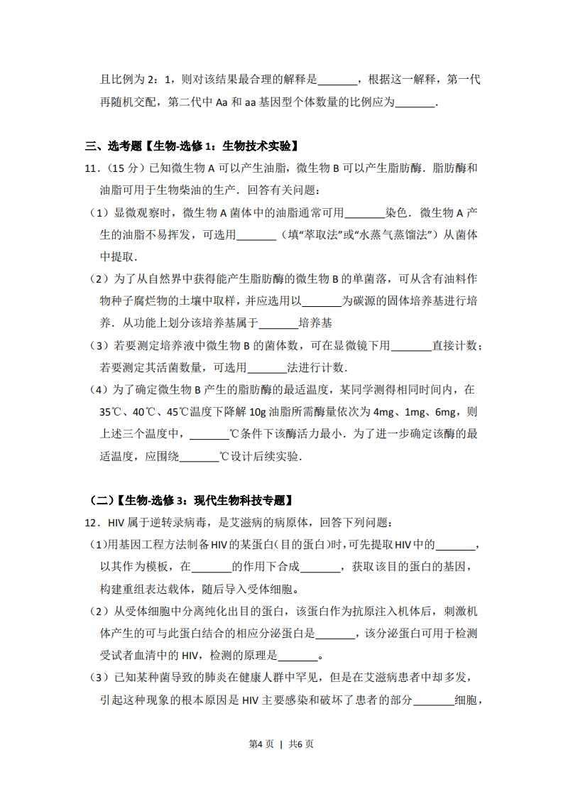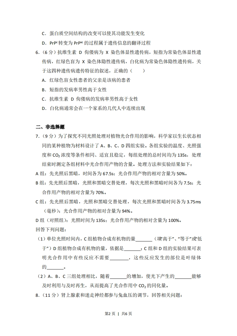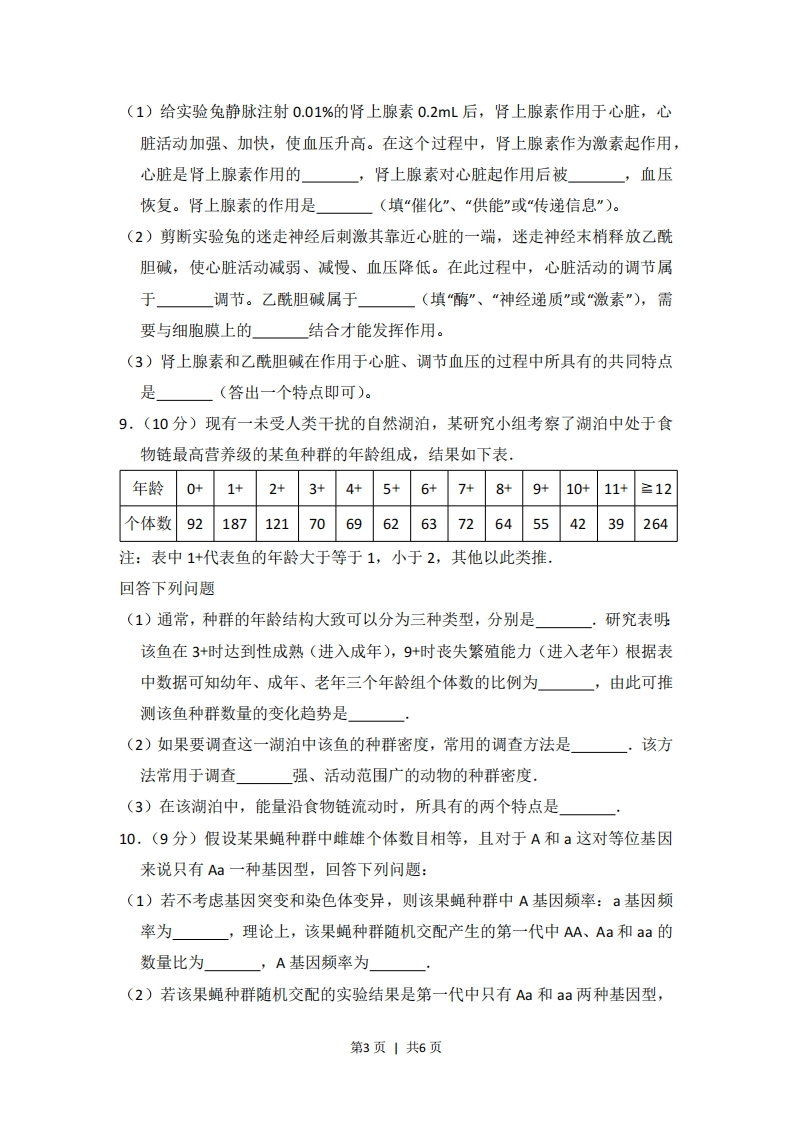 2015年全国统一高考生物试卷(新课标I)一、选择题(每小题6分)1.(6分)下列叙述错误的是()A.DNA与ATP中所含元素的种类相同B.一个tRNA分子中只有一个反密码子C.T2噬菌体的核酸由脱氧核糖核苷酸组成D.控制细菌性状的基因位于拟核和线粒体中的DNA上2.(6分)下列关于植物生长素的叙述,错误的是()A.植物幼嫩叶片中的色氨酸可转变为生长素B.成熟茎韧皮部中的生长素可以进行非极性运输C.幼嫩细胞和成熟细胞对生长素的敏感程度相同D.豌豆幼苗切段中乙烯的合成受生长素浓度的影响3.(6分)某同学给健康实验兔静脉滴注0.9%的NaCl溶液(生理盐水)20mL后,会出现的现象是()A.输入的溶液会从血浆进入组织液B.细胞内液和细胞外液分别增加10mLC.细胞内液Na的增加远大于细胞外液Na的增加D.输入的Na中50%进入细胞内液,50%分布在细胞外液4.(6分)下列关于初生演替中草本阶段和灌木阶段的叙述,正确的是()A.草本阶段与灌木阶段群落的丰富度相同B.草本阶段比灌木阶段的群落空间结构复杂C.草本阶段比灌木阶段的群落自我调节能力强D.草本阶段为灌木阶段的群落形成创造了适宜环境5.(6分)人或动物PP基因编码一种蛋白(PrPc),该蛋白无致病性.PPc的空间结构改变后成为PrPc(朊粒),就具有了致病性,PrPc可以诱导更多的PrPc转变为PPsc,实现朊粒的增殖,可以引起疯牛病,据此判断,下列叙述正确的是()A.朊粒侵入机体后可整合到宿主的基因组中B.朊粒的增殖方式与肺炎双球菌的增殖方式相同第1页1共6页C.蛋白质空间结构的改变可以使其功能发生变化D.Prpc转变为Prpsc的过程属于遗传信息的翻译过程6.(6分)抗维生素D佝偻病为X染色体显性遗传病,短指为常染色体显性遗传病,红绿色盲为X染色体隐性遗传病,白化病为常染色体隐性遗传病,关于这四种遗传病遗传特征的叙述,正确的()A.红绿色盲女性患者的父亲是该病的患者B.短指的发病率男性高于女性C.抗维生素D佝偻病的发病率男性高于女性D,白化病通常会在一个家系的几代人中连续出现二、非选释题7.(9分)为了探究不同光照处理对植物光合作用的影响,科学家以生长状态相同的某种植物为材料设计了A、B、C、D四组实验。各组实验的温度、光照强度和C02浓度等条件相同、适宜且稳定,每组处理的总时间均为135s,处理结束时测定各组材料中光合作用产物的含量。处理方法和实验结果如下:A组:先光照后黑暗,时间各为67.5s:光合作用产物的相对含量为50%。B组:先光照后黑暗,光照和黑暗交替处理,每次光照和黑暗时间各为7.5s:光合作用产物的相对含量为70%。C组:先光照后黑暗,光照和黑暗交替处理,每次光照和黑暗时间各为3.75s(毫秒):光合作用产物的相对含量为94%。D组(对照组):光照时间为135s;光合作用产物的相对含量为100%。回答下列问题:(1)单位光照时间内,C组植物合成有机物的量(填高于”、“等于”或低于”)D组植物合成有机物的量,依据是:C组和D组的实验结果可表明光合作用中有些反应不需要,这些反应发生的部位是叶绿体的(2)A、B、C三组处理相比,随着的增加,使光下产生的能够及时利用与及时再生,从而提高了光合作用中C02的同化量。8.(11分)肾上腺素和迷走神经都参与兔血压的调节,回答相关问题:第2页1共6页(1)给实验兔静脉注射0.01%的肾上腺素0.2mL后,肾上腺素作用于心脏,心脏活动加强、加快,使血压升高。在这个过程中,肾上腺素作为激素起作用,心脏是肾上腺素作用的,肾上腺素对心脏起作用后被,血压恢复。肾上腺素的作用是(填“催化”、“供能”或“传递信息”)。(2)剪断实验兔的迷走神经后刺激其靠近心脏的一端,迷走神经末梢释放乙酰胆碱,使心脏活动减弱、减慢、血压降低。在此过程中,心脏活动的调节属于调节。乙酰胆碱属于(填“酶”、“神经递质”或“激素”),需要与细胞膜上的结合才能发挥作用。(3)肾上腺素和乙酰胆碱在作用于心脏、调节血压的过程中所具有的共同特点是(答出一个特点即可)。9.(10分)现有一未受人类干扰的自然湖泊,某研究小组考察了湖泊中处于食物链最高营养级的某鱼种群的年龄组成,结果如下表,年龄0+1+2+3+4+5+6+748+9+10+11+≥12个体数92187121706962637264554239264注:表中1+代表鱼的年龄大于等于1,小于2,其他以此类推回答下列问题(1)通常,种群的年龄结构大致可以分为三种类型,分别是研究表明该鱼在3+时达到性成熟(进入成年),9+时丧失繁殖能力(进入老年)根据表中数据可知幼年、成年、老年三个年龄组个体数的比例为由此可推测该鱼种群数量的变化趋势是(2)如果要调查这一湖泊中该鱼的种群密度,常用的调查方法是该方法常用于调查强、活动范围广的动物的种群密度(3)在该湖泊中,能量沿食物链流动时,所具有的两个特点是10.(9分)假设某果蝇种群中雌雄个体数目相等,且对于A和a这对等位基因来说只有Aa一种基因型,回答下列问题:(1)若不考虑基因突变和染色体变异,则该果蝇种群中A基因频率:a基因频率为,理论上,该果蝇种群随机交配产生的第一代中AA、Aa和aa的数量比为,A基因频率为(2)若该果蝇种群随机交配的实验结果是第一代中只有Aa和aa两种基因型,第3页1共6页