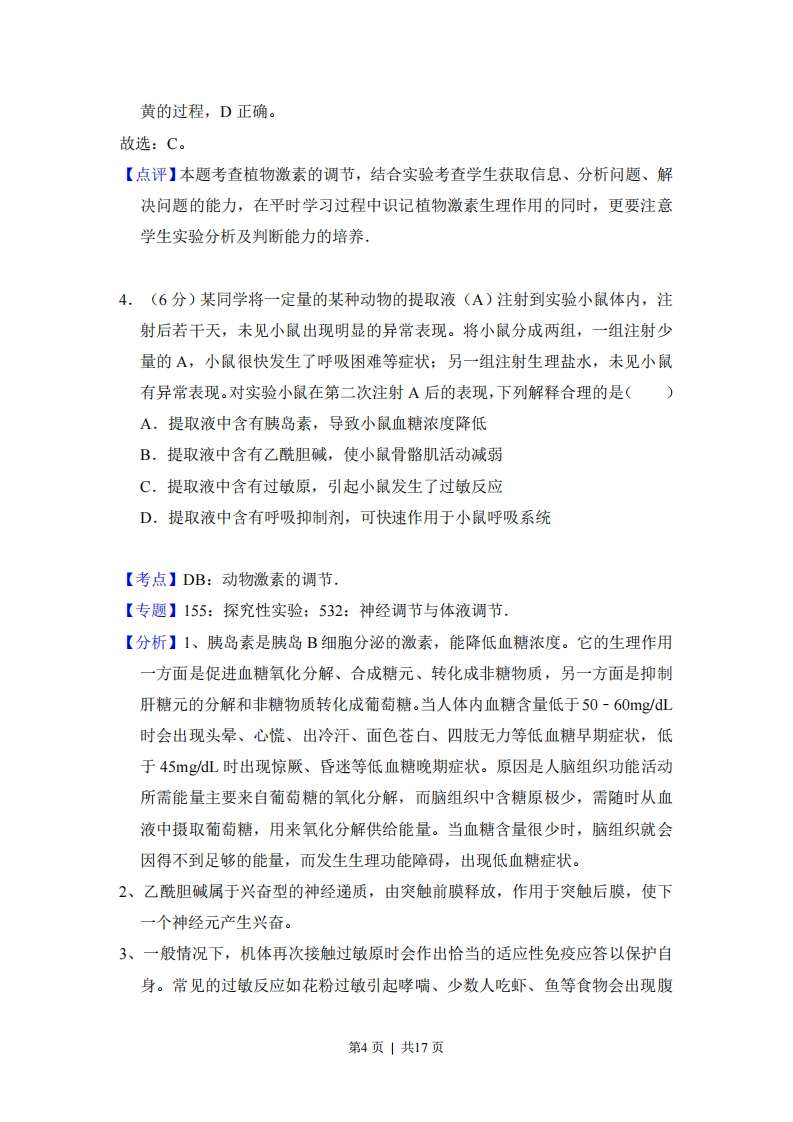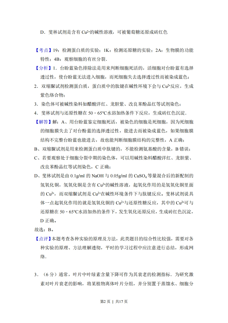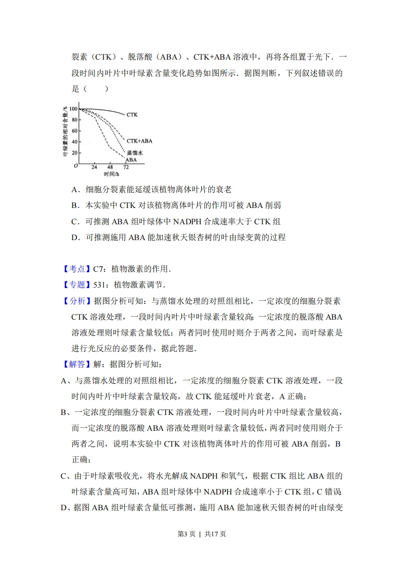2017年全国统一高考生物试卷(新课标I)事考答来与试想解析一、选择题:本题共6个小题,每小题6分,共36分。在每小题给出的四个选项中,只有一项是符合题目要求的。1,(6分)细胞间信息交流的方式有多种。在哺乳动物卵巢细胞分泌的雌激素作用于乳腺细胞的过程中,以及精子进入卵细胞的过程中,细胞间信息交流的实现分别依赖于()A.血液运输,突触传递B.淋巴运输,突触传递C.淋巴运输,胞间连丝传递D.血液运输,细胞间直接接触【考点】24:细胞膜的功能,【分析】细胞间信息交流的方式有三种:1.以化学信息形式通过血液运输完成,如激素:2.通过细胞之间的直接相互接触,如精子、卵细胞的识别:3.通过通道如胞间连丝完成,如植物细胞之间的信息传递。【解答】解:内分泌细胞分泌激素作用于靶细胞,如哺乳动物卵巢细胞分泌的雌激素,信号由分泌细胞通过血液循环运输传递到靶细胞,进行细胞间的信息交流:精子与卵细胞结合时,两者细胞膜表面直接相互接触,信息从一个细胞传递给另一个细胞,进行细胞间信息交流。故选:D。【点评】本题考查细胞膜的信息交流作用,信息交流的几种方式,比较基础,考查学生的理解与识记能力。2.(6分)下列关于细胞结构与成分的叙述,错误的是()A,细胞膜的完整性可用台盼蓝染色法进行检测B.检测氨基酸的含量可用双缩脲试剂进行显色C.若要观察处于细胞分裂中期的染色体可用醋酸洋红液染色第1页|共17页D.斐林试剂是含有C2的碱性溶液,可被葡萄糖还原成砖红色【考点】19:检测蛋白质的实验:1K:检测还原糖的实验:2A:生物膜的功能特性:4B:观察细胞的有丝分裂,【分析】1,台盼蓝染色排除法是用来判断细胞死活的,活细胞对台盼蓝有选择透过性,使台盼蓝无法进入细胞,而死细胞失去选择透过性而被染成蓝色:2.双缩脲试剂检测蛋白质,蛋白质中的肽键在碱性环境下会与C2反应,生成紫色络合物:3.染色体可被碱性染料如醋酸洋红、龙胆紫、改良苯酚品红等试剂染色:4.斐林试剂与还原性糖在50-65℃水浴加热条件下反应,生成砖红色沉淀,【解答】解:A、用台盼蓝鉴定细胞死活,被染色的细胞是死细胞,因为死细胞的细胞膜失去了对台酚蓝的选择透过性,能进去而被染成蓝色,如果细胞膜结构不完整台盼蓝也能进去,故也能判断细胞膜结构的完整性,A正确:B、双缩脲试剂是用来检测蛋白质中肽键的,不能检测氨基酸的含量,B错误:C、若要观察处于细胞分裂中期的染色体,可以用碱性染料醋酸洋红、龙胆紫、改良苯酚品红等试剂染色,C正确:D、斐林试剂是由0.1g/ml的NaOH与0.05g/ml的CuSO4等量混合后的新配制的氢氧化铜,氢氧化铜是含有C2的碱性溶液,起氧化作用的是氢氧化铜里面的Cu2,而双缩脲试剂是Cu在碱性环境条件下与肽键反应。斐林试剂说具体一点起氧化作用的就是氢氧化铜的Cu2与还原性糖反应,其中的Cu2可与还原糖在50-65℃水浴加热的条件下,发生氧化还原反应,生成砖红色沉淀,D正确。故选:B。【点评】本题考查各种实验的原理及方法,此类题目的综合性比较强,需要对各种实验的原理、方法理解透彻,平时的学习过程中应注意进行总结,形成网络3,(6分)通常,叶片中叶绿素含量下降可作为其衰老的检测指标.为研究激素对叶片衰老的影响,将某植物离体叶片分组,并分别置于蒸馏水、细胞分第2页|共17页裂素(CTK)、脱落酸(ABA)、CTK+ABA溶液中,再将各组置于光下,一段时间内叶片中叶绿素含量变化趋势如图所示.据图判断,下列叙述错误的是()100CTK8060CTK+ABA20·蒸馏水BA0424487时间hA,细胞分裂素能延缓该植物离体叶片的衰老B.本实验中CTK对该植物离体叶片的作用可被ABA削弱C.可推测ABA组叶绿体中NADPH合成速率大于CTK组D.可推测施用ABA能加速秋天银杏树的叶由绿变黄的过程【考点】C7:植物激素的作用.【专题】531:植物激素调节.【分析】据图分析可知:与蒸馏水处理的对照组相比,一定浓度的细胞分裂素CTK溶液处理,一段时间内叶片中叶绿素含量较高:一定浓度的脱落酸ABA溶液处理则叶绿素含量较低:两者同时使用时则介于两者之间,而叶绿素是进行光反应的必要条件,据此答题.【解答】解:据图分析可知:A、与蒸馏水处理的对照组相比,一定浓度的细胞分裂素CTK溶液处理,一段时间内叶片中叶绿素含量较高,故CTK能延缓叶片衰老,A正确:B、一定浓度的细胞分裂素CTK溶液处理,一段时间内叶片中叶绿素含量较高,而一定浓度的脱落酸ABA溶液处理则叶绿素含量较低,两者同时使用则介于两者之间,说明本实验中CTK对该植物离体叶片的作用可被ABA削弱,B正确:C、由于叶绿素吸收光,将水光解成NADPH和氧气,根据CTK组比ABA组的叶绿素含量高可知,ABA组叶绿体中NADPH合成速率小于CTK组,C错误D、据图ABA组叶绿素含量低可推测,施用ABA能加速秋天银杏树的叶由绿变第3页|共17页