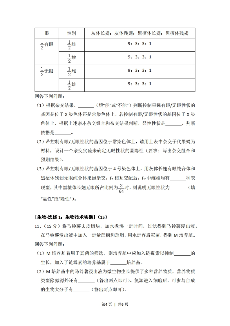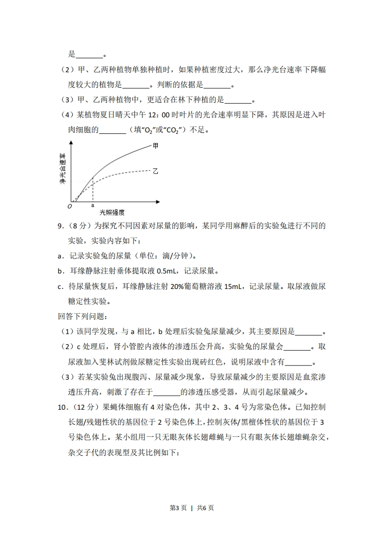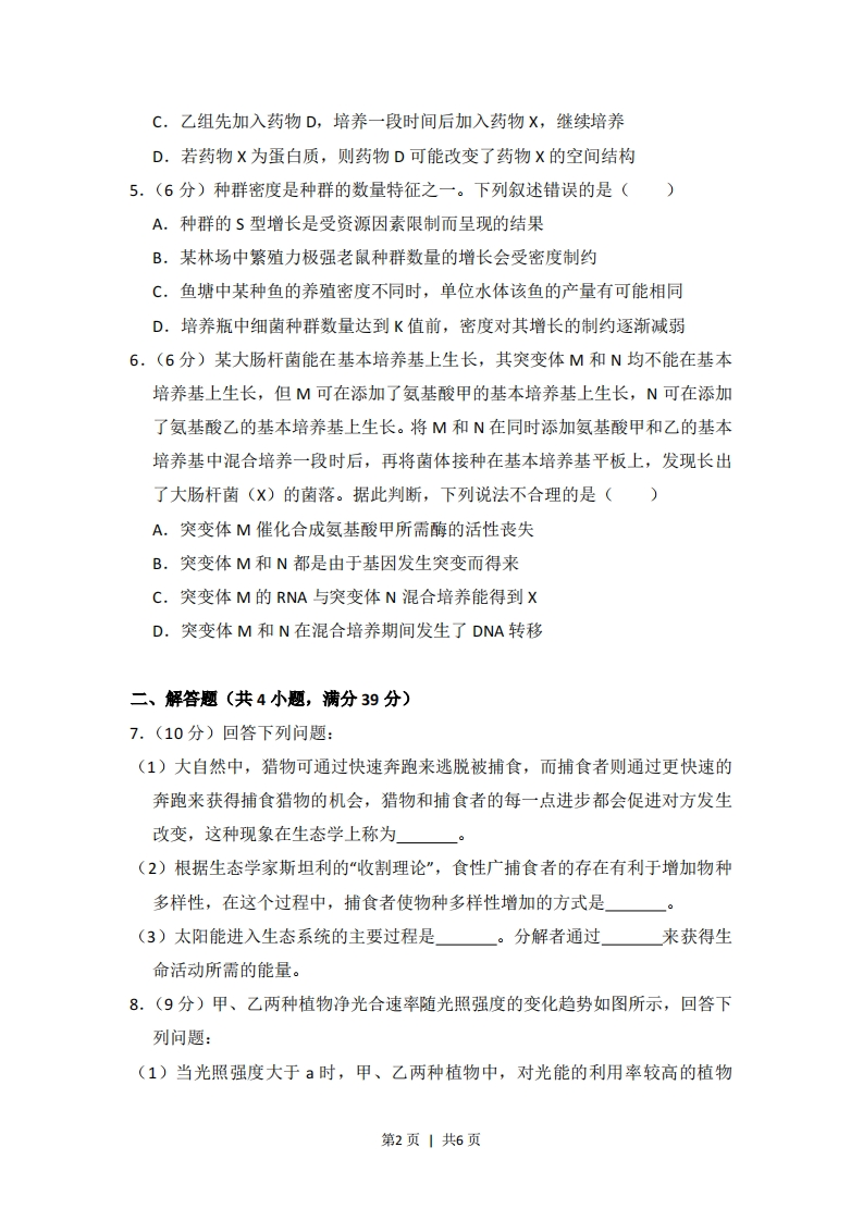 2018年全国统一高考生物试卷(新课标I)一、选择题(共6小题,每小题6分,满分36分)1.(6分)生物膜的结构与功能存在密切的联系,下列有关叙述错误的是()A.叶绿体的类囊体膜上存在催化ATP合成的酶B.溶酶体膜破裂后释放出的酶会造成细胞结构的破坏C.细胞的核膜是双层膜结构,核孔是物质进出细胞核的通道D.线粒体DNA位于线粒体外膜上,编码参与呼吸作用的酶2.(6分)生物体内的DNA常与蛋白质结合,以DNA-蛋白质复合物的形式存在。下列相关叙述错误的是()A.真核细胞染色体和染色质中都存在DNA-蛋白质复合物B.真核细胞的核中有DNA-蛋白质复合物,而原核细胞的拟核中没有C.若复合物中的某蛋白参与DNA复制,则该蛋白可能是DNA聚合酶D.若复合物中正在进行RNA的合成,则该复合物中含有RNA聚合酶3.(6分)下列有关植物根系吸收利用营养元素的叙述,错误的是()A.在酸性土壤中,小麦可吸收利用土壤中的N2和NO3B.农田适时松土有利于农作物根细胞对矿质元素的吸收C.土壤微生物降解植物秸秆产生的无机离子可被根系吸收D.给玉米施肥过多时,会因根系水分外流引起“烧苗”现象4.(6分)已知药物X对细胞增殖有促进作用,药物D可抑制药物X的作用。某同学将同一瓶小鼠皮肤细胞平均分为甲、乙、丙三组,分别置于培养液中培养,培养过程中进行不同的处理(其中甲组未加药物),每隔一段时间测定各组细胞数。结果如图所示。据图分析,下列相关叙述不合理的是()论乙组丙组甲组时间A.乙组加入了药物X后再进行培养B.丙组先加入药物X,培养一段时间后加入药物D,继续培养第1页1共6页C.乙组先加入药物D,培养一段时间后加入药物X,继续培养D.若药物X为蛋白质,则药物D可能改变了药物X的空间结构5.(6分)种群密度是种群的数量特征之一。下列叙述错误的是()A.种群的S型增长是受资源因素限制而呈现的结果B.某林场中繁殖力极强老鼠种群数量的增长会受密度制约C.鱼塘中某种鱼的养殖密度不同时,单位水体该鱼的产量有可能相同D.培养瓶中细菌种群数量达到K值前,密度对其增长的制约逐渐减弱6,(6分)某大肠杆菌能在基本培养基上生长,其突变体M和N均不能在基本培养基上生长,但M可在添加了氨基酸甲的基本培养基上生长,N可在添加了氨基酸乙的基本培养基上生长。将M和N在同时添加氨基酸甲和乙的基本培养基中混合培养一段时后,再将菌体接种在基本培养基平板上,发现长出了大肠杆菌(X)的菌落。据此判断,下列说法不合理的是()A.突变体M催化合成氨基酸甲所需酶的活性丧失B.突变体M和N都是由于基因发生突变而得来C.突变体M的RNA与突变体N混合培养能得到XD.突变体M和N在混合培养期间发生了DNA转移二、解答题(共4小题,满分39分)7.(10分)回答下列问题:(1)大自然中,猎物可通过快速奔跑来逃脱被捕食,而捕食者则通过更快速的奔跑来获得捕食猎物的机会,猎物和捕食者的每一点进步都会促进对方发生改变,这种现象在生态学上称为(2)根据生态学家斯坦利的“收割理论”,食性广捕食者的存在有利于增加物种多样性,在这个过程中,捕食者使物种多样性增加的方式是(3)太阳能进入生态系统的主要过程是。分解者通过来获得生命活动所需的能量。8.(9分)甲、乙两种植物净光合速率随光照强度的变化趋势如图所示,回答下列问题:(1)当光照强度大于a时,甲、乙两种植物中,对光能的利用率较高的植物第2页1共6页是(2)甲、乙两种植物单独种植时,如果种植密度过大,那么净光台速率下降幅度较大的植物是。判断的依据是(3)甲、乙两种植物中,更适合在林下种植的是(4)某植物夏日晴天中午12:00时叶片的光合速率明显下降,其原因是进入叶肉细胞的(填“02"或“C02")不足。甲如米典乙光照强度9,(8分)为探究不同因素对尿量的影响,某同学用麻醉后的实验兔进行不同的实验,实验内容如下:a,记录实验兔的尿量(单位:滴/分钟)。b,耳缘静脉注射垂体提取液0.5mL,记录尿量。c.待尿量恢复后,耳缘静脉注射20%葡萄糖溶液15mL,记录尿量。取尿液做尿糖定性实验。回答下列问题:(1)该同学发现,与a相比,b处理后实验兔尿量减少,其主要原因是(2)c处理后,肾小管腔内液体的渗透压会升高,实验兔的尿量会。取尿液加入斐林试剂做尿糖定性实验出现砖红色,说明尿液中含有(3)若某实验兔出现腹泻、尿量减少现象,导致尿量减少的主要原因是血浆渗透压升高,刺激了存在于的渗透压感受器,从而引起尿量减少。10.(12分)果蝇体细胞有4对染色体,其中2、3、4号为常染色体。已知控制长翅/残翅性状的基因位于2号染色体上,控制灰体/黑檀体性状的基因位于3号染色体上。某小组用一只无眼灰体长翅雌蝇与一只有眼灰体长翅雄蝇杂交,杂交子代的表现型及其比例如下:第3页1共6页