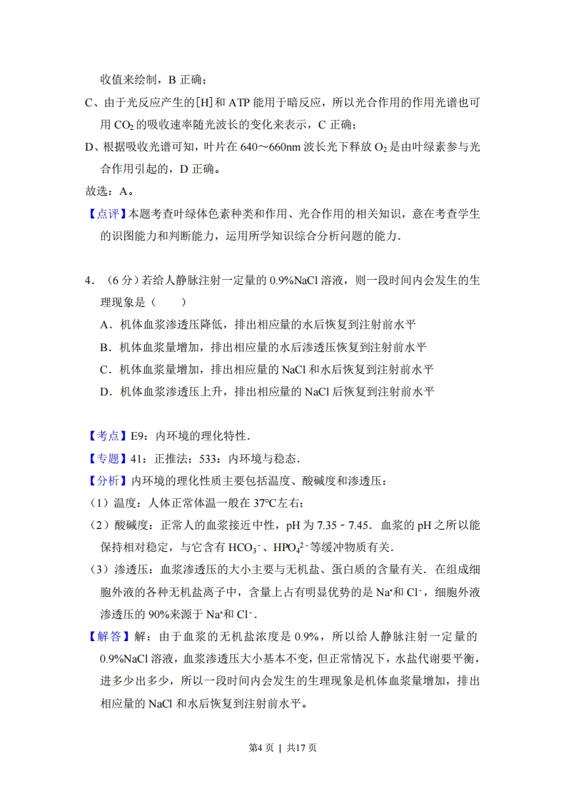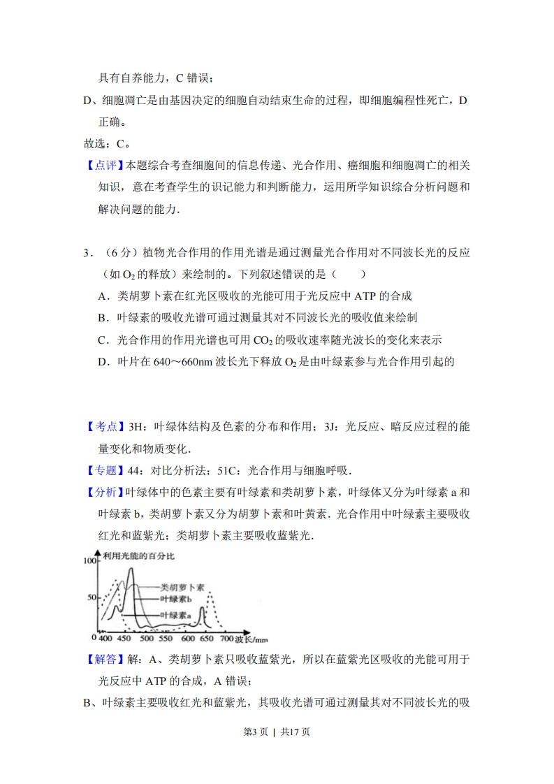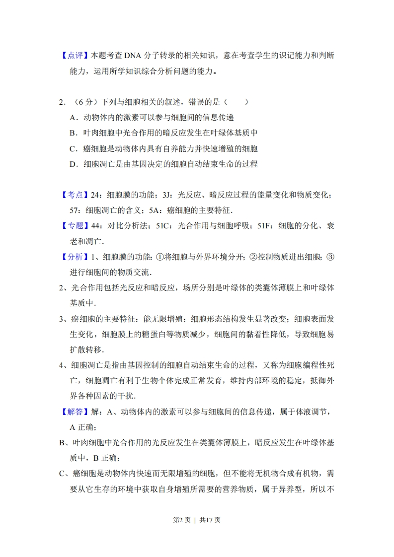 2017年全国高考统一生物试卷(新课标)事考答来与试想解析一、选择题:本题共6个小题,每小题6分,共36分,在每小题给出的四个选项中,只有一项是符合题目要求的。1.(6分)下列关于真核细胞中转录的叙述,错误的是()A,tRNA、rRNA和mRNA都从DNA转录而来B.同一细胞中两种RNA的合成有可能同时发生C.细胞中的RNA合成过程不会在细胞核外发生D.转录出的RNA链与模板链的相应区域碱基互补【考点】7F:遗传信息的转录和翻译.【专题】41:正推法:525:遗传信息的转录和翻译.【分析】转录是指在细胞内,以DNA一条链为模板,按照碱基互补配对原则,合成RNA的过程。RNA是核糖核酸的简称,有多种功能:①有少数酶是RNA,即某些RNA有催化功能;②某些病毒的遗传物质是RNA;③RNA是核糖体的构成成分;④mRNA携带着从DNA转录来的遗传信息:⑤tRNA可携带氨基酸进入核糖体中参与蛋白质的合成。【解答】解A、转录是以DNA一条链为模板,以核糖核苷酸为原料,合成RNA的过程,包括tRNA、rRNA和mRNA,A正确:B、不同的RNA由不同的基因转录而来,所以同一细胞中两种RNA的合成有可能同时发生,B正确:C、细胞中的RNA合成过程主要在细胞核内发生,在细胞质的线粒体和叶绿体中也能进行转录合成RNA,C错误:D、转录是以DNA一条链为模板,以核糖核苷酸为原料,遵循碱基互补配对原则,所以转录出的RNA链与模板链的相应区域碱基互补,D正确。故选:C。第1页|共17页【点评】本题考查DNA分子转录的相关知识,意在考查学生的识记能力和判断能力,运用所学知识综合分析问题的能力。2.(6分)下列与细胞相关的叙述,错误的是()A.动物体内的激素可以参与细胞间的信息传递B,叶肉细胞中光合作用的暗反应发生在叶绿体基质中C,癌细胞是动物体内具有自养能力并快速增殖的细胞D,细胞调亡是由基因决定的细胞自动结束生命的过程【考点】24:细胞膜的功能:3J:光反应、暗反应过程的能量变化和物质变化:57:细胞凋亡的含义:5A:癌细胞的主要特征,【专题】44:对比分析法:51C:光合作用与细胞呼吸:51F:细胞的分化、衰老和凋亡.【分析】1、细胞膜的功能:①将细胞与外界环境分开:②控制物质进出细胞:③进行细胞间的物质交流,2、光合作用包括光反应和暗反应,场所分别是叶绿体的类囊体薄膜上和叶绿体基质中3、癌细胞的主要特征:能无限增殖:细胞形态结构发生显著改变:细胞表面发生变化,细胞膜上的糖蛋白等物质减少,细胞间的黏着性降低,导致细胞易扩散转移,4、细胞凋亡是指由基因控制的细胞自动结束生命的过程,又称为细胞编程性死亡,细胞调亡有利于生物个体完成正常发育,维持内部环境的稳定,抵御外界各种因素的干扰,【解答】解:A、动物体内的激素可以参与细胞间的信息传递,属于体液调节,A正确:B、叶肉细胞中光合作用的光反应发生在类囊体薄膜上,暗反应发生在叶绿体基质中,B正确:C、癌细胞是动物体内快速而无限增殖的细胞,但不能将无机物合成有机物,需要从它生存的环境中获取自身增殖所需要的营养物质,属于异养型,所以不第2页|共17页具有自养能力,C错误:D、细胞调亡是由基因决定的细胞自动结束生命的过程,即细胞编程性死亡,D正确。故选:C。【点评】本题综合考查细胞间的信息传递、光合作用、癌细胞和细胞调亡的相关知识,意在考查学生的识记能力和判断能力,运用所学知识综合分析问题和解决问题的能力.3.(6分)植物光合作用的作用光谱是通过测量光合作用对不同波长光的反应(如O2的释放)来绘制的。下列叙述错误的是()A.类胡萝卜素在红光区吸收的光能可用于光反应中ATP的合成B,叶绿素的吸收光谱可通过测量其对不同波长光的吸收值来绘制C.光合作用的作用光谱也可用CO2的吸收速率随光波长的变化来表示D.叶片在640~660nm波长光下释放O2是由叶绿素参与光合作用引起的【考点】3H:叶绿体结构及色素的分布和作用:3J:光反应、暗反应过程的能量变化和物质变化【专题】44:对比分析法:51C:光合作用与细胞呼吸.【分析】叶绿体中的色素主要有叶绿素和类胡萝卜素,叶绿体又分为叶绿素和叶绿素b,类胡萝卜素又分为胡萝卜素和叶黄素.光合作用中叶绿素主要吸收红光和蓝紫光:类胡萝卜素主要吸收蓝紫光:10个利用光能的百分比类胡萝卜素叶绿素b0.0叶绿素m0400450500550600650700波长/mm【解答】解:A、类胡萝卜素只吸收蓝紫光,所以在蓝紫光区吸收的光能可用于光反应中ATP的合成,A错误:B、叶绿素主要吸收红光和蓝紫光,其吸收光谱可通过测量其对不同波长光的吸第3页|共17页