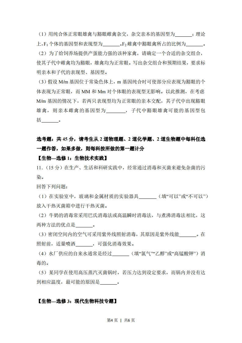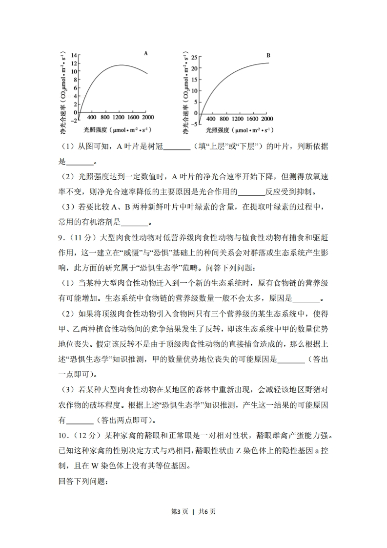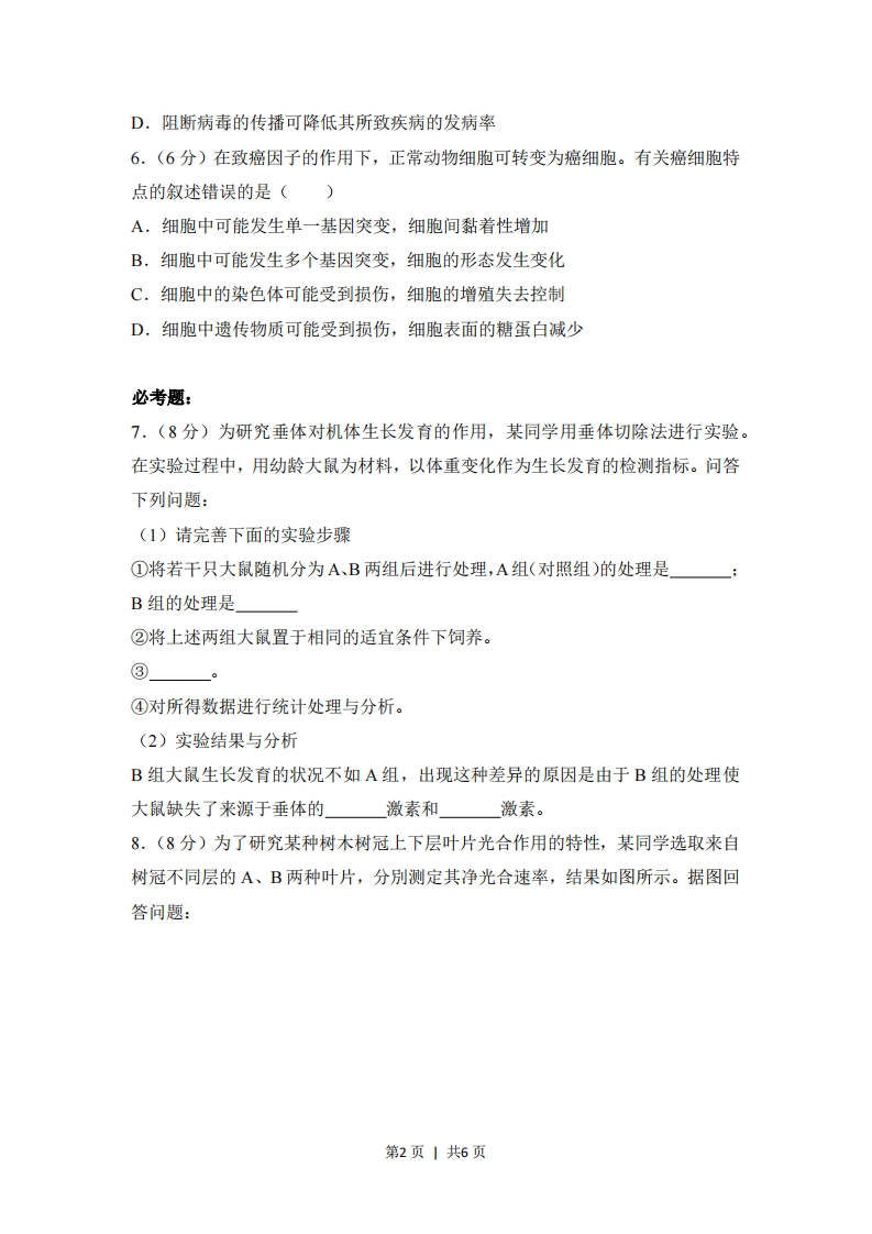 2018年全国统一高考生物试卷(新课标Ⅱ)一、选择题:本题共6小题,每小题6分,共36分,在每小题给出的四个选项中,只有一项是符合题目要求的。1.(6分)下列关于人体中蛋白质功能的叙述,错误的是()A.浆细胞产生的抗体可结合相应的病毒抗原B.肌细胞中的某些蛋白质参与肌肉收缩的过程C.蛋白质结合Mg2+形成的血红蛋白参与O2运输D.细胞核中某些蛋白质是染色体的重要组成成分2.(6分)下列有关物质跨膜运输的叙述,正确的是()A.巨噬细胞摄入病原体的过程属于协助扩散B.固醇类激素进入靶细胞的过程属于主动运输C.神经细胞受到刺激时产生的Na内流属于被动运输D.护肤品中的甘油进入皮肤细胞的过程属于主动运输3.(6分)下列有关人体内激素的叙述,正确的是()A.运动时,肾上腺素水平升高,可使心率加快,说明激素是高能化合物B.饥饿时,胰高血糖素水平升高,促进糖原分解,说明激素具有酶的催化活性C.进食后,胰岛素水平升高,其既可加速糖原合成,也可作为细胞的结构组分D.青春期,性激素水平升高,随体液到达靶细胞,与受体结合可促进机体发育4.(6分)有些作物的种子入库前需要经过风干处理。与风干前相比,下列说法错误的是()A.风干种子中有机物的消耗减慢B.风干种子上微生物不易生长繁殖C.风干种子中细胞呼吸作用的强度高D.风干种子中结合水与自由水的比值大5.(6分)下列关于病毒的叙述,错误的是()A.从烟草花叶病毒中可以提取到RNAB.T2噬菌体可感染肺炎双球菌导致其裂解C.HIV可引起人的获得性免疫缺陷综合征第1页1共6页D.阻断病毒的传播可降低其所致疾病的发病率6.(6分)在致癌因子的作用下,正常动物细胞可转变为癌细胞。有关癌细胞特点的叙述错误的是()A.细胞中可能发生单一基因突变,细胞间黏着性增加B.细胞中可能发生多个基因突变,细胞的形态发生变化C.细胞中的染色体可能受到损伤,细胞的增殖失去控制D.细胞中遗传物质可能受到损伤,细胞表面的糖蛋白减少必考题:7.(8分)为研究垂体对机体生长发育的作用,某同学用垂体切除法进行实验。在实验过程中,用幼龄大鼠为材料,以体重变化作为生长发育的检测指标。问答下列问题:(1)请完普下面的实验步骤①将若干只大鼠随机分为A、B两组后进行处理,A组(对照组)的处理是B组的处理是②将上述两组大鼠置于相同的适宜条件下饲养。③④对所得数据进行统计处理与分析。(2)实验结果与分析B组大鼠生长发育的状况不如A组,出现这种差异的原因是由于B组的处理使大鼠缺失了来源于垂体的激素和激素。8.(8分)为了研究某种树木树冠上下层叶片光合作用的特性,某同学选取来自树冠不同层的A、B两种叶片,分别测定其净光合速率,结果如图所示。据图回答问题:第2页1共6页261025060-2400800120016002000400800120016002000-5L光照强度(umol.m2,s)光照强度(μmolm2·s)(1)从图可知,A叶片是树冠(填“上层”或下层”)的叶片,判断依据是(2)光照强度达到一定数值时,A叶片的净光合速率开始下降,但测得放氧速率不变,则净光合速率降低的主要原因是光合作用的反应受到抑制。(3)若要比较A、B两种新鲜叶片中叶绿素的含量,在提取叶绿素的过程中,常用的有机溶剂是9.(11分)大型肉食性动物对低营养级肉食性动物与植食性动物有捕食和驱赶作用,这一建立在“威慑”与恐惧”基础上的种间关系会对群落或生态系统产生影响,此方面的研究属于“恐惧生态学”范畴。问答下列问题:(1)当某种大型肉食性动物迁入到一个新的生态系统时,原有食物链的营养级有可能增加。生态系统中食物链的营养级数量一般不会太多,原因是(2)如果将顶级肉食性动物引入食物网只有三个营养级的某生态系统中,使得甲、乙两种植食性动物间的竞争结果发生了反转,即该生态系统中甲的数量优势地位丧失。假定该反转不是由于顶级肉食性动物的直接捕食造成的,那么根据上述“恐惧生态学”知识推测,甲的数量优势地位丧失的可能原因是(答出一点即可)。(3)若某种大型肉食性动物在某地区的森林中重新出现,会减轻该地区野猪对农作物的破坏程度。根据上述恐惧生态学”知识推测,产生这一结果的可能原因有(答出两点即可)。10.(12分)某种家禽的豁眼和正常眼是一对相对性状,豁眼雌禽产蛋能力强。已知这种家禽的性别决定方式与鸡相同,豁眼性状由Z染色体上的隐性基因控制,且在W染色体上没有其等位基因。回答下列问题:第3页1共6页