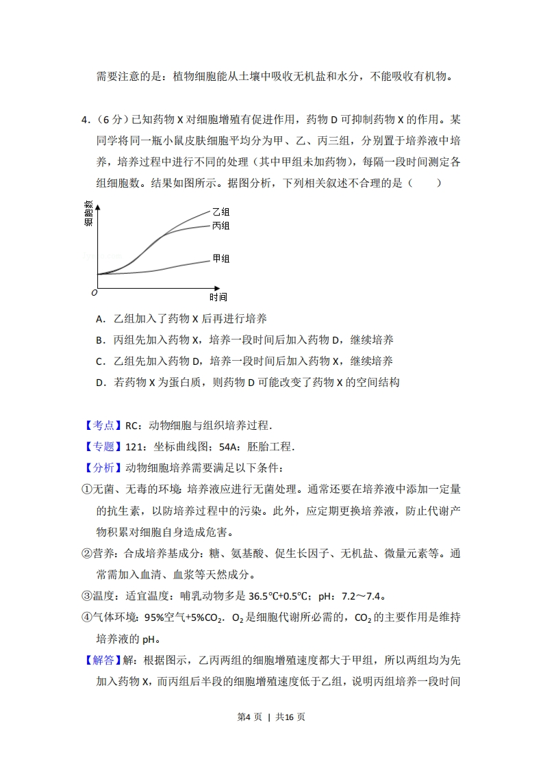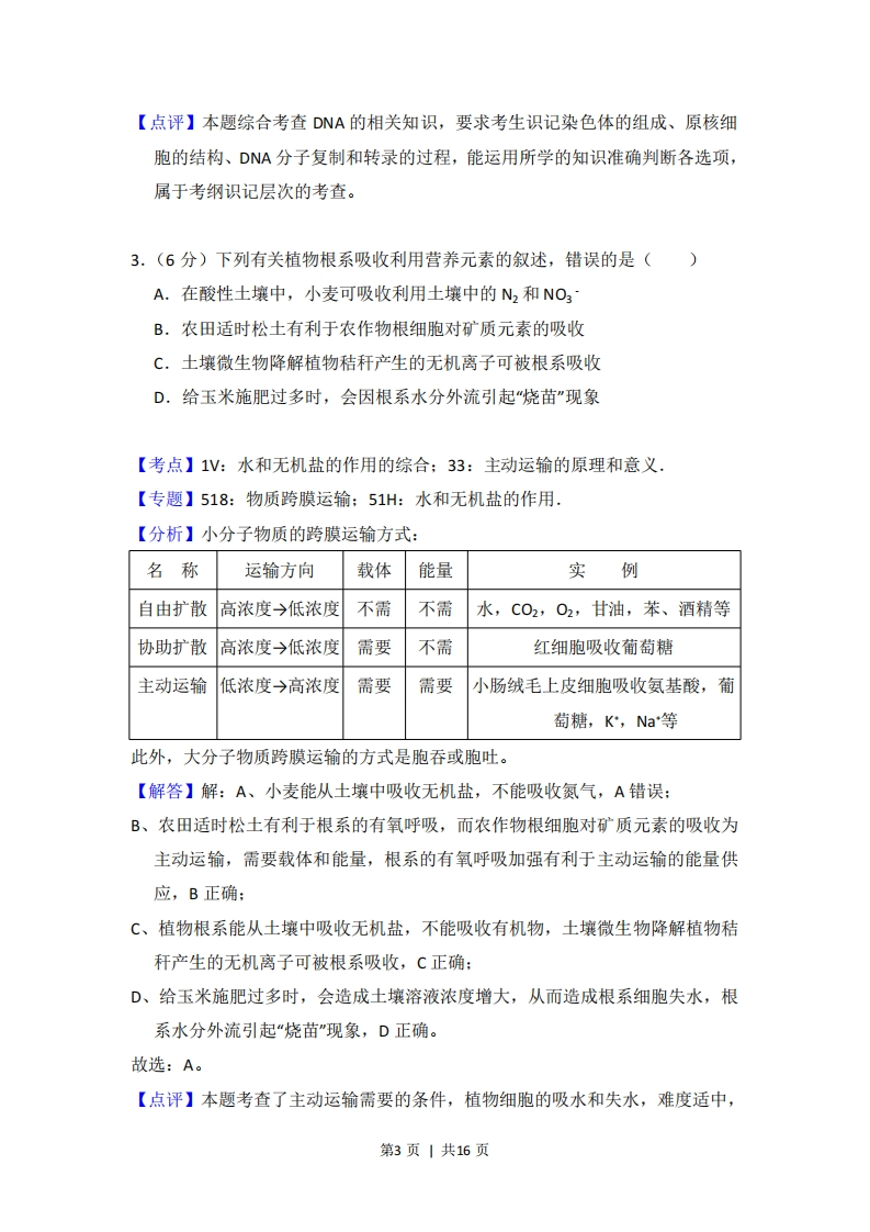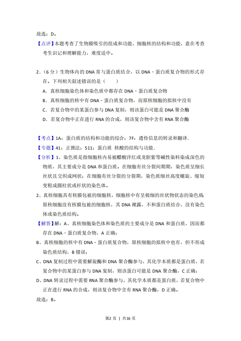 2018年全国统一高考生物试卷(新课标I)事考答案与试题佩折一、选择题(共6小题,每小题6分,满分36分)1.(6分)生物膜的结构与功能存在密切的联系,下列有关叙述错误的是()A.叶绿体的类囊体膜上存在催化ATP合成的酶B.溶酶体膜破裂后释放出的酶会造成细胞结构的破坏C.细胞的核膜是双层膜结构,核孔是物质进出细胞核的通道D.线粒体DNA位于线粒体外膜上,编码参与呼吸作用的酶【考点】2C:细胞膜系统的结构和功能:2G:细胞核的结构和功能.【专题】515:生物膜系统:517:细胞核.【分析】细胞的生物膜系统包括细胞膜、细胞器膜和核膜,生物膜系统在细胞的生命活动中起着极其重要的作用。首先,细胞膜不仅使细胞具有一个相对稳定的内环境,同时在细胞与环境之间进行物质运输、能量转换和信息传递的过程中也起着决定性的作用。第二,细胞的许多重要的化学反应都在生物膜上进行。细胞内的广阔的膜面积为酶提供了大量的附着位点,为各种化学反应的顺利进行创造了有利条件。第三,细胞内的生物膜把细胞分隔成一个个小的区室,这样就使得细胞内能够同时进行多种化学反应,而不会相互干扰,保证了细胞的生命活动高效、有序地进行。【解答】解:A、叶绿体的类囊体膜是光反应的场所,而光反应有ATP的生成,故叶绿体的类囊体膜上存在催化ATP合成的酶,A正确:B、溶酶体内含有多种水解酶,溶酶体膜破裂后释放出的酶会造成细胞结构的破坏,B正确:C、细胞的核膜是双层膜结构,核孔是某些物质(如酶、RNA等)进出细胞核的通道,C正确:D、线粒体DNA位于线粒体内,可以编码部分参与呼吸作用的酶,D错误。第1页|共16页故选:D。【点评】本题考查了生物膜吸引的组成和功能,细胞核的结构和功能,意在考查考生识记和理解能力,难度适中。2.(6分)生物体内的DNA常与蛋白质结合,以DNA-蛋白质复合物的形式存在。下列相关叙述错误的是()A.真核细胞染色体和染色质中都存在DNA-蛋白质复合物B.真核细胞的核中有DNA-蛋白质复合物,而原核细胞的拟核中没有C.若复合物中的某蛋白参与DNA复制,则该蛋白可能是DNA聚合酶D.若复合物中正在进行RNA的合成,则该复合物中含有RNA聚合酶【考点】1A:蛋白质的结构和功能的综合:7F:遗传信息的转录和翻译.【专题】41:正推法:511:蛋白质核酸的结构与功能【分析】1、染色质是指细胞核内易被醋酸洋红或龙胆紫等碱性染料染成深色的物质,其主要成分是DNA和蛋白质。在细胞有丝分裂间期期,染色质呈细长丝状且交织成网状:在细胞有丝分裂的分裂期,染色质细丝高度螺旋、缩短变粗成圆柱状或杆状的染色体。2、真核细胞具有核膜包被的细胞核,细胞核中有呈极细的丝状物状态的染色质原核细胞没有核膜包被的细胞核,其DNA裸露,不和蛋白质结合,没有染色体或染色质结构。【解答】解:A、真核细胞染色体和染色质的主要成分是DNA和蛋白质,因而都存在DNA-蛋白质复合物,A正确:B、真核细胞的核中有DNA~蛋白质复合物,原核细胞的拟核中也有,但不形成染色质结构,B错误:C、DNA复制过程中需要解旋酶和DNA聚合酶参与,其化学本质都是蛋白质,若复合物中的某蛋白参与DNA复制,则该蛋白可能是DNA聚合酶,C正确:D、DNA转录过程中需要RNA聚合酶参与,其化学本质都是蛋白质,若复合物中正在进行RNA的合成,则该复合物中含有RNA聚合酶,D正确。故选:B。第2页|共16页【点评】本题综合考查DNA的相关知识,要求考生识记染色体的组成、原核细胞的结构、DNA分子复制和转录的过程,能运用所学的知识准确判断各选项,属于考纲识记层次的考查。3.(6分)下列有关植物根系吸收利用营养元素的叙述,错误的是()A.在酸性土壤中,小麦可吸收利用土壤中的N2和NO3B.农田适时松土有利于农作物根细胞对矿质元素的吸收C,土壤微生物降解植物秸秆产生的无机离子可被根系吸收D.给玉米施肥过多时,会因根系水分外流引起"烧苗”现象【考点】1V:水和无机盐的作用的综合:33:主动运输的原理和意义,【专题】518:物质跨膜运输:51H:水和无机盐的作用,【分析】小分子物质的跨膜运输方式:名称运输方向载体能量实例自由扩散高浓度→低浓度不需不需水,C02,O2,甘油,苯、酒精等协助扩散高浓度→低浓度需要不需红细胞吸收葡萄糖主动运输低浓度→高浓度需要需要小肠绒毛上皮细胞吸收氨基酸,葡萄糖,K,Na等此外,大分子物质跨膜运输的方式是胞吞或胞吐。【解答】解:A、小麦能从土壤中吸收无机盐,不能吸收氮气,A错误:B、农田适时松土有利于根系的有氧呼吸,而农作物根细胞对矿质元素的吸收为主动运输,需要载体和能量,根系的有氧呼吸加强有利于主动运输的能量供应,B正确:C、植物根系能从土壤中吸收无机盐,不能吸收有机物,土壤微生物降解植物秸秆产生的无机离子可被根系吸收,C正确:D、给玉米施肥过多时,会造成土壤溶液浓度增大,从而造成根系细胞失水,根系水分外流引起“烧苗”现象,D正确。故选:A。【点评】本题考查了主动运输需要的条件,植物细胞的吸水和失水,难度适中,第3页|共16页