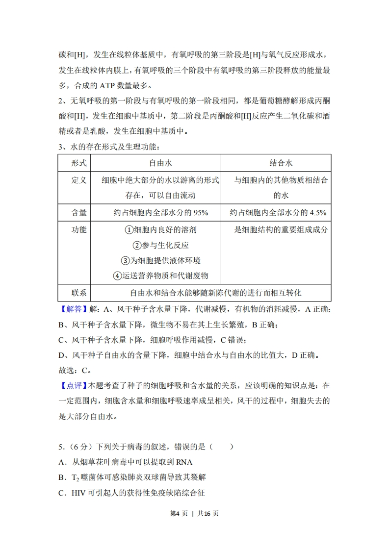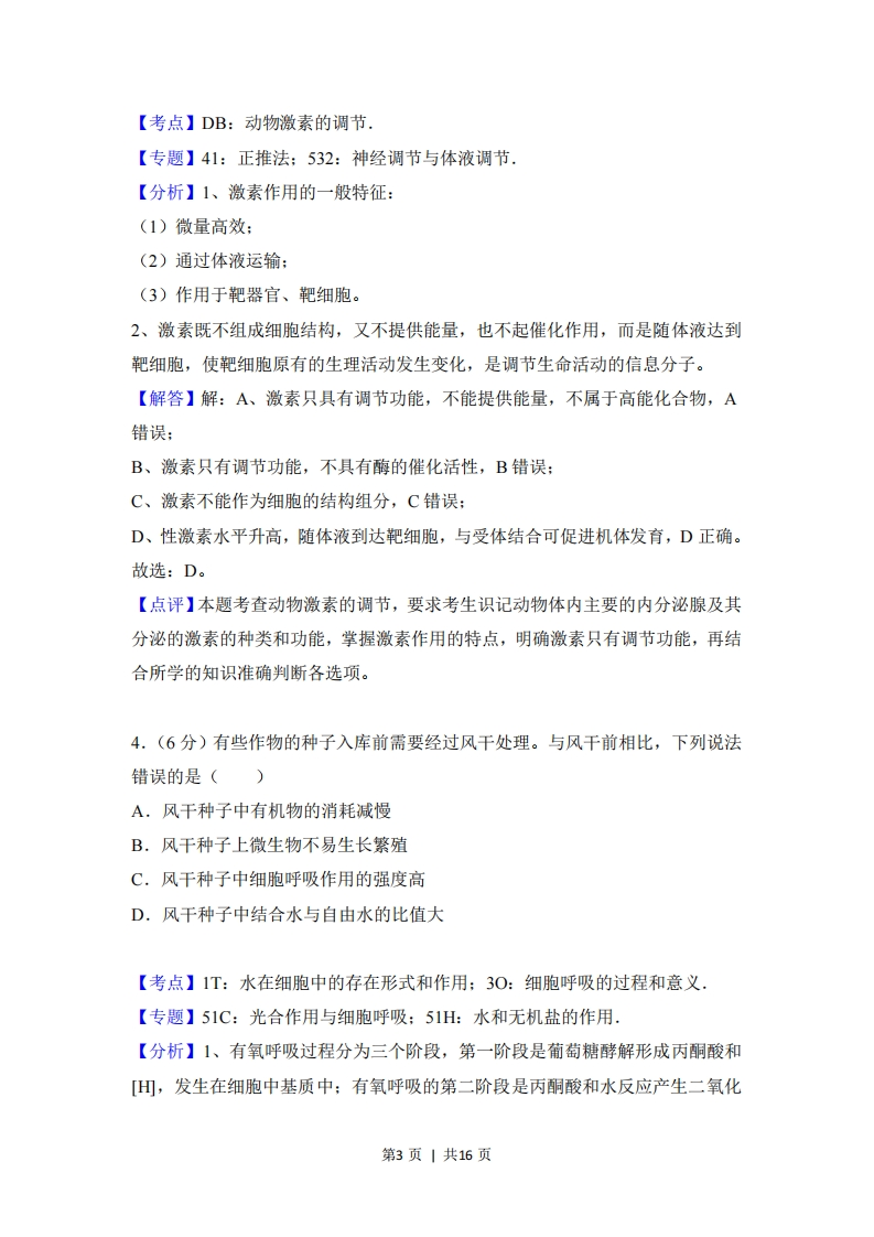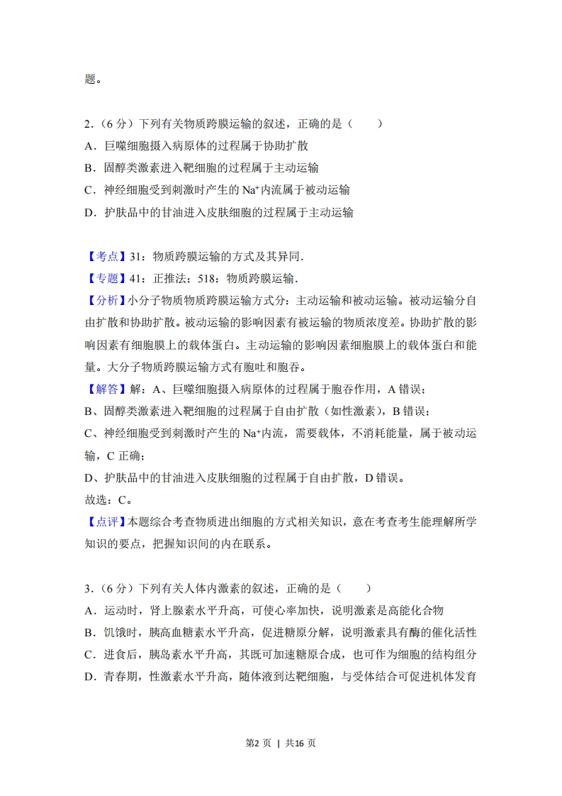 2018年全国统一高考生物试卷(新课标Ⅱ)套考答案与试题解析一、选择题:本题共6小题,每小题6分,共36分,在每小题给出的四个选项中,只有一项是符合题目要求的。1.(6分)下列关于人体中蛋白质功能的叙述,错误的是()A.浆细胞产生的抗体可结合相应的病毒抗原B.肌细胞中的某些蛋白质参与肌肉收缩的过程C.蛋白质结合Mg2+形成的血红蛋白参与O2运输D.细胞核中某些蛋白质是染色体的重要组成成分【考点】17:蛋白质在生命活动中的主要功能,【专题】41:正推法:511:蛋白质核酸的结构与功能.【分析】蛋白质的功能~生命活动的主要承担者:①构成细胞和生物体的重要物质,即结构蛋白,如羽毛、头发、蛛丝、肌动蛋白:②催化作用:如绝大多数酶:③传递信息,即调节作用:如胰岛素、生长激素:④免疫作用:如免疫球蛋白(抗体):⑤运输作用:如红细胞中的血红蛋白。【解答】解:A、浆细胞产生的抗体可结合相应的病毒抗原,产生抗原抗体复合物,A正确:B、肌细胞中的某些蛋白质参与肌肉收缩的过程,如肌动蛋白和肌球蛋白,B正确:C、蛋台质结合Fe+形成的血红蛋白参与O2运输,C错误:D、染色体主要由DNA和蛋白质组成,细胞核中某些蛋白质是染色体的重要组成成分,D正确。故选:C。【点评】本题考查了蛋白质的功能,意在考查考生的识记和应用能力,属于基础第1页|共16页题。2.(6分)下列有关物质跨膜运输的叙述,正确的是()A.巨噬细胞摄入病原体的过程属于协助扩散B.固醇类激素进入靶细胞的过程属于主动运输C.神经细胞受到刺激时产生的Na*内流属于被动运输D.护肤品中的甘油进入皮肤细胞的过程属于主动运输【考点】31:物质跨膜运输的方式及其异同,【专题】41:正推法:518:物质跨膜运输.【分析】小分子物质物质跨膜运输方式分:主动运输和被动运输。被动运输分自由扩散和协助扩散。被动运输的影响因素有被运输的物质浓度差。协助扩散的影响因素有细胞膜上的载体蛋白。主动运输的影响因素细胞膜上的载体蛋白和能量。大分子物质跨膜运输方式有胞吐和胞吞。【解答】解:A、巨噬细胞摄入病原体的过程属于胞吞作用,A错误:B、固醇类激素进入靶细胞的过程属于自由扩散(如性激素),B错误:C、神经细胞受到刺激时产生的N+内流,需要载体,不消耗能量,属于被动运输,C正确:D、护肤品中的甘油进入皮肤细胞的过程属于自由扩散,D错误。故选:C。【点评】本题综合考查物质进出细胞的方式相关知识,意在考查考生能理解所学知识的要点,把握知识间的内在联系。3.(6分)下列有关人体内激素的叙述,正确的是()A.运动时,肾上腺素水平升高,可使心率加快,说明激素是高能化合物B.饥饿时,胰高血糖素水平升高,促进糖原分解,说明激素具有酶的催化活性C.进食后,胰岛素水平升高,其既可加速糖原合成,也可作为细胞的结构组分D.青春期,性激素水平升高,随体液到达靶细胞,与受体结合可促进机体发育第2页|共16页【考点】DB:动物激素的调节,【专题】41:正推法:532:神经调节与体液调节.【分析】1、激素作用的一般特征:(1)微量高效:(2)通过体液运输:(3)作用于靶器官、靶细胞。2、激素既不组成细胞结构,又不提供能量,也不起催化作用,而是随体液达到靶细胞,使靶细胞原有的生理活动发生变化,是调节生命活动的信息分子。【解答】解:A、激素只具有调节功能,不能提供能量,不属于高能化合物,A错误:B、激素只有调节功能,不具有酶的催化活性,B错误:C、激素不能作为细胞的结构组分,C错误:D、性激素水平升高,随体液到达靶细胞,与受体结合可促进机体发育,D正确。故选:D。【点评】本题考查动物激素的调节,要求考生识记动物体内主要的内分泌腺及其分泌的激素的种类和功能,掌握激素作用的特点,明确激素只有调节功能,再结合所学的知识准确判断各选项。4.(6分)有些作物的种子入库前需要经过风干处理。与风干前相比,下列说法错误的是()A.风干种子中有机物的消耗减慢B.风干种子上微生物不易生长繁殖C.风干种子中细胞呼吸作用的强度高D.风干种子中结合水与自由水的比值大【考点】1T:水在细胞中的存在形式和作用:3O:细胞呼吸的过程和意义:【专题】51C:光合作用与细胞呼吸;51H:水和无机盐的作用【分析】1、有氧呼吸过程分为三个阶段,第一阶段是葡萄糖酵解形成丙酮酸和[田,发生在细胞中基质中:有氧呼吸的第二阶段是丙酮酸和水反应产生二氧化第3页|共16页