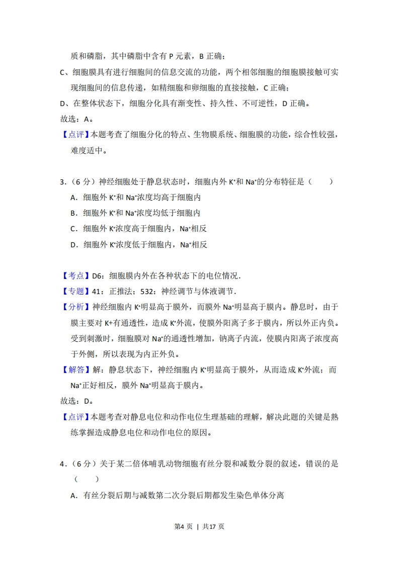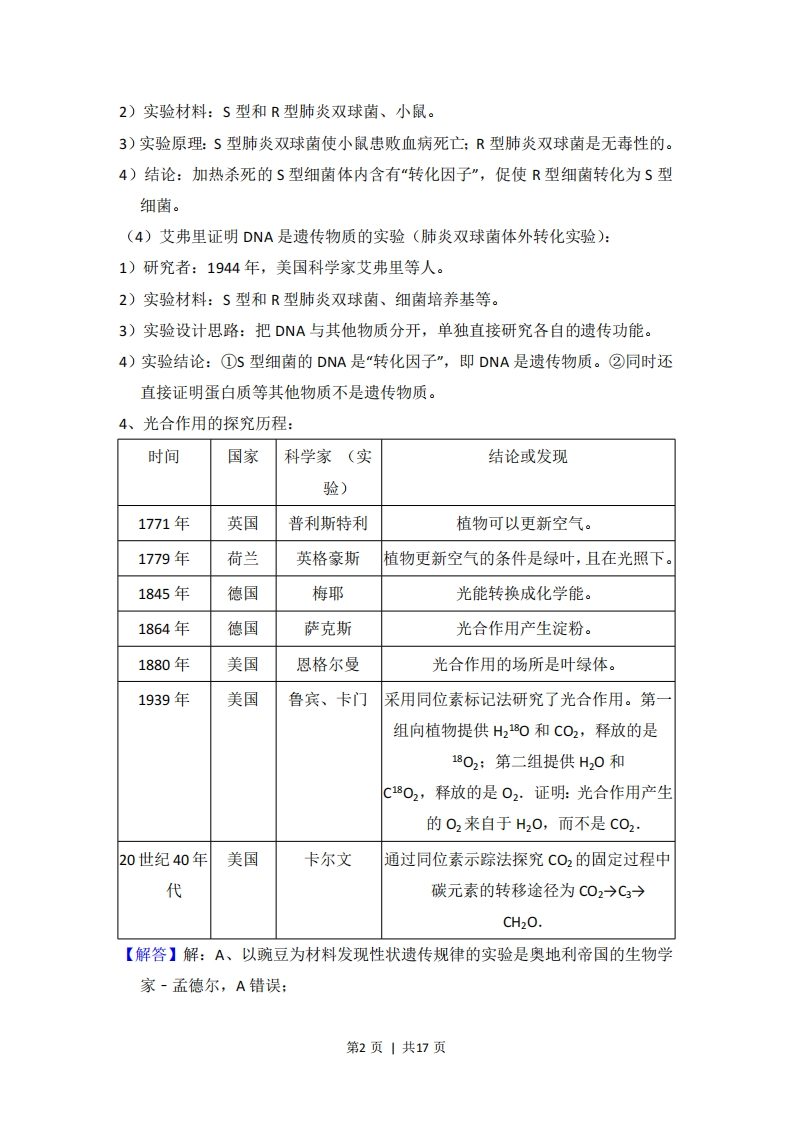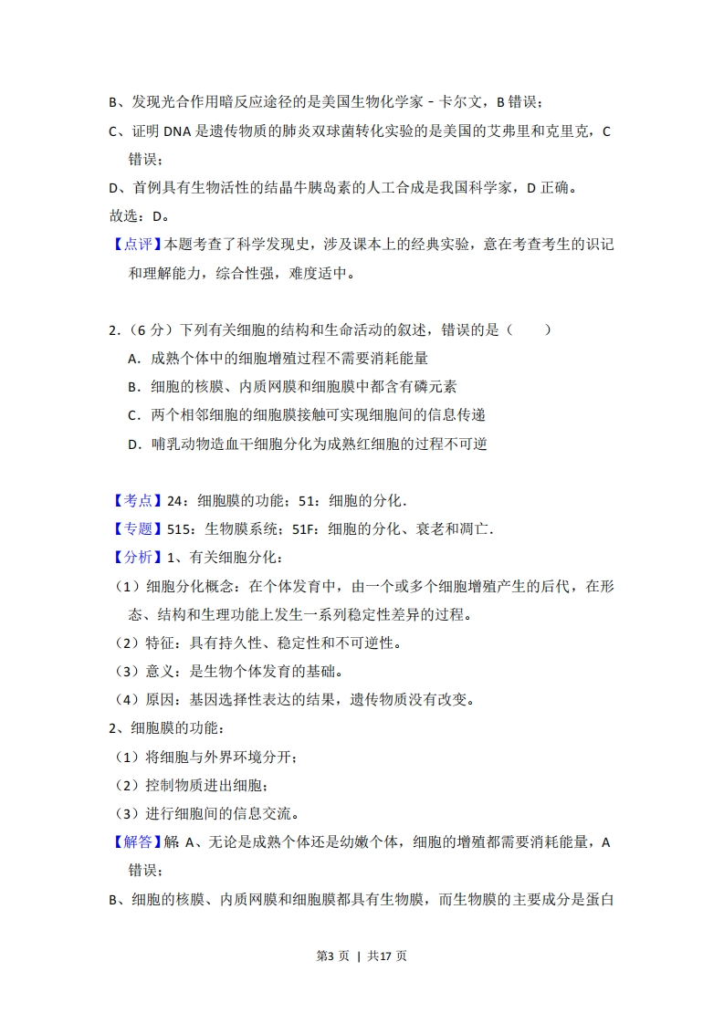2018年全国统一高考生物试卷(新课标Ⅲ)考答来与试题解析一、选择题:本题共6题,每小题6分,共36分。在每小题给出的四个选项中,只有一项是符合题目要求的1.(6分)下列研究工作中由我国科学家完成的是()A.以豌豆为材料发现性状遗传规律的实验B.用小球藻发现光合作用暗反应途径的实验C.证明DNA是遗传物质的肺炎双球菌转化实验D.首例具有生物活性的结晶牛胰岛素的人工合成【考点】3G:光合作用的发现史:3:光反应、暗反应过程的能量变化和物质变化:71:人类对遗传物质的探究历程:72:肺炎双球菌转化实验:81:孟德尔遗传实验,【专题】41:正推法:51C:光合作用与细胞呼吸:526:孟德尔遗传实验.【分析】1、艾弗里证明DNA是遗传物质的实验是肺炎双球菌体外转化实验:2、孟德尔乙豌豆为实验材料,利用假说演绎法证明了两大遗传定律:3、肺炎双球菌转化实验(体内转化实验):(1)转化的概念:转化是指受体细胞直接摄取供体细胞的遗传物质(DNA片段),将其同源部分进行碱基配对,组合到自己的基因中,从而获得供体细胞的某些遗传性状,这种变异现象,称为转化。(2)肺炎双球菌S型细菌R型细菌菌落光滑粗糙菌体有多糖类荚膜无多糖类荚膜毒性有毒性,使小鼠患败血症死亡无毒性(3)肺炎双球菌体内转化实验1)研究者:1928年,英国科学家格里菲思。第1页|共17页2)实验材料:S型和R型肺炎双球菌、小鼠。3)实验原理:S型肺炎双球菌使小鼠患败血病死亡:R型肺炎双球菌是无毒性的。4)结论:加热杀死的S型细菌体内含有“转化因子”,促使R型细菌转化为S型细菌。(4)艾弗里证明DNA是遗传物质的实验(肺炎双球菌体外转化实验):1)研究者:1944年,美国科学家艾弗里等人。2)实验材料:S型和R型肺炎双球菌、细菌培养基等。3)实验设计思路:把DNA与其他物质分开,单独直接研究各自的遗传功能。4)实验结论:①S型细菌的DNA是“转化因子”,即DNA是遗传物质。②同时还直接证明蛋白质等其他物质不是遗传物质。4、光合作用的探究历程:时间国家科学家(实结论或发现验)1771年英国普利斯特利植物可以更新空气。1779年荷兰英格豪斯植物更新空气的条件是绿叶,且在光照下。1845年德国梅耶光能转换成化学能。1864年德国萨克斯光合作用产生淀粉。1880年美国恩格尔曼光合作用的场所是叶绿体。1939年美国鲁宾、卡门采用同位素标记法研究了光合作用。第组向植物提供H2180和CO2,释放的是1802:第二组提供H20和C1802,释放的是02·证明:光合作用产生的02来自于H20,而不是C0220世纪40年美国卡尔文通过同位素示踪法探究C02的固定过程中代碳元素的转移途径为C02→C3→CH20.【解答】解:A、以豌豆为材料发现性状遗传规律的实验是奥地利帝国的生物学家-孟德尔,A错误:第2页|共17页B、发现光合作用暗反应途径的是美国生物化学家-卡尔文,B错误:C、证明DNA是遗传物质的肺炎双球菌转化实验的是美国的艾弗里和克里克,C错误:D、首例具有生物活性的结晶牛胰岛素的人工合成是我国科学家,D正确。故选:D。【点评】本题考查了科学发现史,涉及课本上的经典实验,意在考查考生的识记和理解能力,综合性强,难度适中。2.(6分)下列有关细胞的结构和生命活动的叙述,错误的是()A.成熟个体中的细胞增殖过程不需要消耗能量B.细胞的核膜、内质网膜和细胞膜中都含有磷元素C.两个相邻细胞的细胞膜接触可实现细胞间的信息传递D.哺乳动物造血干细胞分化为成熟红细胞的过程不可逆【考点】24:细胞膜的功能:51:细胞的分化:【专题】515:生物膜系统:51F:细胞的分化、衰老和调亡.【分析】1、有关细胞分化:(1)细胞分化概念:在个体发育中,由一个或多个细胞增殖产生的后代,在形态、结构和生理功能上发生一系列稳定性差异的过程。(2)特征:具有持久性、稳定性和不可逆性。(3)意义:是生物个体发育的基础。(4)原因:基因选择性表达的结果,遗传物质没有改变。2、细胞膜的功能:(1)将细胞与外界环境分开:(2)控制物质进出细胞:(3)进行细胞间的信息交流。【解答】解A、无论是成熟个体还是幼嫩个体,细胞的增殖都需要消耗能量,A错误:B、细胞的核膜、内质网膜和细胞膜都具有生物膜,而生物膜的主要成分是蛋白第3页1共17页