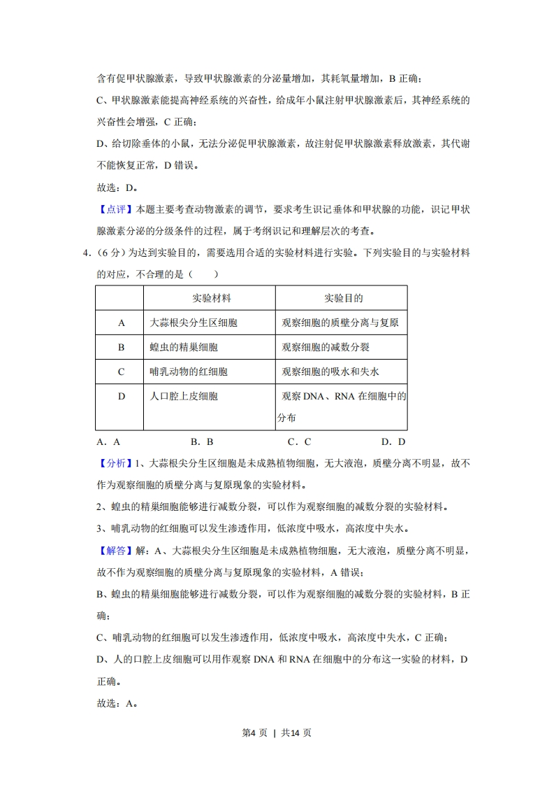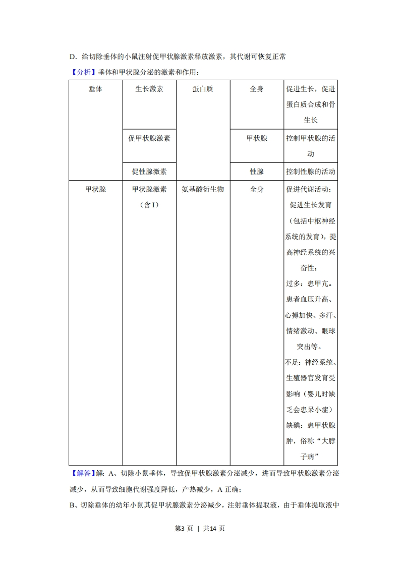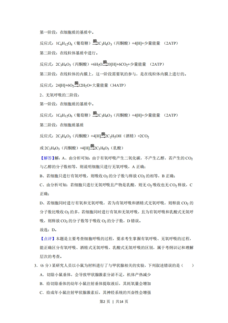 2020年全国统一高考生物试卷(新课标I)◆考答案与试题解析一、选择题:本题共6小题,年小题6分,共36分。在每小题给出的四个选项中,只有一项是符合题目要求的。1.(6分)新冠肺炎疫情警示人们要养成良好的生活习惯,提高公共卫生安全意识。下列相关叙述错误的是()A.戴口罩可以减少病原微生物通过飞沫在人与人之间的传播B.病毒能够在餐具上增殖,用食盐溶液浸泡餐具可以阻止病毒增殖C.高温可破病原体蛋白质的空间结构,煮沸处理餐具可杀死病原体D.生活中接触的物体表面可能存在病原微生物,勤洗手可降低感染风险【分析】病毒之所以属于生物,因为它能繁殖,具有生命的特征,无细胞结构,由蛋白质和核酸构成,只能寄生在活细胞中生存。【解答】解:A、戴口罩可以减少病原微生物通过飞沫在人与人之间的传播,A正确:B、病毒无细胞结构,只能寄生于活细胞才能生存,不能在餐具上增殖,B错误:C、蛋白质在高温下容易变性,使得蛋白质的空间结构受到破坏,煮沸处理餐具可杀死病原体,C正确:D、生活中接触的物体表面可能存在病原微生物,勤洗手可将病原微生物冲走,降低感染风险,D正确。故选:B。【点评】本题以新冠病毒为背景,主要考查病毒的生存、传染及防治的相关知识,要求考生识记病毒的生活史,掌握蛋白质变性的因素,属于考纲识记和理解层次的考查。2.(6分)种子贮藏中需要控制呼吸作用以减少有机物的消耗。若作物种子呼吸作用所利用的物质是淀粉分解产生的葡萄糖,下列关于种子呼吸作用的叙述,错误的是()A.若产生的CO2与乙醇的分子数相等,则细胞只进行无氧呼吸B.若细胞只进行有氧呼吸,则吸收O2的分子数与释放C02的相等C.若细胞只进行无氧呼吸且产物是乳酸,则无O2吸收也无CO2释放D.若细胞同时进行有氧和无氧呼吸,则吸收O2的分子数比释放CO2的多【分析】1、有氧呼吸的三阶段的场所:第1页|共14页第一阶段:在细胞质的基质中。反应式:1C,H1206(葡萄糖)蘭2C,H,03(丙酮酸)+4凹+少量能量(2ATP)第二阶段:在线粒体基质中进行。反应式:2CH403(丙酮酸)+6H,0酶0田+6C02+少量能量(2ATP)第三阶段:在线粒体的内膜上,这一阶段需要氧的参与,是在线粒体内膜上进行的。反应式:24叫+602酶12H20+大量能量(34ATP)2、无氧呼吸的二阶段:第一阶段:在细胞质的基质中。反应式:1C6H1206(葡萄糖)酶2C3H403(丙酮酸)+4凹+少量能量(2ATP)第二阶段:在细胞质基质反应式:2C,H,03(丙酮酸)+4田酶2C2H,0H(酒精)+2C02或2C3H403(丙酮酸)+4H萌2C3H603(乳酸)【解答】解:A、由分析可知:由于有氧呼吸产生二氧化碳,不产生乙醇,若产生的CO2与乙醇的分子数相等,则说明细胞只进行无氧呼吸,A正确:B、若细胞只进行有氧呼吸,则吸收O2的分子数与释放CO2的相等,B正确:C、由分析可知:若细胞只进行无氧呼吸且产物是乳酸,则无O2吸收也无CO2释放,C正确:D、若细胞同时进行有氧和无氧呼吸,若为有氧呼吸和酒精式无氧呼吸,则释放CO2的分子数比吸收O2的多,若细胞同时进行有氧和无氧呼吸,且为有氧呼吸和乳酸式无氧呼吸,则释放CO2的分子数等于吸收O2的分子数,D错误。故选:D。【点评】本题是主要考查细胞呼吸的过程,要求考生掌握有氧呼吸、无氧呼吸的过程,能正确区分有氧呼吸、酒精式无氧呼吸、乳酸式无氧呼吸的区别,属于考纲识记和理解层次的考查。3.(6分)某研究人员以小鼠为材料进行了与甲状腺相关的实验,下列叙述错误的是()A.切除小鼠垂体,会导致甲状腺激素分泌不足,机体产热减少B.给切除垂体的幼年小鼠注射垂体提取液后,其耗氧量会增加C.给成年小鼠注射甲状腺激素后,其神经系统的兴奋性会增强第2页|共14页D.给切除垂体的小鼠注射促甲状腺激素释放激素,其代谢可恢复正常【分析】垂体和甲状腺分泌的激素和作用:垂体生长激素蛋白质全身促进生长,促进蛋白质合成和骨生长促甲状腺激素甲状腺控制甲状腺的活动促性腺激素性腺控制性腺的活动甲状腺甲状腺激素氨基酸衍生物全身促进代谢活动:(含I)促进生长发育(包括中枢神经系统的发育),提高神经系统的兴奋性:过多:患甲亢。患者血压升高、心搏加快、多汗、情绪激动、眼球突出等。不足:神经系统、生殖器官发育受影响(婴儿时缺乏会患呆小症)缺碘:患甲状腺肿,俗称“大脖子病”【解答】解A、切除小鼠垂体,导致促甲状腺激素分泌减少,进而导致甲状腺激素分泌减少,从而导致细胞代谢强度降低,产热减少,A正确:B、切除垂体的幼年小鼠其促甲状腺激素分泌减少,注射垂体提取液,由于垂体提取液中第3页|共14页