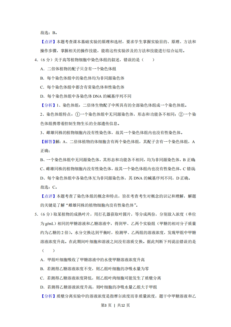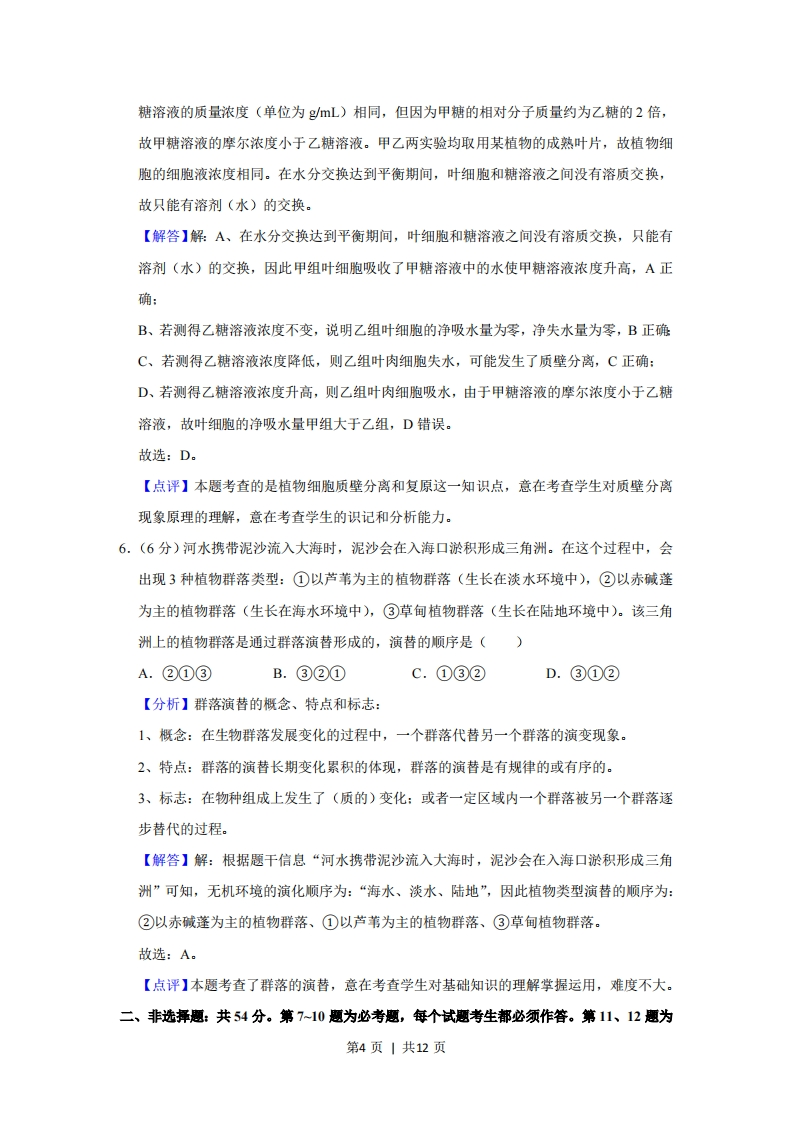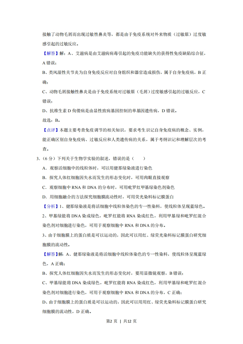 2020年全国统一高考生物试卷(新课标Ⅱ)◆考答案与试题解析一、选择题:本题共6小题,年小题6分,共36分。在每小题给出的四个选项中,只有一项是符合题目要求的。1.(6分)新冠病毒(SARS-CoV-2)和肺炎双球菌均可引发肺炎,但二者的结构不同,新冠病毒是一种含有单链RNA的病毒。下列相关叙述正确的是()A,新冠病毒进入宿主细胞的跨膜运输方式属于被动运输B.新冠病毒与肺炎双球菌均可利用自身的核糖体进行蛋白质合成C.新冠病毒与肺炎双球菌二者遗传物质所含有的核苷酸是相同的D.新冠病毒或肺炎双球菌的某些蛋白质可作为抗原引起机体免疫反应【分析】1、新冠病毒进入宿主细胞的方式是胞吞,需要消耗能量。2、新冠病毒无核糖体,只能利用宿主细胞的核糖体进行蛋白质合成。3、新冠病毒的遗传物质是RNA,肺炎双球菌的遗传物质是DNA。【解答】A、新冠病毒进入宿主细胞的方式是胞吞,A错误:B、新冠病毒无核糖体,只能利用宿主细胞的核糖体进行蛋白质合成,B错误:C、新冠病毒的遗传物质是RNA,肺炎双球菌的遗传物质是DNA,两者含有的核苷酸不相同的,C错误:D、新冠病毒或肺炎双球菌的某些蛋白质可作为抗原引起机体免疫反应,D正确。故选:D。【点评】本题考查原核生物、病毒的相关知识,要求考生识记原核细胞和病毒的结构,再结合所学的知识准确答题。2.(6分)当人体的免疫系统将自身物质当作外来异物进行攻击时,可引起自身免疫病。下列属于自身免疫病的是()A.艾滋病B.类风湿性关节炎C.动物毛屑接触性鼻炎D.抗维生素D佝偻病【分析】1、自身免疫病:由于免疫系统异常敏感、反应过度,“敌我不分”地将自身物质当作外来异物进行攻击而引起一类疾病。2、过敏反应日常生活中,有些人接触某些花粉而引起皮肤荨麻疹,或吃了海鲜而呕吐、第1页|共12页接触了动物毛屑而出现过敏性鼻炎等,都是由于免疫系统对外来物质(过敏原)过度敏感引起的过敏反应。【解答】解:A、艾滋病是由艾滋病病毒引起的免疫功能缺失的获得性免疫缺陷综合征,A错误:B、类风湿性关节炎为自身免疫反应对自身组织和器官造成损伤,属于自身免疫病,B正确:C、动物毛屑接触性鼻炎是由于免疫系统对过敏原(毛屑)过度敏感引起的过敏反应,C错误:D、抗维生素D佝偻病是由显性致病基因控制的单基因遗传病,D错误。故选:B。【点评】本题主要考查免疫调节的相关知识,要求考生识记自身免疫病的概念、实例,能正确区别自身免疫病、过敏反应和人类遗传病的关系,属于考纲识记和理解层次的考查。3.(6分)下列关于生物学实验的叙述,错误的是()A.观察活细胞中的线粒体时,可以用健那绿染液进行染色B.探究人体红细胞因失水而发生的形态变化时,可用肉眼直接观察C.观察细胞中RNA和DNA的分布时,可用吡罗红甲基绿染色剂染色D.用细胞融合的方法探究细胞膜流动性时,可用荧光染料标记膜蛋白【分析】1、健那绿染液是将活细胞中线粒体染色的专一性染料,使线粒体呈现蓝绿色。2、甲基绿能将DNA染成绿色,吡罗红能将RNA染成红色,利用甲基绿和吡罗红混合染色剂对细胞进行染色,可用于观察细胞中RNA和DNA的分布。3、由于细胞膜上的蛋白质是可以运动的,因此可以用红、绿荧光染料标记膜蛋白研究细胞膜的流动性。【解答】解:A、健那绿染液是将活细胞中线粒体染色的专一性染料,使线粒体呈现蓝绿色,A正确:B、探究人体红细胞因失水而发生的形态变化时,要用显微镜观察,B错误:C、甲基绿能将DNA染成绿色,吡罗红能将RNA染成红色,利用甲基绿和吡罗红混合染色剂对细胞进行染色,可用于观察细胞中RNA和DNA的分布,C正确:D、由于细胞膜上的蛋白质是可以运动的,因此可以用用红、绿荧光染料标记膜蛋白研究细胞膜的流动性,D正确。第2页|共12页故选:B。【点评】本题考查课本基础实验的原理和选材,要求学生掌握实验目的、原理、方法和操作步骤,掌握相关的操作技能,能将这些实验涉及的方法和技能进行综合运用。4.(6分)关于高等植物细胞中染色体组的叙述,错误的是()A.二倍体植物的配子只含有一个染色体组B.每个染色体组中的染色体均为非同源染色体C.每个染色体组中都含有常染色体和性染色体D.每个染色体组中各染色体DNA的碱基序列不同【分析】1、染色体组:二倍体生物配子中所具有的全部染色体组成一个染色体组。2、染色体组特点:①一个染色体组中无同源染色体,形态和功能各不相同:②一个染色体组携带着控制生物生长的全部遗传信息。3、雌雄同株的植物细胞内没有性染色体,故其一个染色体组内也没有性染色体。【解答】解:A、二倍体植物的体细胞含有两个染色体组,其配子含有一个染色体组,A正确:B、一个染色体组中无同源染色体,其形态和功能各不相同,均为非同源染色体,B正确C、雌雄同株的植物细胞内没有性染色体,故其一个染色体组内也没有性染色体,C错误D、每个染色体组中各染色体互为非同源染色体,其DNA的碱基序列不同,D正确。故选:C。【点评】本题考查了染色体组的概念和特点,旨在考查考生对概念的识记和理解,解题的关键是了解“雌雄同株的植物细胞内没有性染色体”。5.(6分)取某植物的成熟叶片,用打孔器获取叶圆片,等分成两份,分别放入浓度(单位为gmL)相同的甲糖溶液和乙糖溶液中,得到甲、乙两个实验组(甲糖的相对分子质量约为乙糖的2倍)。水分交换达到平衡时,