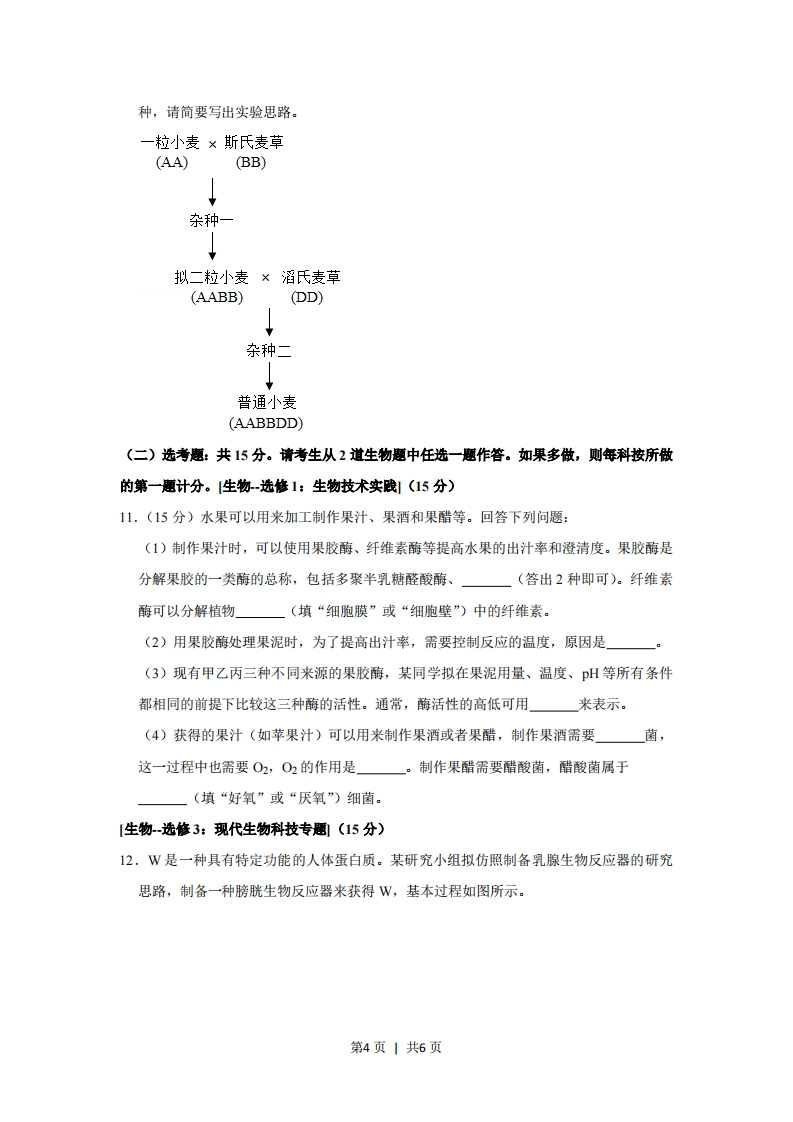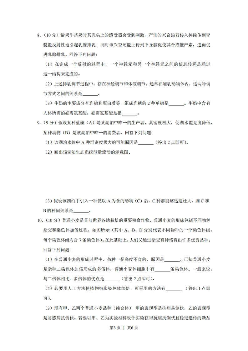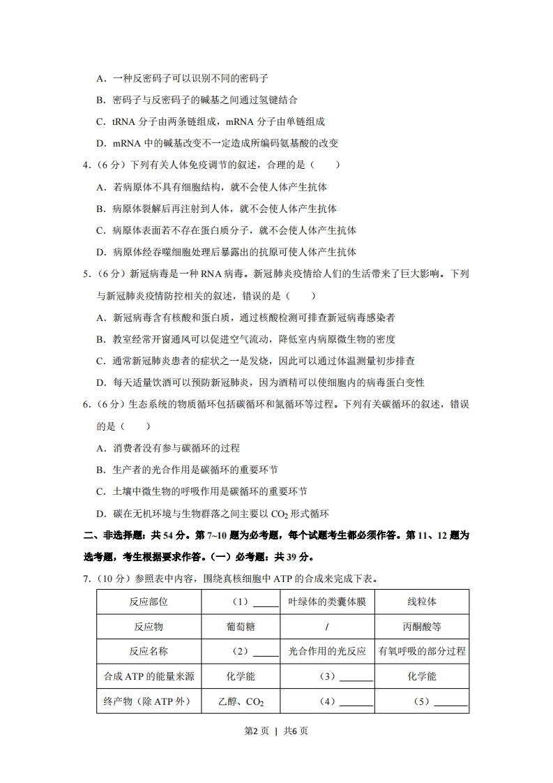 2020年全国统一高考生物试卷(新课标Ⅲ)一、选择题:本题共6小题,每小题6分,共36分。在每小题给出的四个选项中,只有一项是符合题目要求的。1.(6分)关于真核生物的遗传信息及其传递的叙述,错误的是()A.遗传信息可以从DNA流向RNA,也可以从RNA流向蛋白质B.细胞中以DNA的一条单链为模板转录出的RNA均可编码多肽C.细胞中DNA分子的碱基总数与所有基因的碱基数之和不相等D.染色体DNA分子中的一条单链可以转录出不同的RNA分子2.(6分)取燕麦胚芽鞘切段,随机分成三组,第1组置于一定浓度的蔗糖(SuC)溶液中(蔗糖能进入胚芽鞘细胞),第2组置于适宜浓度的生长素(IAA)溶液中,第3组置于IAA+SuC溶液中,一定时间内测定胚芽鞘长度的变化,结果如图所示。用KCI代替蔗糖进行上述实验可以得到相同的结果。下列说法不合理的是()生长素+蔗糖闭母生长素蔗糖图0时间hA.KC可进入胚芽鞘细胞中调节细胞的渗透压B.胚芽鞘伸长生长过程中,伴随细胞对水分的吸收C.本实验中Suc是作为能源物质来提高IAA作用效果的D.IAA促进胚芽鞘伸长的效果可因加入Suc或KCI而提高3.(6分)细胞内有些tRNA分子的反密码子中含有稀有碱基次黄嘌吟(I)。含有I的反密码子在与mRNA中的密码子互补配对时,存在如图所示的配对方式(Gy表示甘氨酸).下列说法错误的是(CCICCI-G-G-U-G-G-C-GmRNAmRNAmRNA第1页1共6页A.一种反密码子可以识别不同的密码子B.密码子与反密码子的碱基之间通过氢键结合C.tRNA分子由两条链组成,mRNA分子由单链组成D.mRNA中的碱基改变不一定造成所编码氨基酸的改变4.(6分)下列有关人体免疫调节的叙述,合理的是()A.若病原体不具有细胞结构,就不会使人体产生抗体B.病原体裂解后再注射到人体,就不会使人体产生抗体C.病原体表面若不存在蛋白质分子,就不会使人体产生抗体D.病原体经吞噬细胞处理后暴露出的抗原可使人体产生抗体5.(6分)新冠病毒是一种RNA病毒。新冠肺炎疫情给人们的生活带来了巨大影响。下列与新冠肺炎疫情防控相关的叙述,错误的是()A.新冠病毒含有核酸和蛋白质,通过核酸检测可排查新冠病毒感染者B.教室经常开窗通风可以促进空气流动,降低室内病原微生物的密度C.通常新冠肺炎患者的症状之一是发烧,因此可以通过体温测量初步排查D.每天适量饮酒可以预防新冠肺炎,因为酒精可以使细胞内的病毒蛋白变性6.(6分)生态系统的物质循环包括碳循环和氮循环等过程。下列有关碳循环的叙述,错误的是()A.消费者没有参与碳循环的过程B.生产者的光合作用是碳循环的重要环节C.土壤中微生物的呼吸作用是碳循环的重要环节D.碳在无机环境与生物群落之间主要以CO2形式循环二、非选择题:共54分。第7~10题为必考题,每个试题考生都必须作答。第11、12题为选考题,考生根据要求作答。(一)必考题:共39分。7.(10分)参照表中内容,围绕真核细胞中ATP的合成来完成下表。反应部位(1)叶绿体的类囊体膜线粒体反应物葡萄糖丙酮酸等反应名称(2)光合作用的光反应有氧呼吸的部分过程合成ATP的能量米源化学能(3)化学能终产物(除ATP外)乙醇、C02(4)(5)第2页1共6页8.(10分)给奶牛挤奶时其乳头上的感受器会受到刺激,产生的兴奋沿着传入神经传到脊髓能反射性地引起乳腺排乳:同时该兴奋还能上传到下丘脑促使其合成催产素,进而促进乳腺排乳。回答下列问题:(1)在完成一个反射的过程中,一个神经元和另一个神经元之间的信息传递是通过这一结构来完成的。(2)上述排乳调节过程中,存在神经调节和体液调节。通常在哺乳动物体内,这两种调节方式之间的关系是(3)牛奶的主要成分有乳糖和蛋白质等,组成乳糖的2种单糖是。牛奶中含有人体所需的必需氨基酸,必需氨基酸是指9.(9分)假设某种蓝藻(A)是某湖泊中唯一的生产者,其密度极大,使湖水能见度降低。某种动物(B)是该湖泊中唯一的消费者。回答下列问题:(1)该湖泊水体中A种群密度极大的可能原因是(答出2点即可)。(2)画出该湖泊生态系统能量流动的示意图。(3)假设该湖泊中引入一种仅以A为食的动物(C)后,C种群能够迅速壮大,则C和B的种间关系是10.(10分)普通小麦是目前世界各地栽培的重要粮食作物。普通小麦的形成包括不同物种杂交和染色体加倍过程,如图所示(其中A、B、D分别代表不同物种的一个染色体组,每个染色体组均含7条染色体)。在此基础上,人们又通过杂交育种培育出许多优良品种。回答下列问题:(1)在普通小麦的形成过程中,杂种一是高度不育的,原因是。己知普通小麦是杂种二染色体加倍形成的多倍体,普通小麦体细胞中有条染色体。一般来说,与二倍体相比,多倍体的优点是(答出2点即可)。(2)若要用人工方法使植物细胞染色体加倍,可采用的方法有(答出1点即可)。(3)现有甲、乙两个普通小麦品种(纯合体),甲的表现型是抗病易倒伏,乙的表现型是易感病抗倒伏。若要以甲、乙为实验材料设计实验获得抗病抗倒伏且稳定遗传的新品第3页1共6页