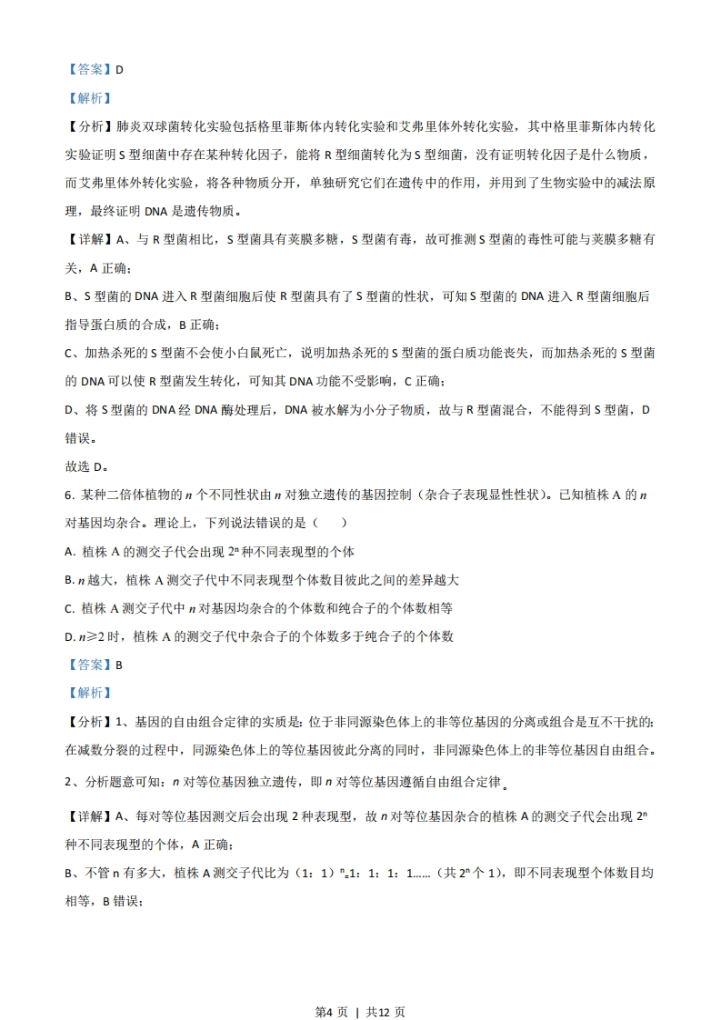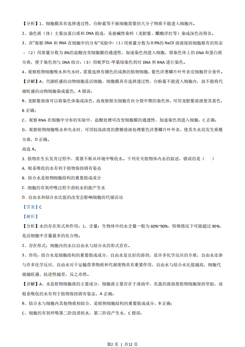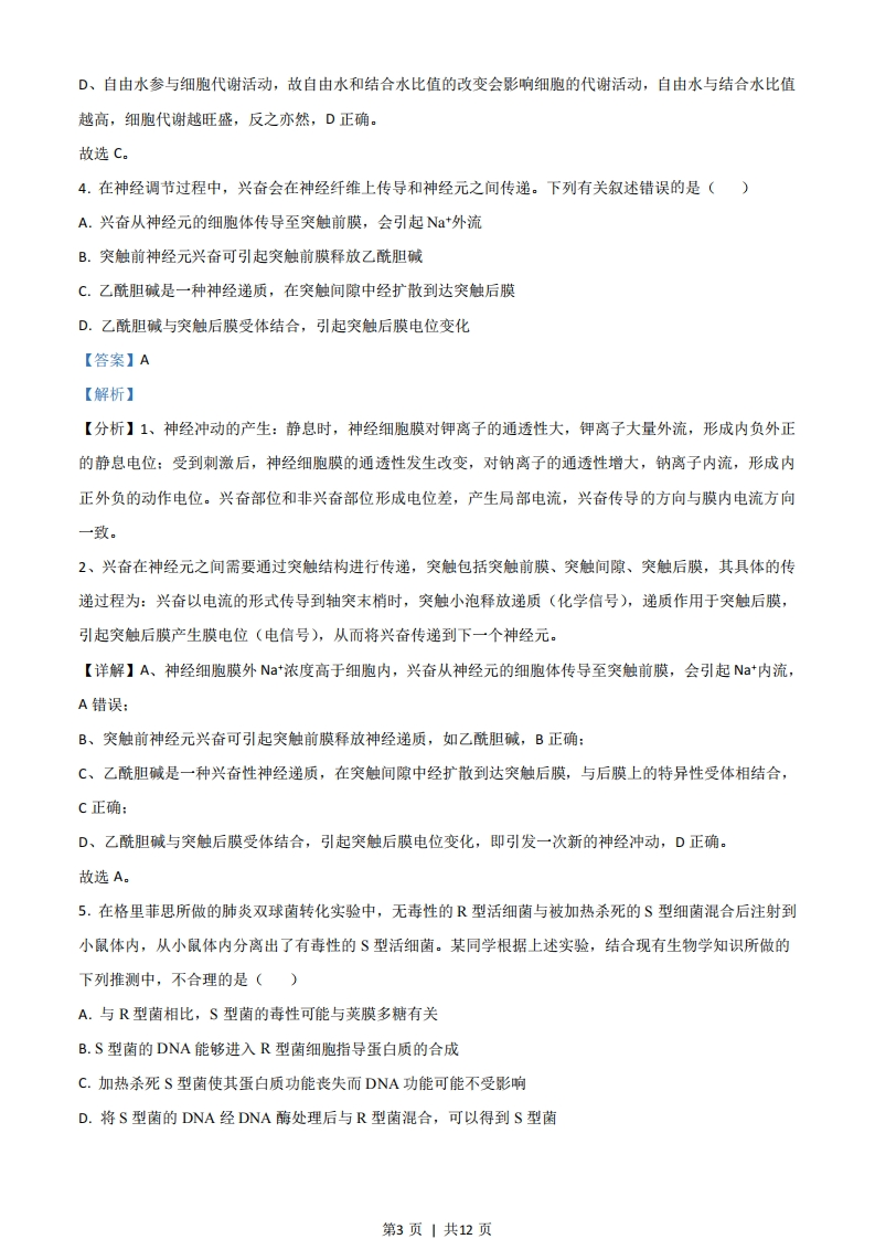 2021年高考全国乙卷理综生物试卷1.果蝇体细胞含有8条染色体。下列关于果蝇体细胞有丝分裂的叙述,错误的是()A.在间期,DNA进行半保留复制,形成I6个DNA分子B.在前期,每条染色体由2条染色单体组成,含2个DNA分子C.在中期,8条染色体的着丝点排列在赤道板上,易于观察染色体D.在后期,成对的同源染色体分开,细胞中有16条染色体【答案】D【解析】【分析】1、有丝分裂过程:(1)间期:进行DNA的复制和有关蛋白质的合成:(2)前期:核膜、核仁逐渐解体消失,出现纺锤体和染色体:(3)中期:染色体形态固定、数目清晰,着丝点排列在赤道板上:(4)后期:着丝点分裂,姐妹染色单体分开成为染色体,并均匀地移向两极:(5)末期:核膜、核仁重建、纺锤体和染色体消失。2、染色体、染色单体、DNA变化特点(体细胞染色体为2N):(1)染色体数目变化:后期加倍(4N),平时不变(2N):(2)核DNA含量变化:间期加倍(2N→4N),末期还原(2N):(3)染色单体数目变化:间期出现(0→4N),前期出现(4N),后期消失(4N→0),存在时数目同DNA。【详解】A、己知果蝇体细胞含有8条染色体,每条染色体上有1个DNA分子,共8个DNA分子,在间期,DNA进行半保留复制,形成16个DNA分子,A正确:B、间期染色体己经复制,故在前期每条染色体由2条染色单体组成,含2个DNA分子,B正确:C、在中期,8条染色体的着丝点排列在赤道板上,此时染色体形态固定、数目清晰,易于观察染色体,C正确:D、有丝分裂后期,着丝点分裂,姐妹染色单体分开,染色体数目加倍,由8条变成16条,同源染色体不分离,D错误。故选D。2.选择合适的试剂有助于达到实验目的。下列关于生物学实验所用试剂的叙述,错误的是()A.鉴别细胞的死活时,台盼蓝能将代谢旺盛的动物细胞染成蓝色B.观察根尖细胞有丝分裂中期的染色体,可用龙胆紫溶液使其着色C.观察RNA在细胞中分布的实验中,盐酸处理可改变细胞膜的通透性D.观察植物细胞吸水和失水时,可用蔗糖溶液处理紫色洋葱鳞片叶外表皮【答案】A【解析】第1页|共12页【分析】1、细胞膜具有选择透过性,台盼蓝等不被细胞需要的大分子物质不能进入细胞内。2、染色质(体)主要由蛋白质和DNA组成,易被碱性染料(龙胆紫、醋酸洋红等)染成深色而得名。3、在“观察DNA和RNA在细胞中的分布”实验中:(1)用质量分数为O.9%的NaC溶液保持细胞原有的形态:(2)用质量分数为8%的盐酸改变细胞膜的通透性,加速染色剂进入细胞,将染色体上的DNA和蛋白质分离,便于染色剂与DNA结合:(3)用吡罗红-甲基绿染色剂对DNA和RNA进行染色。4、观察植物细胞吸水和失水时,需要选择有颜色的成熟的植物细胞,紫色洋葱鳞片叶外表皮细胞符合条件。【详解】A、代谢旺盛的动物细胞是活细胞,细胞膜具有选择透过性,台盼蓝不能进入细胞内,故不能将代谢旺盛的动物细胞染成蓝色,A错误:B、龙胆紫溶液可以将染色体染成深色,故观察根尖细胞有丝分裂中期的染色体,可用龙胆紫溶液使其着色,B正确:C、观察RNA在细胞中分布的实验中,盐酸处理可改变细胞膜的通透性,加速染色剂进入细胞,C正确:D、观察植物细胞吸水和失水时,可用较高浓度的蔗糖溶液处理紫色洋葱鳞片叶外表,使其失水而发生质壁分离,D正确。故选A。3.植物在生长发育过程中,需要不断从环境中吸收水。下列有关植物体内水的叙述,错误的是()A.根系吸收的水有利于植物保持固有姿态B.结合水是植物细胞结构的重要组成成分C.细胞的有氧呼吸过程不消耗水但能产生水D.自由水和结合水比值的改变会影响细胞的代谢活动【答案】C【解析】【分析】水的存在形式和作用:1、含量:生物体中的水含量一般为60%90%,特殊情况下可能超过90%,是活细胞中含量最多的化合物。2、存在形式:细胞内的水以自由水与结合水的形式存在。3、作用:结合水是细胞结构的重要组成成分,自由水是良好的溶剂,是许多化学反应的介质,自由水还参与许多化学反应,自由水对于运输营养物质和代谢废物具有重要作用,自由水与结合水比值越高,细胞代谢越旺盛,抗逆性越差,反之亦然。【详解】A、水是植物细胞液的主要成分,细胞液主要存在于液泡中,充盈的液泡使植物细胞保持坚挺,故根系吸收的水有利于植物保持固有姿态,A正确:B、结合水与细胞内其他物质相结合,是植物细胞结构的重要组成成分,B正确:C、细胞的有氧呼吸第二阶段消耗水,第三阶段产生水,C错误:第2页|共12页D、自由水参与细胞代谢活动,故自由水和结合水比值的改变会影响细胞的代谢活动,自由水与结合水比值越高,细胞代谢越旺盛,反之亦然,D正确。故选C。4.在神经调节过程中,兴奋会在神经纤维上传导和神经元之间传递。下列有关叙述错误的是()A.兴奋从神经元的细胞体传导至突触前膜,会引起Na+外流B.突触前神经元兴奋可引起突触前膜释放乙酰胆碱C.乙酰胆碱是一种神经递质,在突触间隙中经扩散到达突触后膜D.乙酰胆碱与突触后膜受体结合,引起突触后膜电位变化【答案】A【解析】【分析】1、神经冲动的产生:静息时,神经细胞膜对钾离子的通透性大,钾离子大量外流,形成内负外正的静息电位:受到刺激后,神经细胞膜的通透性发生改变,对钠离子的通透性增大,钠离子内流,形成内正外负的动作电位。兴奋部位和非兴奋部位形成电位差,产生局部电流,兴奋传导的方向与膜内电流方向一致。2、兴奋在神经元之间需要通过突触结构进行传递,突触包括突触前膜、突触间隙、突触后膜,其具