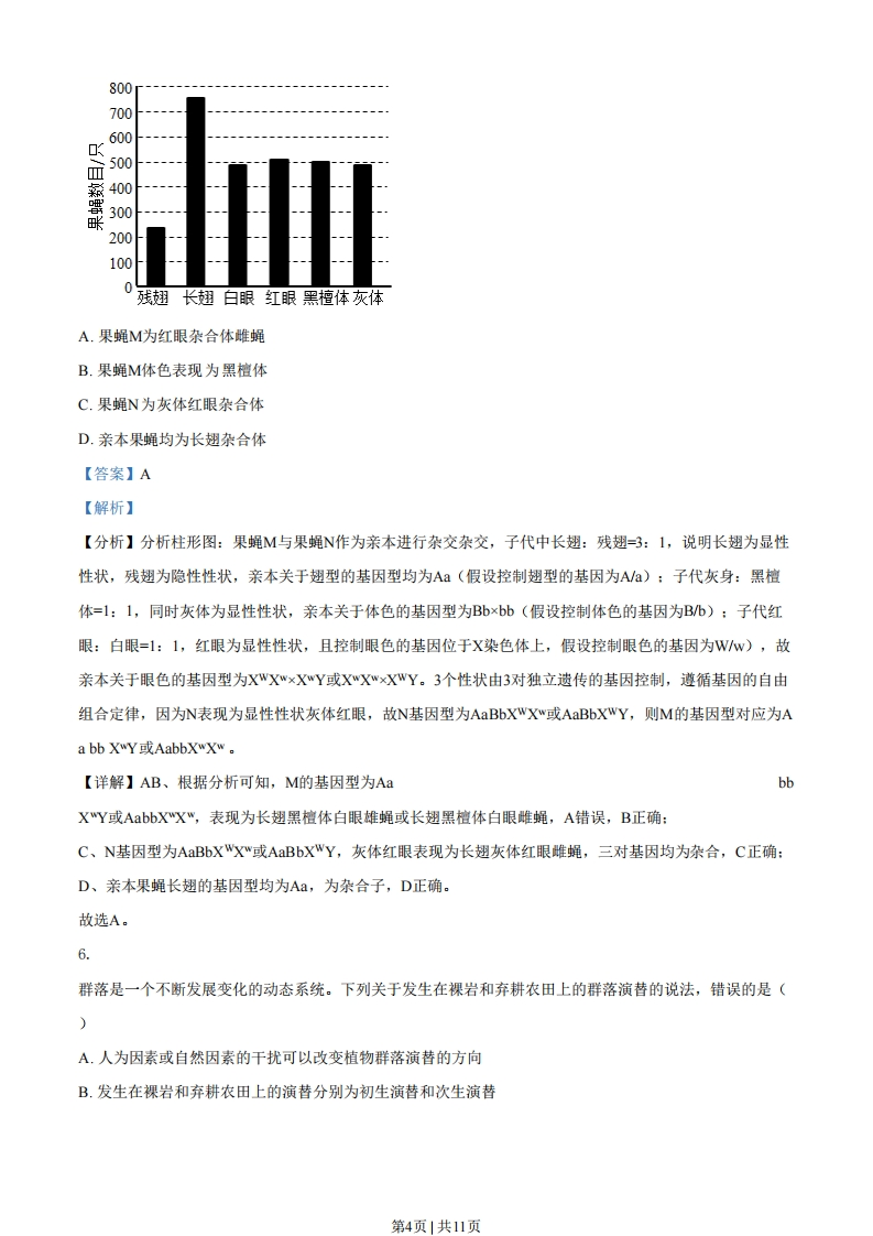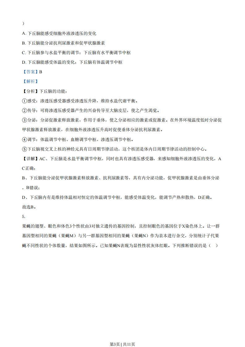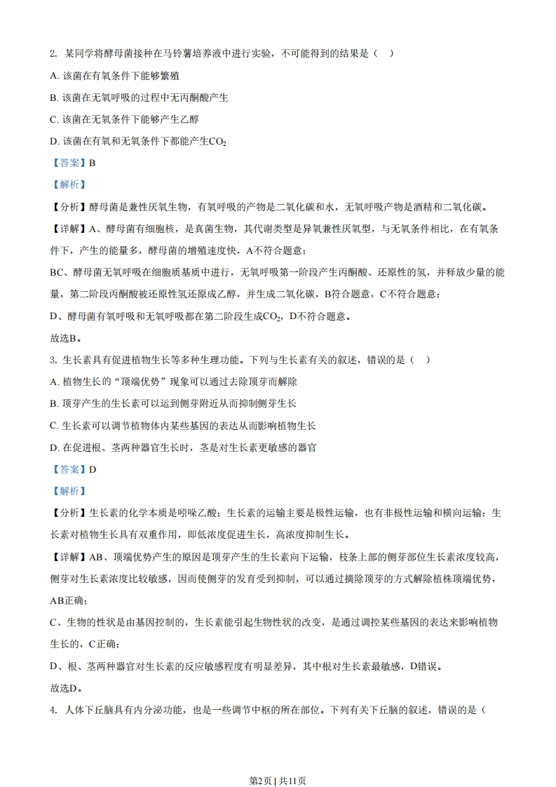 2021年普通高等学校招生全国统一考试理科综合能力测试·生物部分注意事项:1.答卷前,考生务必将自己的姓名、准考证号填写在答题卡上。2.回答选择题时,选出每小题答案后,用铅笔把答题卡上对应题目的答案标号涂黑。如需改动,用橡皮擦干净后,再选涂其他答案标号。回答非选择题时,将答案写在答题卡上。写在本试卷上无效。3.考试结束后,将本试卷和答题卡一并交回。可能用到的相对原子质量:H1C12N14016S32Cu64Zr91一、选释题:本题共13小题,每小题6分,共78分。在每小题给出的四个选项中,只有一项是符合题目要求的。1.己知①酶、②抗体、③激素、④糖原、⑤脂肪、⑥核酸都是人体内有重要作用的物质。下列说法正确的是()A.①②③都是由氨基酸通过肽键连接而成的B.③④⑤都是生物大分子,都以碳链为骨架C.①②⑥都是由含氮的单体连接成的多聚体D.④⑤⑥都是人体细胞内的主要能源物质【答案】C【解析】【分析】1、酶是活细胞合成的具有催化作用的有机物,大多数酶是蛋白质,少数酶是RNA。2、核酸是一切生物的遗传物质。有细胞结构的生物含有DNA和RNA两种核酸,但其细胞核遗传物质和细胞质遗传物质都是DNA。3、动物体内激素的化学成分不完全相同,有的属于蛋白质类,有的属于脂质,有的属于氨基酸衍生物。【详解】A、酶的化学本质是蛋白质或RNA,抗体的化学本质是蛋白质,激素的化学本质是有机物,如蛋白质、氨基酸的衍生物、脂质等,只有蛋白质才是由氨基酸通过肽键连接而成的,A错误:B、糖原是生物大分子,脂肪不是生物大分子,且激素不一定是大分子物质,如甲状腺激素是含碘的氨基酸,B错误:C、酶的化学本质是蛋白质或RNA,抗体的化学成分是蛋白质,蛋白质是由氨基酸连接而成的多聚体,核酸是由核苷酸连接而成的多聚体,氨基酸和核苷酸都含有氮元素,C正确:D、人体主要的能源物质是糖类,核酸是生物的遗传物质,脂肪是机体主要的储能物质,D错误。故选C。第1页|共11页2.某同学将酵母菌接种在马铃薯培养液中进行实验,不可能得到的结果是()A.该菌在有氧条件下能够繁殖B.该菌在无氧呼吸的过程中无丙酮酸产生C.该菌在无氧条件下能够产生乙醇D.该菌在有氧和无氧条件下都能产生CO2【答案】B【解析】【分析】酵母菌是兼性厌氧生物,有氧呼吸的产物是二氧化碳和水,无氧呼吸产物是酒精和二氧化碳。【详解】A、酵母菌有细胞核,是真菌生物,其代谢类型是异氧兼性厌氧型,与无氧条件相比,在有氧条件下,产生的能量多,酵母菌的增殖速度快,A不符合题意:BC、酵母菌无氧呼吸在细胞质基质中进行,无氧呼吸第一阶段产生丙酮酸、还原性的氢,并释放少量的能量,第二阶段丙酮酸被还原性氢还原成乙醇,并生成二氧化碳,B符合题意,C不符合题意:D、酵母菌有氧呼吸和无氧呼吸都在第二阶段生成CO2,D不符合题意。故选B。3.生长素具有促进植物生长等多种生理功能。下列与生长素有关的叙述,错误的是()A.植物生长的“顶端优势”现象可以通过去除顶芽而解除B.顶芽产生的生长素可以运到侧芽附近从而抑制侧芽生长C.生长素可以调节植物体内某些基因的表达从而影响植物生长D.在促进根、茎两种器官生长时,茎是对生长素更敏感的器官【答案】D【解析】【分析】生长素的化学本质是吲哚乙酸:生长素的运输主要是极性运输,也有非极性运输和横向运输:生长素对植物生长具有双重作用,即低浓度促进生长,高浓度抑制生长。【详解】AB、顶端优势产生的原因是顶芽产生的生长素向下运输,枝条上部的侧芽部位生长素浓度较高,侧芽对生长素浓度比较敏感,因而使侧芽的发育受到抑制,可以通过摘除顶芽的方式解除植株项端优势,AB正确:C、生物的性状是由基因控制的,生长素能引起生物性状的改变,是通过调控某些基因的表达来影响植物生长的,C正确:D、根、茎两种器官对生长素的反应敏感程度有明显差异,其中根对生长素最敏感,D错误。故选D。4.人体下丘脑具有内分泌功能,也是一些调节中枢的所在部位。下列有关下丘脑的叙述,错误的是(第2页|共11页)A.下丘脑能感受细胞外液渗透压的变化B.下丘脑能分泌抗利尿激素和促甲状腺激素C.下丘脑参与水盐平衡的调节:下丘脑有水平衡调节中枢D.下丘脑能感受体温的变化:下丘脑有体温调节中枢【答案】B【解析】【分析】下丘脑的功能:①感受:渗透压感受器感受渗透压升降,维持水盐代谢平衡。②传导:可将渗透压感受器产生的兴奋传导至大脑皮层,使之产生渴觉。③分泌:分泌促激素释放激素,作用于垂体,使之分泌相应的激素或促激素。在外界环境温度低时分泌促甲状腺激素释放激素,在细胞外液渗透压升高时促使垂体分泌抗利尿激素。④调节:体温调节中枢、血糖调节中枢、渗透压调节中枢。⑤下丘脑视交叉上核的神经元具有日周期节律活动,这个核团是体内日周期节律活动的控制中心。【详解】AC、下丘脑是水盐平衡调节中枢,同时也具有渗透压感受器,来感知细胞外液渗透压的变化,AC正确:B、下丘脑能分泌促甲状腺激素释放激素、抗利尿激素等,具有内分泌功能,促甲状腺激素是由垂体分泌,B错误:D、下丘脑内有是维持体温相对恒定的体温调节中枢,能感受体温变化,能调节产热和散热,D正确。故选B。5.果蝇的翅型、眼色和体色3个性状由3对独立遗传的基因控制,且控制眼色的基因位于X染色体上。让一群基因型相同