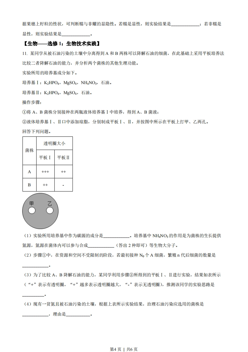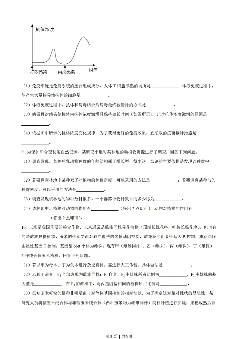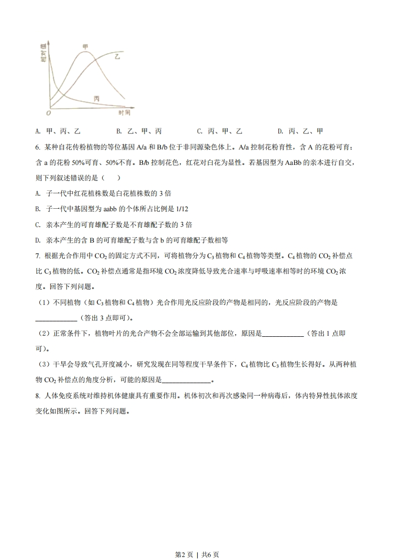 2022年普通高等学校招生全国统一考试理科综合能力测试一、选择题1.钙在骨骼生长和肌肉收缩等过程中发挥重要作用。晒太阳有助于青少年骨骼生长,预防老年人骨质疏松。下列叙述错误的是()A.细胞中有以无机离子形式存在的钙B.人体内C2+可自由通过细胞膜的磷脂双分子层C.适当补充维生素D可以促进肠道对钙的吸收D人体血液中钙离子浓度过低易出现抽搐现象2.植物成熟叶肉细胞的细胞液浓度可以不同。现将、b、c三种细胞液浓度不同的某种植物成熟叶肉细胞,分别放入三个装有相同浓度蔗糖溶液的试管中,当水分交换达到平衡时观察到:①细胞未发生变化:②细胞b体积增大:③细胞℃发生了质壁分离。若在水分交换期间细胞与蔗糖溶液没有溶质的交换,下列关于这一实验的叙述,不合理的是()A.水分交换前,细胞b的细胞液浓度大于外界蔗糖溶液的浓度B.水分交换前,细胞液浓度大小关系为细胞b>细胞>细胞cC.水分交换平衡时,细胞c的细胞液浓度大于细胞a的细胞液浓度D.水分交换平衡时,细胞©的细胞液浓度等于外界蔗糖溶液的浓度3.植物激素通常与其受体结合才能发挥生理作用。喷施某种植物激素,能使某种作物的矮生突变体长高。关于该矮生突变体矮生的原因,下列推测合理的是()A.赤霉素合成途径受阻B.赤霉素受体合成受阻C.脱落酸合成途径受阻D.脱落酸受体合成受阻4.线粒体是细胞进行有氧呼吸的主要场所。研究发现,经常运动的人肌细胞中线粒体数量通常比缺乏锻炼的人多。下列与线粒体有关的叙述,错误的是()A.有氧呼吸时细胞质基质和线粒体中都能产生ATPB.线粒体内膜上的酶可以参与田和氧反应形成水的过程C.线粒体中的丙酮酸分解成CO2和[田的过程需要O2的直接参与D.线粒体中的DNA能够通过转录和翻译控制某些蛋白质的合成5.在鱼池中投放了一批某种鱼苗,一段时间内该鱼的种群数量、个体重量和种群总重量随时间的变化趋势如图所示。若在此期间鱼没有进行繁殖,则图中表示种群数量、个体重量、种群总重量的曲线分别是()第1页」共6页为时间A.甲、丙、乙B.乙、甲、丙C.丙、甲、乙D.丙、乙、甲6.某种自花传粉植物的等位基因A/a和Bb位于非同源染色体上。A/a控制花粉育性,含A的花粉可育:含a的花粉50%可育、50%不育。Bb控制花色,红花对白花为显性。若基因型为AaBb的亲本进行自交,则下列叙述错误的是()A.子一代中红花植株数是白花植株数的3倍B.子一代中基因型为aabb的个体所占比例是1/12C.亲本产生的可育雄配子数是不育雄配子数的3倍D.亲本产生的含B的可育雄配子数与含b的可育雄配子数相等7.根据光合作用中CO2的固定方式不同,可将植物分为C3植物和C4植物等类型。C4植物的CO2补偿点比C3植物的低。CO2补偿点通常是指环境CO2浓度降低导致光合速率与呼吸速率相等时的环境CO2浓度。回答下列问题。(1)不同植物(如C3植物和C4植物)光合作用光反应阶段的产物是相同的,光反应阶段的产物是(答出3点即可)。(2)正常条件下,植物叶片的光合产物不会全部运输到其他部位,原因是(答出1点即可)。(3)干旱会导致气孔开度减小,研究发现在同等程度干旱条件下,C4植物比C3植物生长得好。从两种植物CO2补偿点的角度分析,可能的原因是」8.人体免疫系统对维持机体健康具有重要作用。机体初次和再次感染同一种病毒后,体内特异性抗体浓度变化如图所示。回答下列问题。第2页|共6页抗体浓度初次感染再次感染时间(1)免疫细胞是免疫系统的重要组成成分,人体T细胞成熟的场所是」体液免疫过程中,能产生大量特异性抗体的细胞是」(2)体液免疫过程中,抗体和病毒结合后病毒最终被清除的方式是」(3)病毒再次感染使机体内抗体浓度激增且保持较长时间(如图所示),此时抗体浓度激增的原因是(4)依据图中所示的抗体浓度变化规律,为了获得更好的免疫效果,宜采取的疫苗接种措施是9.为保护和合理利用自然资源,某研究小组对某林地的动植物资源进行了调查。回答下列问题。(1)调查发现,某种哺乳动物种群的年龄结构属于增长型,得出这一结论的主要依据是发现该种群中_o(2)若要调查林地中某种双子叶植物的种群密度,可以采用的方法是」若要调查某种鸟的种群密度,可以采用的方法是」(3)调查发现该林地的物种数目很多。一个群落中物种数目的多少称为(4)该林地中,植物对动物的作用有」(答出2点即可):动物对植物的作用有(答出2点即可)。10.玉米是我国重要的粮食作物。玉米通常是雌雄同株异花植物(顶端长雄花序,叶腋长雌花序),但也有的是雌雄异株植物。玉米的性别受两对独立遗传的等位基因控制,雌花花序由显性基因B控制,雄花花序由显性基因T控制,基因型bbt个体为雌株。现有甲(雌雄同株)、乙(雌株)、丙(雌株)、丁(雄株)4种纯合体玉米植株。回答下列问题。(1)若以甲为母本、丁为父本进行杂交育种,需进行人工传粉,具体做法是(2)乙和丁杂交,F1全部表现为雌雄同株:F1自交,F2中雌株所占比例为F2中雄株的基因型是:在F2的雌株中,与丙基因型相同的植株所占比例是(3)己知玉米籽粒的糯和非糯是由1对等位基因控制的相对性状。为了确定这对相对性状的显隐性,某研究人员将糯玉米纯合体与非糯玉米纯合体(两种玉米均为雌雄同株)间行种植进行实验,果穗成熟后依第3页」共6页