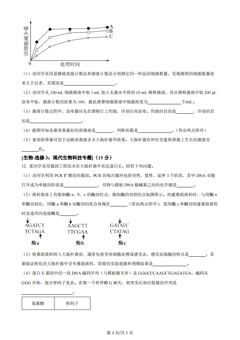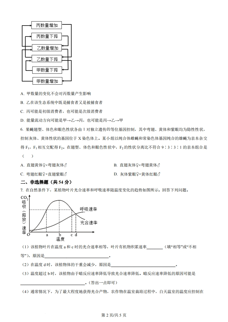 2024年高考全国甲卷生物学试题一、单选题(每小题6分,共36分)1.细胞是生物体结构和功能的基本单位。下列叙述正确的是()A.病毒通常是由蛋白质外壳和核酸构成的单细胞生物B.原核生物因为没有线粒体所以都不能进行有氧呼吸C.哺乳动物同一个体中细胞的染色体数目有可能不同D.小麦根细胞吸收离子消耗的ATP主要由叶绿体产生2.ATP可为代谢提供能量,也参与RNA的合成,ATP结构如图所示,图中~表示高能磷酸键,下列叙述错误的是()腺嘌岭核糖A.ATP转化为ADP可为离子的主动运输提供能量B.用a位32p标记的ATP可以合成带有32P的RNAC.阝和Y位磷酸基团之间的高能磷酸键不能在细胞核中断裂D.光合作用可将光能转化为化学能储存于B和¥位磷酸基团之间的高能磷酸键3.植物生长发育受植物激素的调控。下列叙述错误的是()A.赤霉素可以诱导某些酶的合成促进种子萌发B.单侧光下生长素的极性运输不需要载体蛋白C.植物激素可与特异性受体结合调节基因表达D.一种激素可通过诱导其他激素的合成发挥作用4.甲状腺激素在人体生命活动的调节中发挥重要作用。下列叙述错误的是()A.甲状腺激素受体分布于人体内几乎所有细胞B.甲状腺激素可以提高机体神经系统的兴奋性C.甲状腺激素分泌增加可使细胞代谢速率加快D.甲状腺激素分泌不足会使血中TSH含量减少5.某生态系统中捕食者与被捕食者种群数量变化的关系如图所示,图中→表示种群之间数量变化的关系,如甲数量增加导致乙数量增加。下列叙述正确的是()第1页共5页丙数量增加丙数量下降乙数量增加乙数量下降甲数量下降甲数量增加A.甲数量的变化不会对丙数量产生影响B.乙在该生态系统中既是捕食者又是被捕食者C.丙可能是初级消费者,也可能是次级消费者D.能量流动方向可能是甲→乙→丙,也可能是丙→乙→甲6.果蝇翅型、体色和眼色性状各由1对独立遗传的等位基因控制,其中弯翅、黄体和紫眼均为隐性性状,控制灰体、黄体性状的基因位于X染色体上。某小组以纯合体雌蝇和常染色体基因纯合的雄蝇为亲本杂交得F1,F1相互交配得F2。在翅型、体色和眼色性状中,F2的性状分离比不符合9:3:3:1的亲本组合是()A.直翅黄体♀×弯翅灰体dB.直翅灰体♀×弯翅黄体dC.弯翅红眼♀×直翅紫眼♂D.灰体紫眼♀×黄体红眼d二、非选释题(共54分)7.在自然条件下,某植物叶片光合速率和呼吸速率随温度变化的趋势如图所示。回答下列问题。C0,↑吸呼吸速率(释放)光合速率bcd温度(1)该植物叶片在温度a和c时的光合速率相等,叶片有机物积累速率(填“相等”或“不相等”),原因是(2)在温度d时,该植物体的干重会减少,原因是(3)温度超过时,该植物由于暗反应速率降低导致光合速率降低。暗反应速率降低的原因可能是。(答出一点即可)(4)通常情况下,为了最大程度地获得光合产物,农作物在温室栽培过程中,白天温室的温度应控制在第2页/共5页最大时的温度。8.某种病原体的蛋白质A可被吞噬细胞摄入和处理,诱导特异性免疫。回答下列问题。(1)病原体感染诱导产生浆细胞的特异性免疫方式属于(2)溶酶体中的蛋白酶可将蛋白质A的一条肽链水解成多个片段,蛋白酶切断的化学键是(3)不采用荧光素标记蛋白质A,设计实验验证蛋白质A的片段可出现在吞噬细胞的溶酶体中,简要写出实验思路和预期结果9.鸟类B曾濒临灭绝。在某地发现7只野生鸟类B后,经保护其种群规模逐步扩大。回答下列问题。(1)保护鸟类B采取“就地保护为主,易地保护为辅”模式。就地保护是(2)鸟类B经人工繁育达到一定数量后可放飞野外。为保证鸟类B正常生存繁殖,放飞前需考虑的野外生物因素有。(答出两点即可)(3)鸟类B的野生种群稳步增长。通常,种群呈“S”型增长的主要原因是(4)保护鸟类B等濒危物种的意义是10.袁隆平研究杂交水稻,对粮食生产具有突出贡献。回答下列问题。(1)用性状优良的水稻纯合体(甲)给某雄性不育水稻植株授粉,杂交子一代均表现雄性不育:杂交子一代与甲回交(回交是杂交后代与两个亲本之一再次交配),子代均表现雄性不育:连续回交获得性状优良的雄性不育品系(乙)。由此推测控制雄性不育的基因(A)位于(填“细胞质”或“细胞核”)。(2)将另一性状优良的水稻纯合体(丙)与乙杂交,F1均表现雄性可育,且长势与产量优势明显,F1即为优良的杂交水稻。丙的细胞核基因R的表达产物能够抑制基因A的表达。基因R表达过程中,以mRNA为模板翻译产生多肽链的细胞器是。F1自交子代中雄性可育株与雄性不育株的数量比为(3)以丙为父本与甲杂交(正交)得F1,F1自交得F2,则F2中与育性有关的表现型有种。反交结果与正交结果不同,反交的F2中与育性有关的基因型有种。[生物-选修1:生物技术实践!(15分)11.合理使用消毒液有助于减少传染病的传播。某同学比较了3款消毒液A、B、C杀灭细菌的效果,结果如图所示。回答下列问题。第3页/共5页