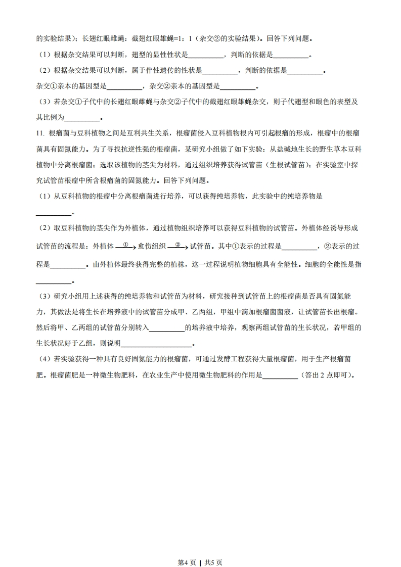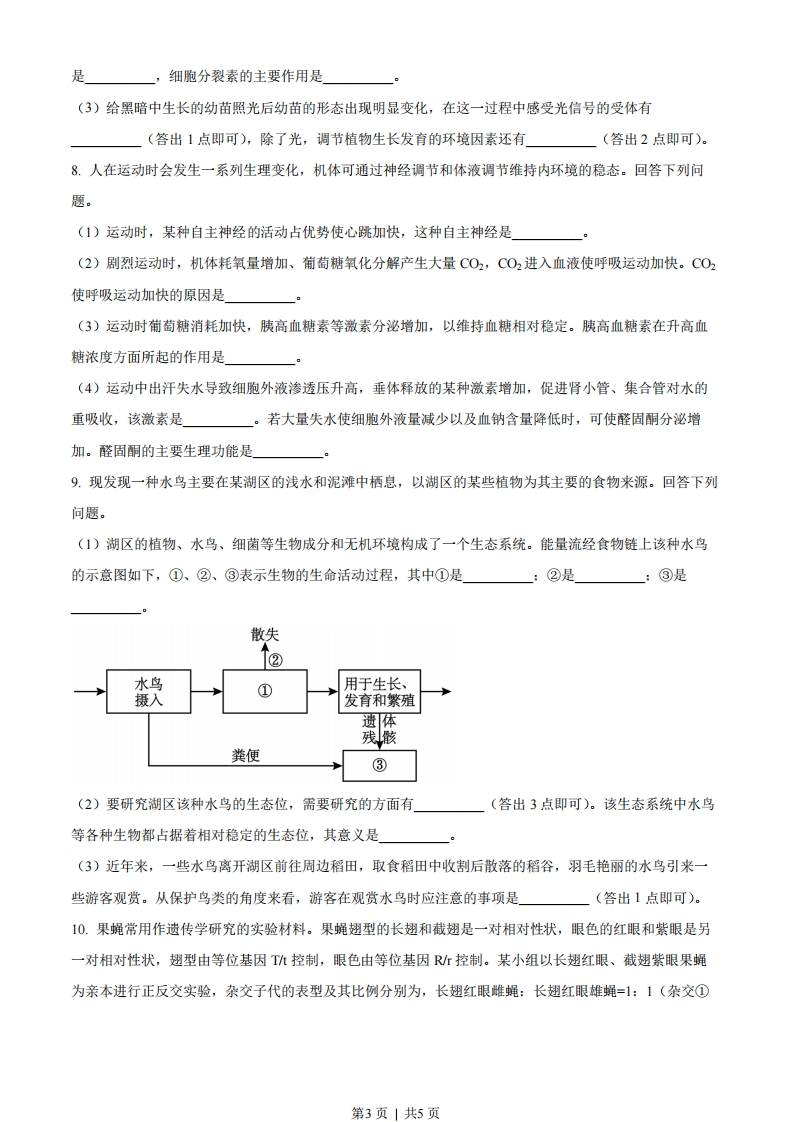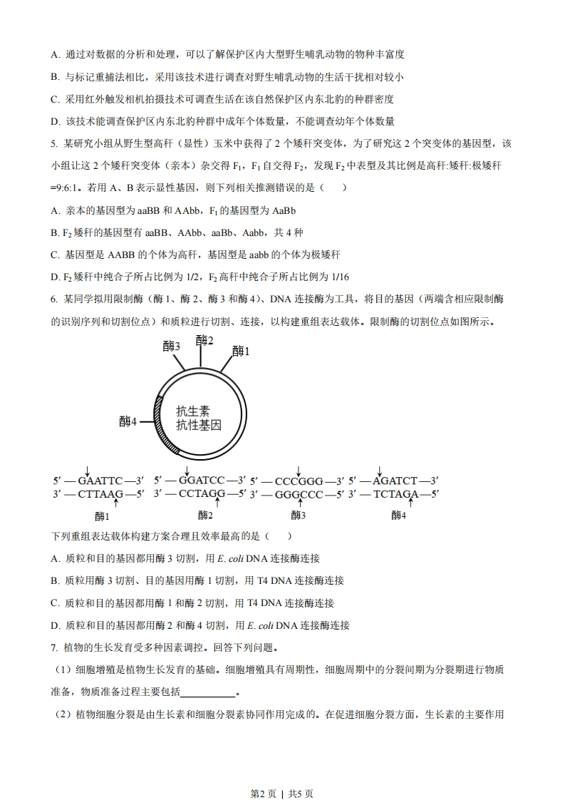 2023年普通高等学校招生全国统一考试(新课标卷)理科综合生物学科1.葡萄糖是人体所需的一种单糖。下列关于人体内葡萄糖的叙述,错误的是()A.葡萄糖是人体血浆的重要组成成分,其含量受激素的调节B.葡萄糖是机体能量的重要来源,能经自由扩散通过细胞膜C.血液中的葡萄糖进入肝细胞可被氧化分解或转化为肝糖原D.血液中的葡萄糖进入人体脂肪组织细胞可转变为甘油三酯2.我国劳动人民在漫长的历史进程中,积累了丰富的生产、生活经验,并在实践中应用。生产和生活中常采取的一些措施如下。①低温储存,即果实、蔬菜等收获后在低温条件下存放②春化处理,即对某些作物萌发的种子或幼苗进行适度低温处理③风干储藏,即小麦、玉米等种子收获后经适当风干处理后储藏④光周期处理,即在作物生长的某一时期控制每天光照和黑暗的相对时长⑤合理密植,即裁种作物时做到密度适当,行距、株距合理©间作种植,即同一生长期内,在同一块土地上隔行种植两种高矮不同的作物关于这些措施,下列说法合理的是()A.措施②④分别反映了低温和昼夜长短与作物开花的关系B.措施③⑤的主要目的是降低有机物的消耗C.措施②⑤©的主要目的是促进作物的光合作用D.措施①③④的主要目的是降低作物或种子的呼吸作用强度3.人体内的免疫细胞是体液免疫和细胞免疫过程的重要参与者。下列叙述正确的是()①免疫细胞表面的受体可识别细菌、病毒等入侵机体的病原体②树突状细胞能够处理和呈递抗原,淋巴细胞不能呈递抗原③辅助性T细胞参与体液免疫过程而不参与细胞免疫过程④体液免疫可产生记忆B细胞,细胞免疫可产生记忆T细胞⑤某些致病细菌感染人体既可引发体液免疫又可引发细胞免疫A①②④B.①④⑤C.②③⑤D.③④⑤4.为了研究和保护我国东北地区某自然保护区内的野生哺乳动物资源,研究人员采用红外触发相机自动拍摄技术获得了该保护区内某些野生哺乳动物资源的相应数据,为生态学研究提供了相关依据。下列叙述错误的是()第1页」共5页A.通过对数据的分析和处理,可以了解保护区内大型野生哺乳动物的物种丰富度B.与标记重捕法相比,采用该技术进行调查对野生哺乳动物的生活干扰相对较小C.采用红外触发相机拍摄技术可调查生活在该自然保护区内东北豹的种群密度D.该技术能调查保护区内东北豹种群中成年个体数量,不能调查幼年个体数量5.某研究小组从野生型高秆(显性)玉米中获得了2个矮秆突变体,为了研究这2个突变体的基因型,该小组让这2个矮秆突变体(亲本)杂交得F1,F1自交得F2,发现F2中表型及其比例是高秆:矮秆:极矮秆=9:6:1。若用A、B表示显性基因,则下列相关推测错误的是()A.亲本的基因型为aaBB和AAbb,F1的基因型为AaBbB.F2矮秆的基因型有aaBB、AAbb、aaBb、Aabb,共4种C.基因型是AABB的个体为高杆,基因型是aabb的个体为极矮秆D.F2矮秆中纯合子所占比例为1/2,F2高秆中纯合子所占比例为1/166.某同学拟用限制酶(酶1、酶2、酶3和酶4)、DNA连接酶为工具,将目的基因(两端含相应限制酶的识别序列和切割位点)和质粒进行切割、连接,以构建重组表达载体。限制酶的切割位点如图所示。酶3每2酶抗生素酶4一抗性基因s'-GAATTC-3'5'-GGATCC-3'5-CCCGGG-3s-AGATCT-33'-CTTAAG-5'3'-CCTAGG-5'3'-GGGCCC-5'3'-TCTAGA-5酶1酶2酶3酶4下列重组表达载体构建方案合理且效率最高的是()A.质粒和目的基因都用酶3切割,用E.coli DNA连接酶连接B.质粒用酶3切割、目的基因用酶1切割,用T4DNA连接酶连接C.质粒和目的基因都用酶1和酶2切割,用T4DNA连接酶连接D.质粒和目的基因都用酶2和酶4切割,用E.coli DNA连接酶连接7.植物的生长发育受多种因素调控。回答下列问题。(1)细胞增殖是植物生长发育的基础。细胞增殖具有周期性,细胞周期中的分裂间期为分裂期进行物质准备,物质准备过程主要包括(2)植物细胞分裂是由生长素和细胞分裂素协同作用完成的。在促进细胞分裂方面,生长素的主要作用第2页」共5页是细胞分裂素的主要作用是」(3)给黑暗中生长的幼苗照光后幼苗的形态出现明显变化,在这一过程中感受光信号的受体有(答出1点即可),除了光,调节植物生长发育的环境因素还有」(答出2点即可)。8.人在运动时会发生一系列生理变化,机体可通过神经调节和体液调节维持内环境的稳态。回答下列问题。(1)运动时,某种自主神经的活动占优势使心跳加快,这种自主神经是」(2)剧烈运动时,机体耗氧量增加、葡萄糖氧化分解产生大量CO2,CO2进入血液使呼吸运动加快。CO2使呼吸运动加快的原因是(3)运动时葡萄糖消耗加快,胰高血糖素等激素分泌增加,以维持血糖相对稳定。胰高血糖素在升高血糖浓度方面所起的作用是(4)运动中出汗失水导致细胞外液渗透压升高,垂体释放的某种激素增加,促进肾小管、集合管对水的重吸收,该激素是。若大量失水使细胞外液量减少以及血钠含量降低时,可使醛固酮分泌增加。醛固酮的主要生理功能是9.现发现一种水鸟主要在某湖区的浅水和泥滩中栖息,以湖区的某些植物为其主要的食物来源。回答下列问题。(1)湖区的植物、水鸟、细菌等生物成分和无机环境构成了一个生态系统。能量流经食物链上该种水鸟的示意图如下,①、②、③表示生物的生命活动过程,其中①是:②是:③是散失②水①用于生长、入发育和繁殖遗体残骸粪便③(2)要研究湖区该种水鸟的生态位,需要研究的方