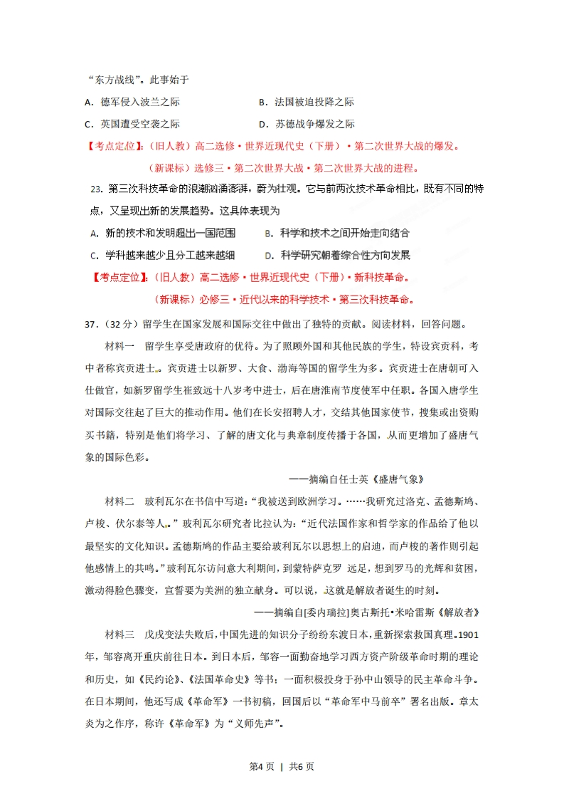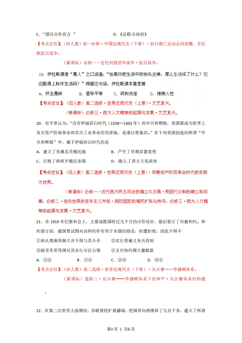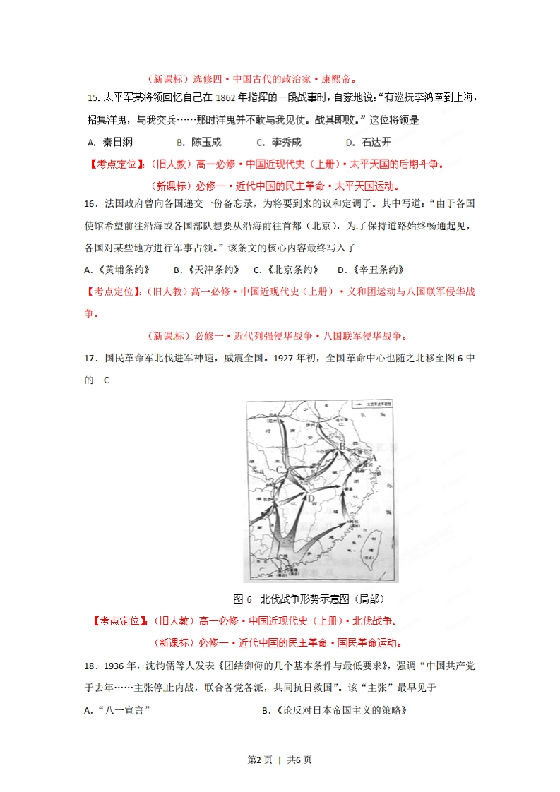 2012年高考重庆文综历史试卷解析(精析word版学生版)(答案和解析见教师版)【总评】:本套试题是旧人教版高考题(也可与新课标体系考点对应),总体难度不大,注重课本基础知识的掌握。非选择注重历史与现实的结合考查,如不同时期、不同国家的留学生的作用,中华民族的复兴等。非选择题把阅读归纳材料与联系课本基础知识结合起来考查。12.图5所示是建于河南安阳的一位中国古代妇女的塑像。在她的墓葬中出土了大量精美的好图5A.铁器B.玉器C.瓷器D.漆器【考点定位】(旧人数)高三选修·中国古代史·夏商西周的经济。(新课标)必修二·中国古代的经济结构·中国古代的手工业。13.《史记·陈涉世家》记载,陈胜在发动起义时说:“天下苦秦久矣。”其表现有①战乱频仍②民族矛盾尖锐③刑别罚严酷④土地兼并严重A.①②B.①③C.②④D.③④【考点定位】(旧人教)高三选修·中国古代史·秦朝的统一和素末农民战争。(新课标)必修一·中国古代的政治制度·走向大一统的秦汉攻治。14.史载:“今海宇承平已久,户口日繁…人丁虽增,地亩并末加广。应令直省督、抚将见(现)今钱粮册内有名丁数,勿增勿减,永为定额。”最早实施这一政策的皇帝也曾A.册封五世达赖B.平定三藩之乱C.首次征收地丁银D.接见过渥巴锡【考点定位】:(旧人教)高三选修·中国古代史·明清时期统一多民族国家的发展。第1页1共6页