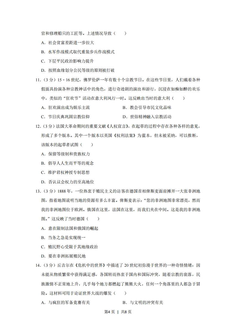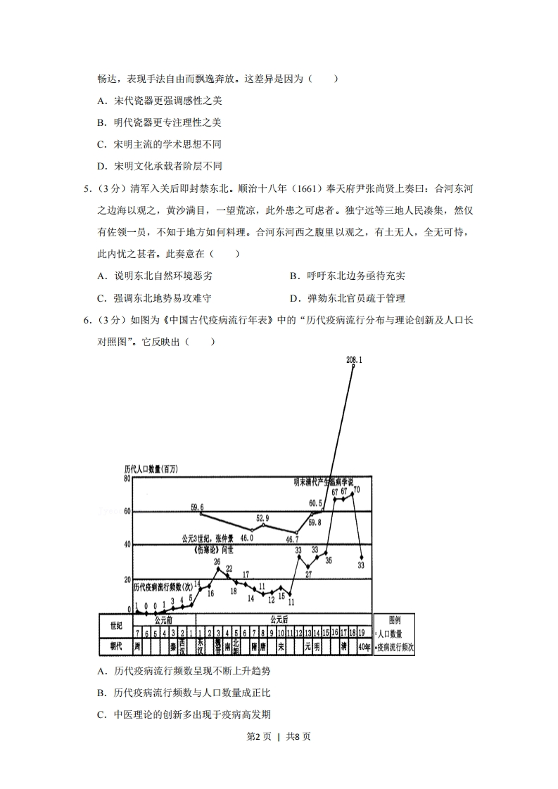 2021年重庆市高考历史试卷一、选择题:本题共15小题,每小题3分,共45分。在每小题给出的四个选项中,只有一项是符合题目要求的。1.(3分)西周、春秋时期的“家”,多为一个政治单位,与国对称,即孟子所谓“千乘之国”“百乘之家”:战国至秦汉时期,“家”成为一个社会生产、生活单位,即史书中所谓“编户”“齐民”。造成这种变化的主要原因是()A.分封制的瓦解B.法家思想的发展C.宗法制的建立D.儒家思想的影响2.(3分)如图是分别在埃及、阿富汗和中国出土的罗马搅胎玻璃瓶,有学者指出它们是罗乌工匠制作的。这可用于佐证()埃及出土的罗马搅胎大月氏王陵出土的洛阳东汉墓出土的罗马玻璃瓶(公元1世纪)罗马搅胎玻璃瓶(公元30年)搅胎玻璃瓶(公元2世纪)A.大月氏成为丝绸之路的中心B.丝绸之路促进中西文化交流C.罗马搅胎玻璃瓶技术沿丝绸之路东传D.东汉与罗马帝国建立了官方直接往来3.(3分)隋炀帝时,势倾当朝的左卫大将军、许国公宇文述占田违限,刑部尚书李园通“判字文述田以还民”。这主要反映了当时()A.农民经济负担减轻B.严刑峻法思想推行C.官员特殊权益消失D.均田制的贯彻实施4.(3分)有学者认为,明瓷中己看不到宋瓷中那种理智的、严肃的造型之追求。明瓷姿态自然,少见做作痕迹。其中的蓝釉瓷器和红釉瓷器浓墨丰润,富有情趣和装饰性,笔法第1页1共8页