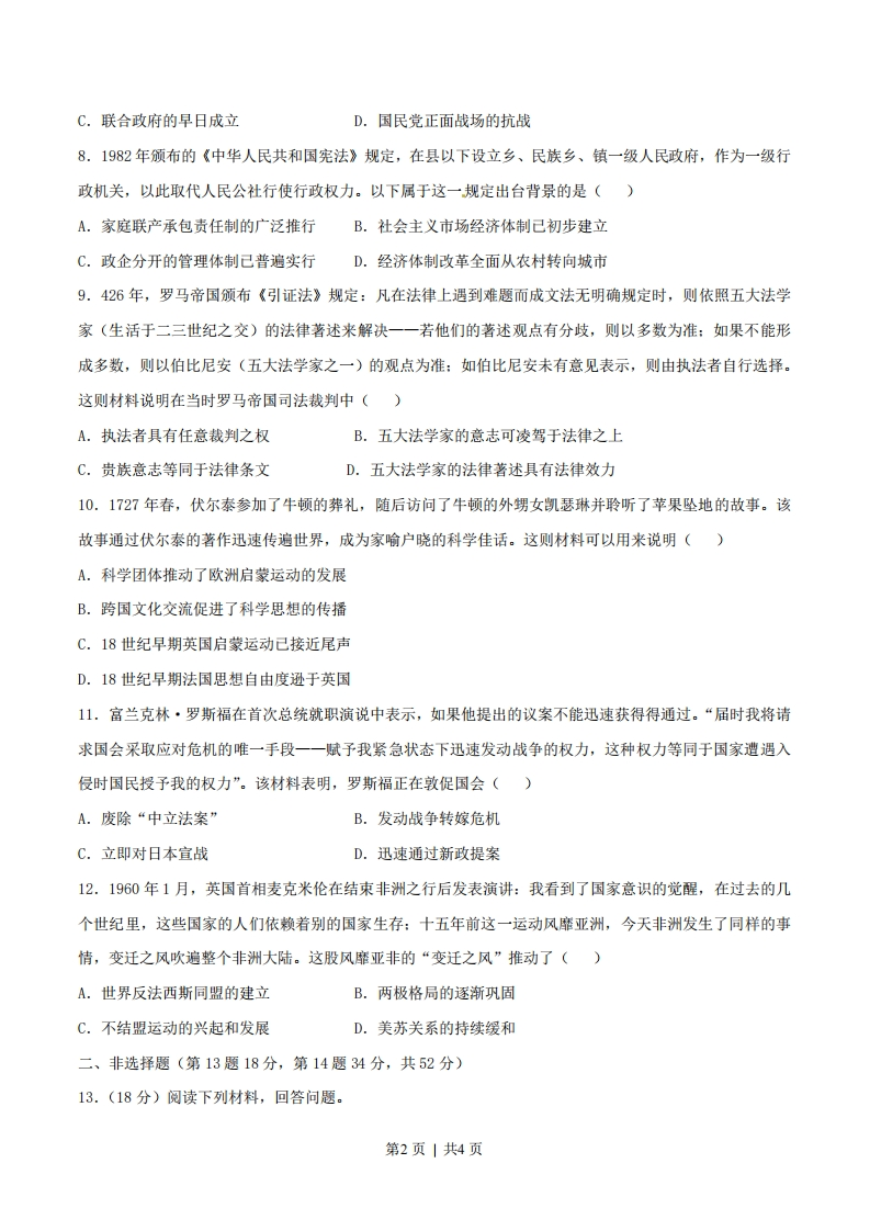2015年重庆高考文综历史解析(精编版)一、选择题(每题4分,共12题,48分)1.吴起在楚国实行变法,提出了“使私不害公,馋不蔽忠,言不取苟合,行不取苟容,行义不顾毁誉”的主张。此主张旨在()A.废除世卿世禄制B.整顿官场风气C.削弱王室的特权D.废除分封制2.安史之乱(755~763)是唐朝由盛而衰的转折点,有位诗人在这场战乱中写了一首诗:“今夜廊州月,闺中只独看。遥怜小儿女,未解忆长安。”写出了千古以来战争中妻离子散的悲哀。这位诗人应该是()A.杜牧B.孟浩然C.杜甫D.白居易3.宋太宗时期,有官员上奏:“岭南村墟聚落,间日集裨贩(小贩),谓之墟市。请降条约,令于城邑交易。”该建议遭到太宗的拒绝:“徙扰民尔,可仍其旧。”这一史实主要反映了宋朝()A.专业市场每天开市B.乡村市场的繁荣C.市场监管相对宽松D.坊市制继续实行4.《金史》记载:“赞曰:章宗在位二十年,承世宗治平日久,宇内小康,乃正礼乐,修刑法,定官制,典章文物粲然成一代法规…亦可谓有志于治者矣.”这表明金章宗()A.完善了金朝典章制度B.开始推行内阁制度C.治国理政不如金世宗D.照搬金世宗时的律令5.明朝抗倭名将戚继光主张:“操兵之道,不独执旗走阵于场肆,而后谓之操:虽闲居坐睡嬉戏,亦操也…兵虽静处闾阁(街巷),然亦谓之操,乃真操也。”可见戚继光更强调士兵的()A.队形操练B.武艺训练C.阵法演练D.习惯养成6.太平天国运动之初,曾国藩指出:“今春既交,粤盗益复猖獗,西尽泗镇,东侵平梧,二千里中,几无一尺净土。推寻本原,何尝不以有司虐用其民,鱼肉日久,激而不复反顾?盖太吏之泄泄(闲缺)于上,而一切废置不问者非一朝夕之故矣。”据此可知,曾国藩认为太天平天国运动爆发的原因是()A.自然灾害频仍B.社会治安混乱C.土地兼并严重D.官吏贪暴腐败7.“抗日救国,己成为每个同胞的神圣天职。只要国民党停止进攻苏区行动,只要任何部队实行对日抗战…红军不仅立刻对之停止对敌行为,而且愿意与之亲密携手共同救国。”中国共产党发表这一宣言促进了()A.国民革命运动的兴起B.抗日救亡运动的新高涨第1页|共4页