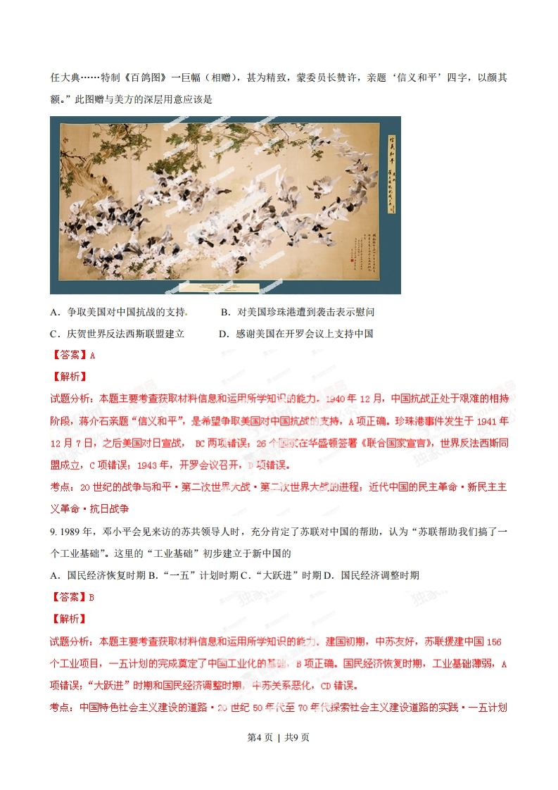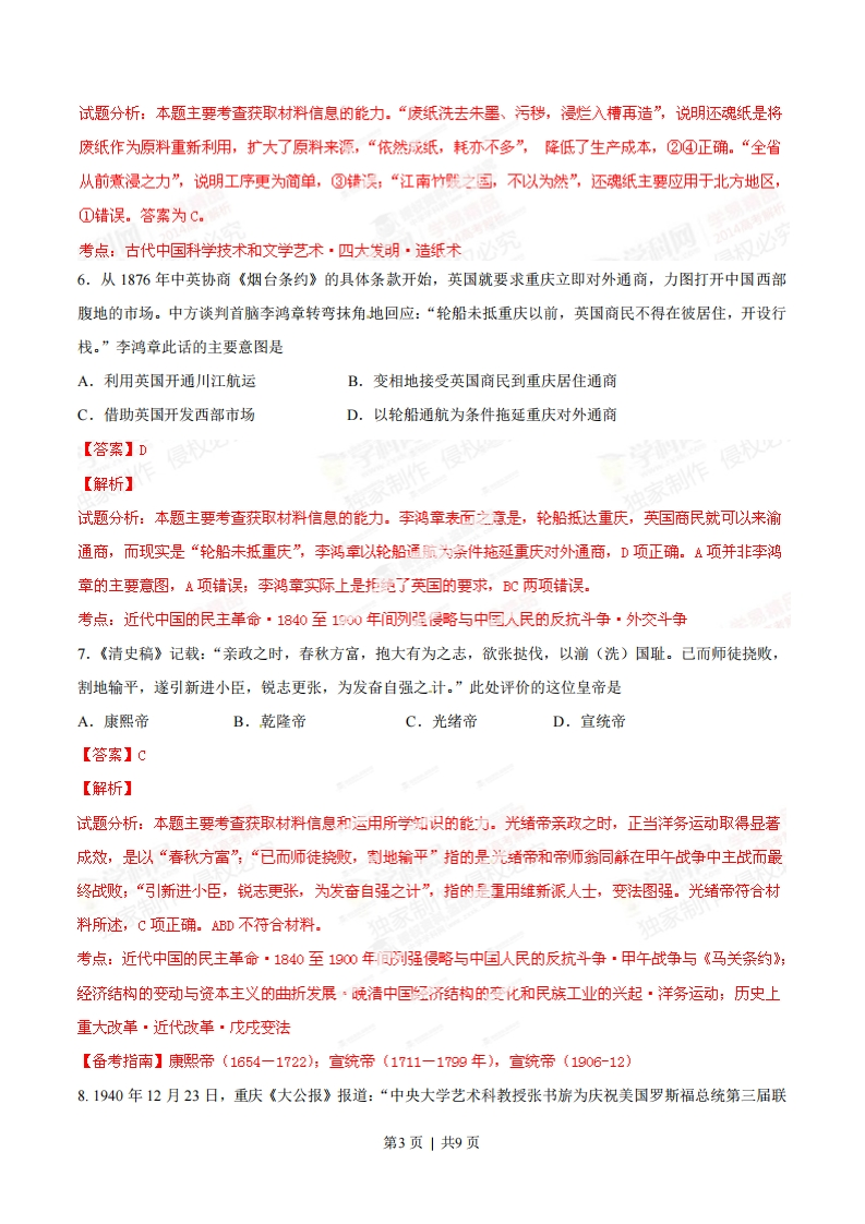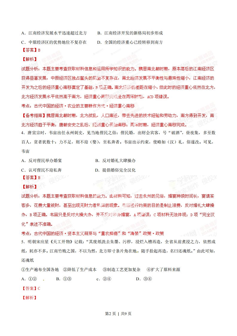 2014年普通高等学校招生全国统一考试(重庆卷)文科综合历史部分试题一、选择题(本大题共12小题,每小题4分,共48分)在每小题给出的四个备选项中,只有一项是最符合题目要求的。1.中国古代的一部作品,以神游天地、上下求索的幻想境界表达了作者对理想的执着追求,大量运用“美人芳草”的比兴手法和瑰丽的语言,闪耀着南方楚文化的奇丽色彩。该作品是A.《诗经》B.《老子》C.《庄子》D.《离强》【答案】D【解析】试题分析:本题主要考查获取材料信息和运用所学知识的能力。战国时期,楚国诗人屈原以南方民歌为基础,创作了一种新的诗歌体裁一一楚辞。楚采用楚国方言,句式灵活,易于表达情感。屈原的抒情长诗《离骚》想象奇特,具有浪漫主义风格,是楚醉的表作,D项正确。《诗经》富有现实主义色彩,A项错误;《老子》、《庄子》都带有浪漫主义色彩,但不能反映南方的楚文化,C错误。考点:古代中国的科学技术与文学艺术·文学成就·楚辞2.汉武帝时张骞出使西域,远至今中亚阿姆河流域,受到渴望与汉通使往来的大宛等国的欢迎。其间,汉设置河西四郡,打通了与西域的直接交通。张骞在出使过程中所获得的信息对打开丝绸之路和建立中国与西方的联系起到了关键作用。据此可知,张骞出使西域的功绩是A.开辟了沟通中西的丝绸之路B.建立了汉朝与西方的联系C.确立了汉朝对西域的管辖权D.开启了中国与中亚的交往【答案】D【解析】试题分析:本题主要考查获取材料信息的能力。材科中大宛等国都属于中亚,据材料可知,张署出使西域的功绩在于开启了中国与中亚的交往,“所获得的信息对打开丝绸之路和建立中国与西方的联系起到了关键作用”,说明了张骞所获得信息的重要性,但并不意味看直接开辟了沟通中西的丝绸之路和建立西汉与西方的联系,AB错误;汉宣帝时,设置了西域都炉府,确立了汉朝对西域的管辖权,C项无法体现。考点:古代中国的政治制度·汉到元政治制度的演变·张悬通西域3.战国秦汉时期,北方一直是全国的经济重心,但是到了魏晋南北朝时期,中原经济区独占鳌头的局面不复存在了,原本落后的江南经济区获得了显著发展,使长期以来的南北经济发展不平衡性与悬殊性缩小了。这说明魏晋南北朝时期第1页|共9页
