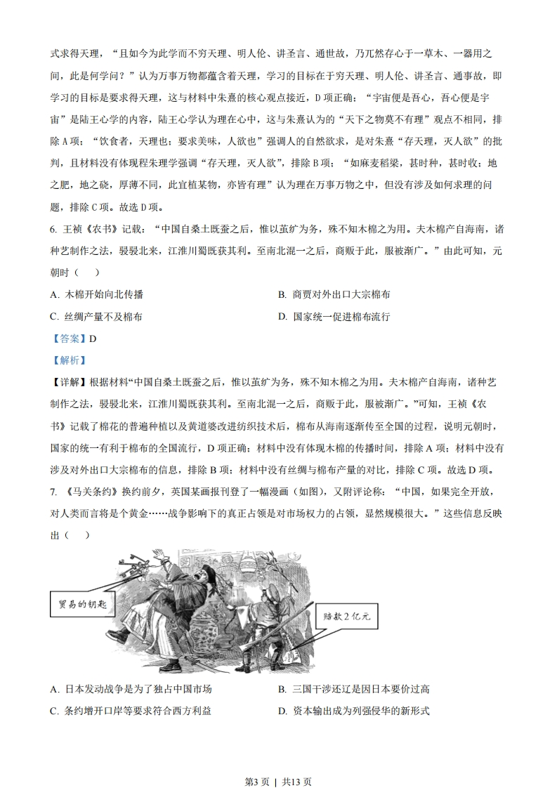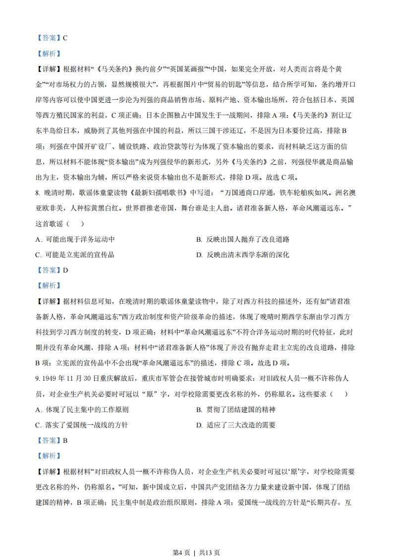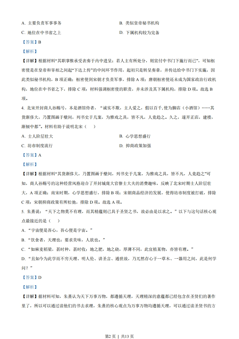 2022年重庆市普通高中学业水平等级性考试历史试题一、选择题1.有学者指出,“德”的观念至少在西周己经产生,它既是一种个人的品德,又与天命有关。春秋时期,“德”的神秘意味开始减弱,更强调人的品德和理性,如文献记载:“鬼神非人实亲,惟德是依。”推崇文献中这一观点的先秦思想流派是()A.墨家B.兵家C.儒家D.法家【答案】C【解析】【详解】材料中文献观点“鬼神非人实亲,惟德是依。”的意思是鬼神不是随便亲近某人的,而是依从有德行的人。结合所学,春秋战国时期儒学产生并发展,儒学“崇德”,主张用道德去感化教育人,主张“为政以德“德治”等等,所以推崇文献中这一观点的先秦思想流派是儒学,C项正确:墨家主张兼爱、非攻等,其主张与文献观点不太一致,排除A项:兵家内容主要是战争和治兵经验、战略战术等,与文献观点不太一致,排除B项:法家最大的特点是主张严刑峻法,与文献观点不太一致,排除D项。故选C项。+q30760678741442562.考古表明,战国至西汉初期,蜀地墓葬中蜀文化因素占主要地位,墓葬形式以船棺葬、狭长形土坑墓为主,随葬品也极具蜀地特征:至西汉中期,具有汉文化特色的长方形竖穴木椁墓成为主要墓葬形式,随葬品也有明显的关中特色。这反映出西汉中期()A蜀地墓葬出现平民化趋势B.蜀文化逐渐融入到汉文化中C.蜀地经济实力与关中相当D.蜀文化与关中文化交流有限【答案】B【解析】【详解】根据材料“战国至西汉初期,蜀地墓葬中蜀文化因素占主要地位,墓葬形式以船棺葬、狭长形土坑墓为主,随葬品也极具蜀地特征:至西汉中期,具有汉文化特色的长方形竖穴木椁墓成为主要墓葬形式,随葬品也有明显的关中特色。”可知,战国至西汉初期,蜀地墓葬中蜀文化因素占主要地位,至西汉中期,具有汉文化特色的长方形竖穴木椁墓成为主要墓葬形式,说明蜀文化受到汉文化的影响,并融入汉文化之中,B项正确:西汉中期,蜀文化融入汉文化之中,而非平民化趋势,排除A项:根据蜀地墓葬的变化,无法判定其经济实力状况,排除C项:两地文化的融合,说明文化交流密切,而非有限,排除D项。故选B项。3.唐代宗始设枢密使,“初不置司局,但有屋三楹,贮文书而己。其职掌惟承受表奏于内中进呈:若人主有所处分,则宣付中书门下施行而己”。据此可知,当时的枢密使()第1页」共13页