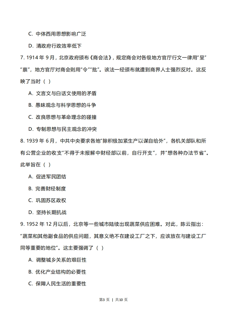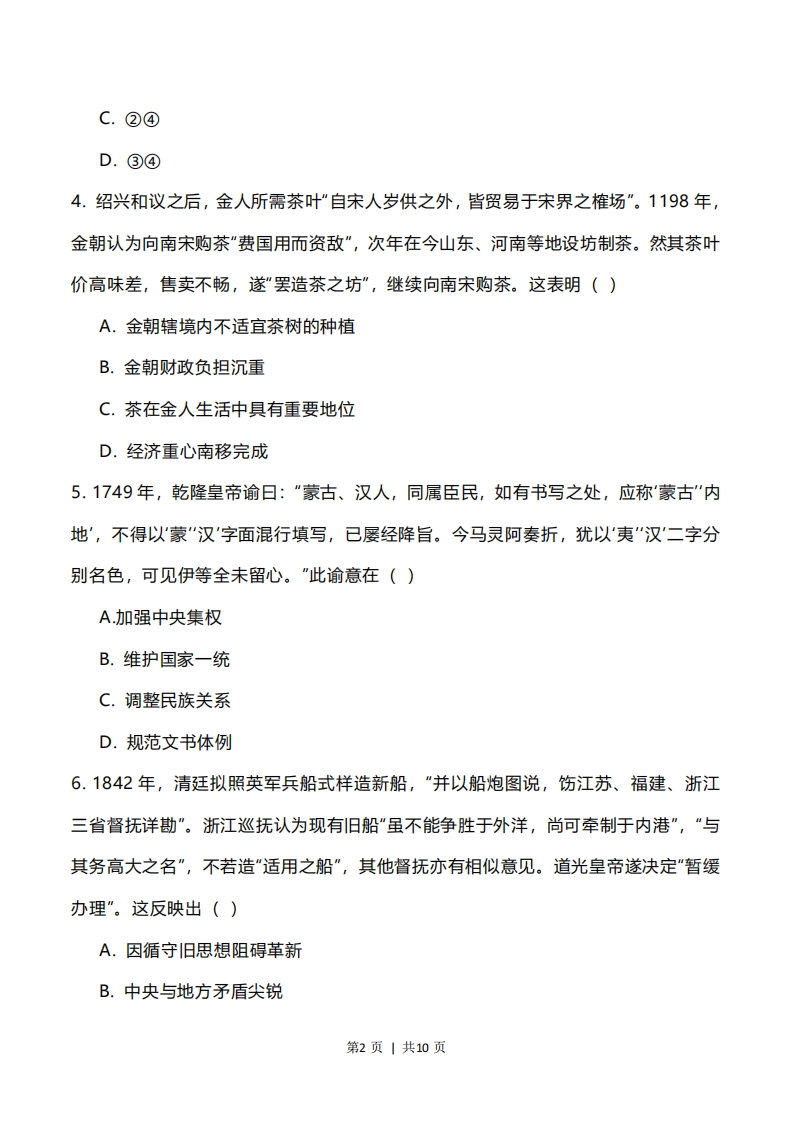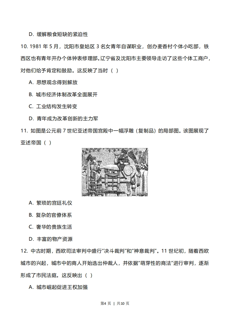 2023年辽宁省普通高等学校招生选择性考试历史试题一、选择题1.1955年,在今辽宁省朝阳市喀左县出土一批西周青铜器,其中一件盂造型雅致、纹饰精美,刻有”匽侯”等文字。“厦侯”即为“燕侯”,是周初分封的诸侯,封地在蓟。这反映了()A.青铜器的普遍使用B.燕文化影响到辽西地区C.分封制的日趋完善D.诸侯祭祀礼仪活动频繁2.《史记》注最有影响是“三家注”,即南朝裴驷的《史记集解》、唐司马贞的《史记索隐》和唐张守节的《史记正义》。今有学者认为,除”三家注"外,还应有第四家注,即考古学家的注。该学者意在强调()A.《史记》具有真实性和文学性B.文献价值有赖于当代学者阐释C.文献必须得到出土文物的印证D.考古资料有助于探求历史真实3.唐代张彦远的《历代名画记》收录两汉及以前画家16人;收录魏晋南北朝时期画家128人,其中包括顾恺之、张僧繇等杰出画家。这一变化发生的原因有()①纸张的普遍使用②门阀士族的推动③北人的大量南迁④儒家思想的影响A.①②B.①③第1页|共10页