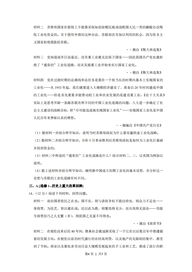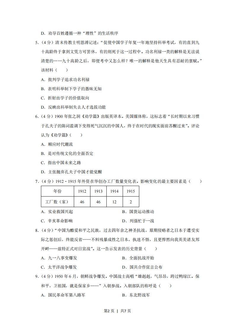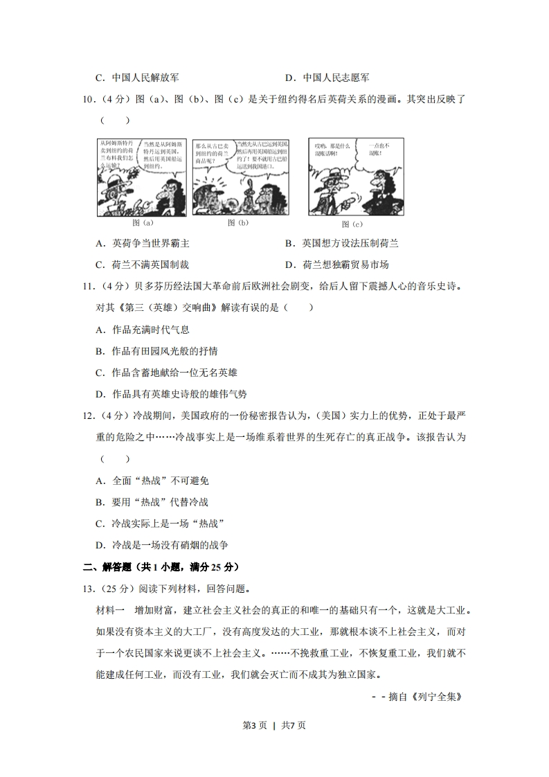 2013年福建省高考历史试卷一、选择题1.(4分)建安十三年(208年),曹操亲率大军号称80万屯兵江北,周瑜率兵数万布防江南,大战(如图)一触即发。时值隆冬季节,北风呼啸。周瑜忧心仲忡,孔明密曰:“欲破曹公,宜用火攻:万事俱备,只欠东风。”这里“东风”指()赤壁之此标广国图例测州A.自西北吹向东南的风B.自东南吹向西北的风C.刘备统领的孙刘联军D.增援的船只及燃烧品2.(4分)《春秋繁露》曰:“大富则骄,大贫则忧…使富者足以示贵而不至于骄,贫者足以养生而不至于忧,以此为度而调均之,是以财不匮而上下相安,故易治也。”在此,董仲舒提出的治国理念是()A.上下相安利国益民B.强制去富以抑其骄C.竭力济贫以抚其忧D.劫富济贫以均贫富3.(4分)《唐六典》记:“工巧业作之子弟,一人工匠后,不得别入诸色”:《新唐书》载:“细镂之工,教以四年:车路、乐器之工,三年:平漫刀稍(长矛)之工,二年…教作者传家技。”这表明唐代工匠()①频繁更换工种②长期在官府作坊干活③职业是世袭的④是临时工人A.①②B.②③C.①③D.③④4.(4分)朱熹在《漳州劝农文》中说:“请诸父老,常为解说,使后生弟子,知所遵守,去恶从善,取是舍非,受惜体肤,保守家业”。在此,朱熹()A.教海后生弟子遵从“三纲五常”B.告诫乡亲去恶从善以“慎思明辨”C.灌输以农兴业思想以存“天理”第1页1共7页